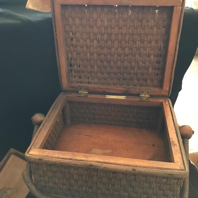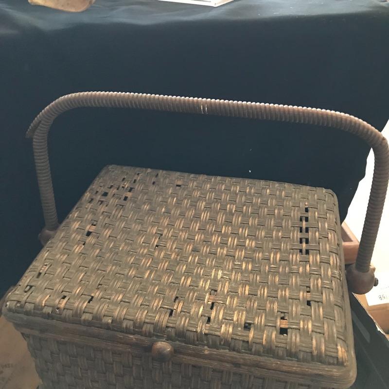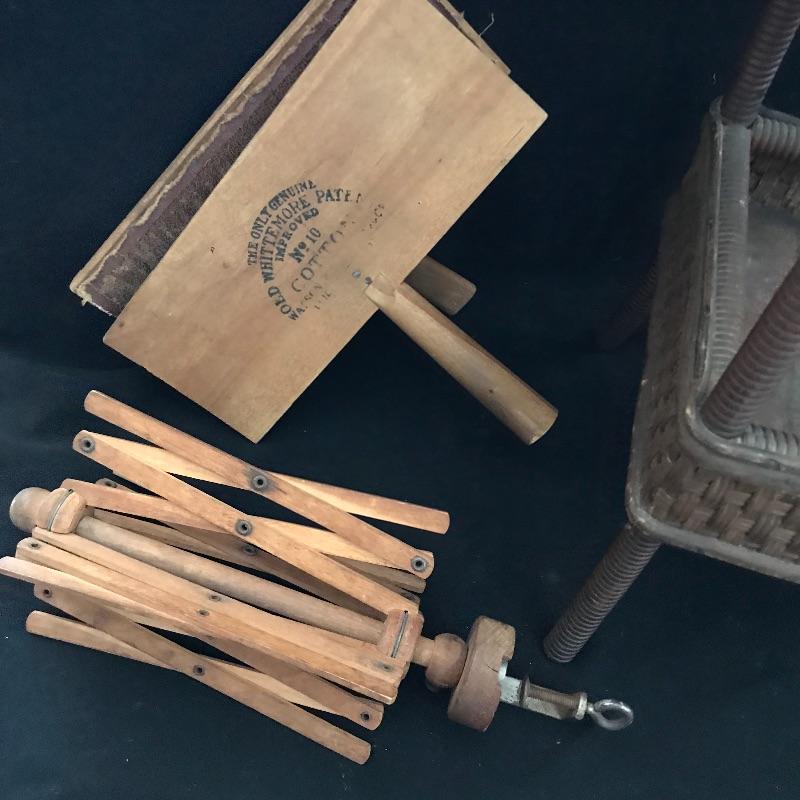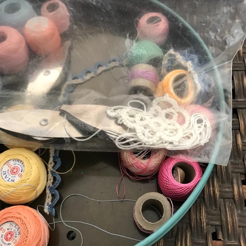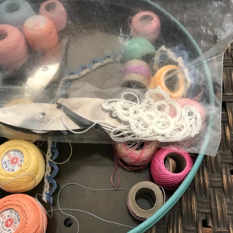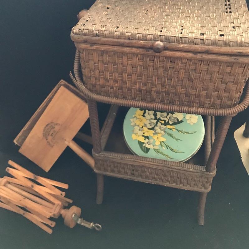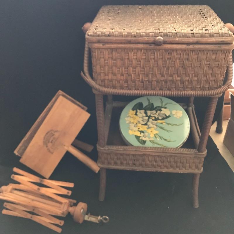 This useful, beautiful lot includes a vintage wicker sewing box (approx. 12” x 10” x 20”), hand carder for cotton or wool roving, an antique yarn ball winder, and turquoise floral tin containing tatting cotton and shuttles. See pics. Local pickup only.