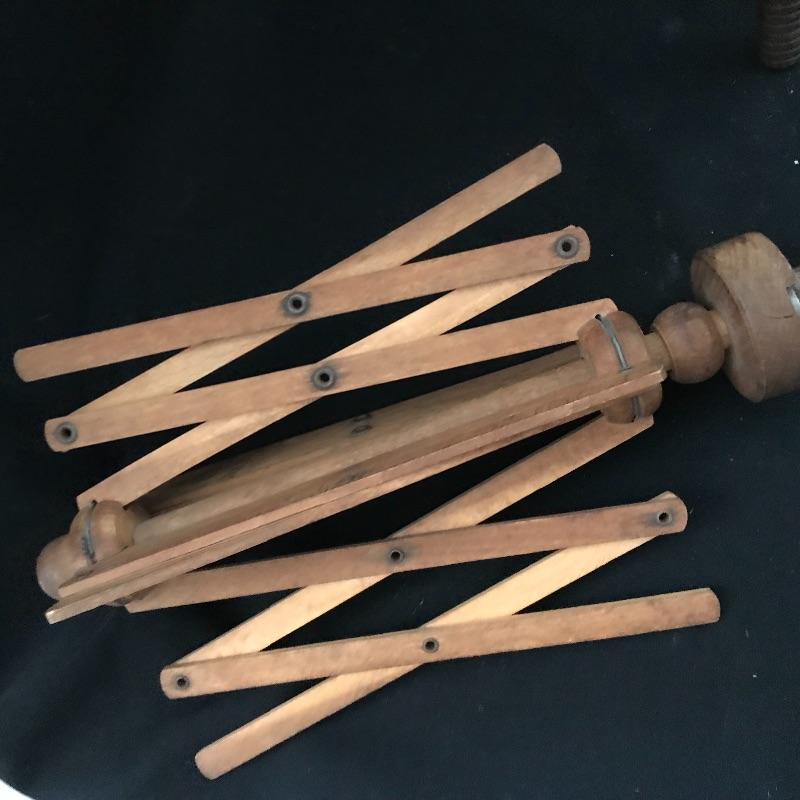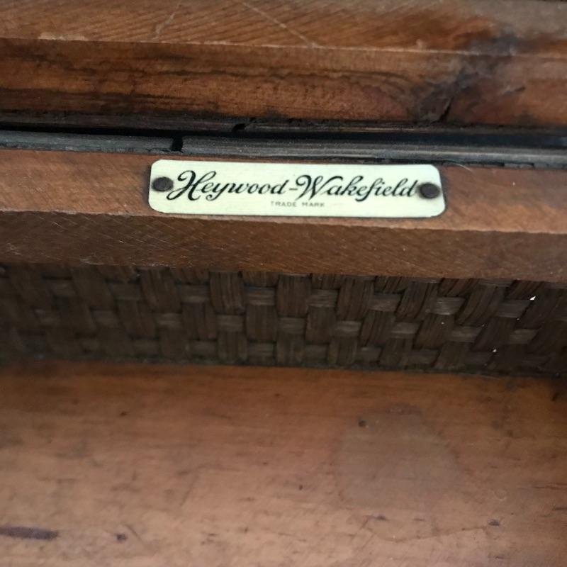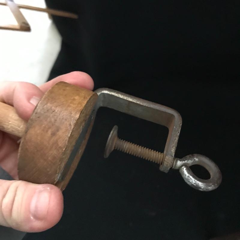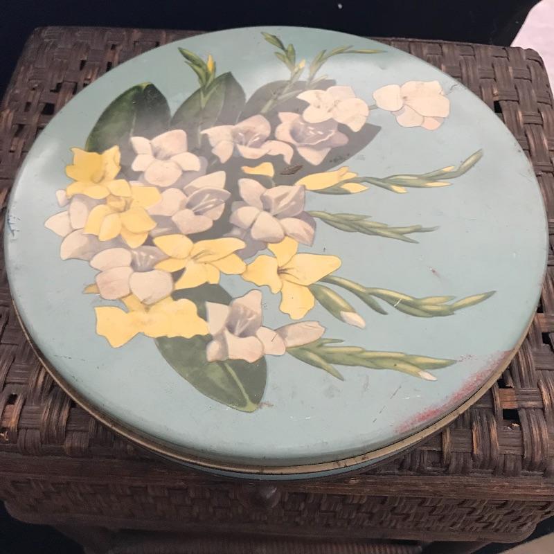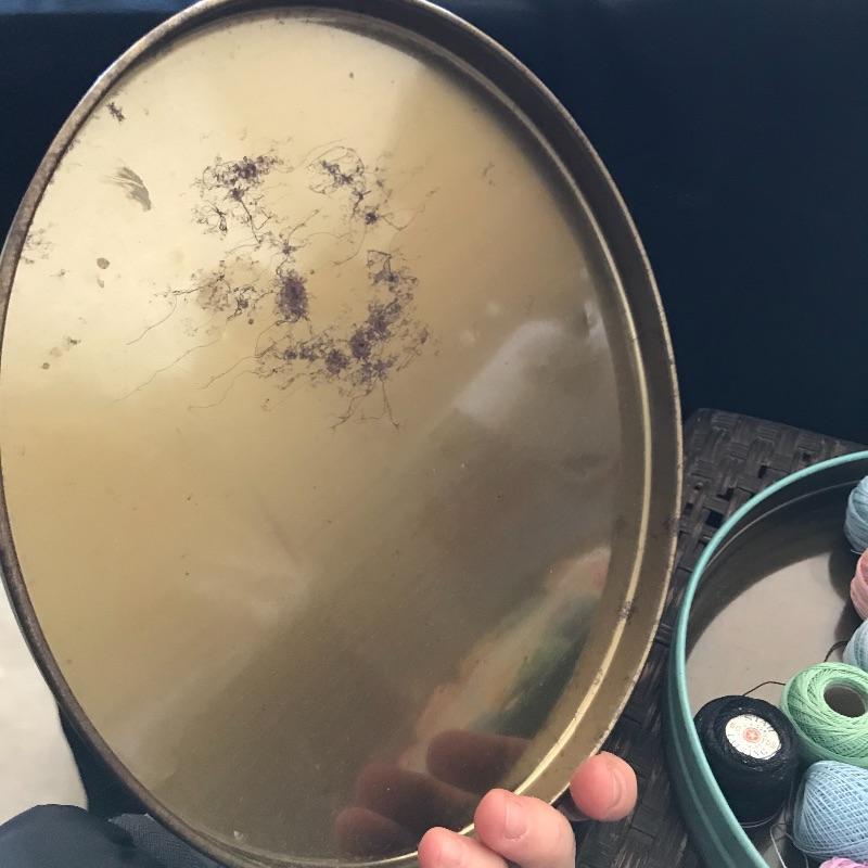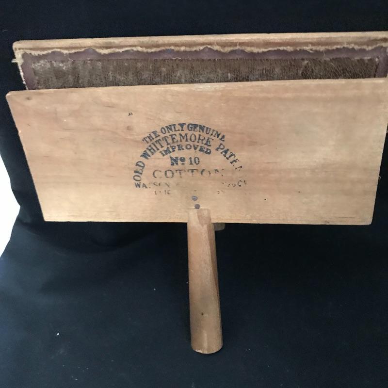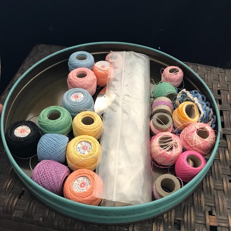 This useful, beautiful lot includes a vintage wicker sewing box (approx. 12” x 10” x 20”), hand carder for cotton or wool roving, an antique yarn ball winder, and turquoise floral tin containing tatting cotton and shuttles. See pics. Local pickup only.