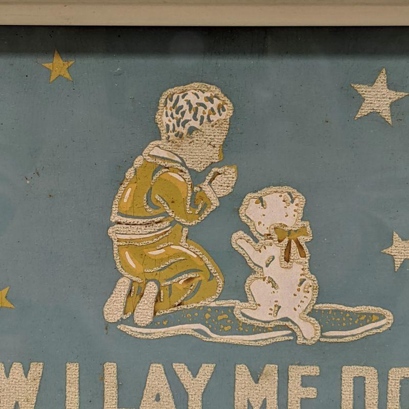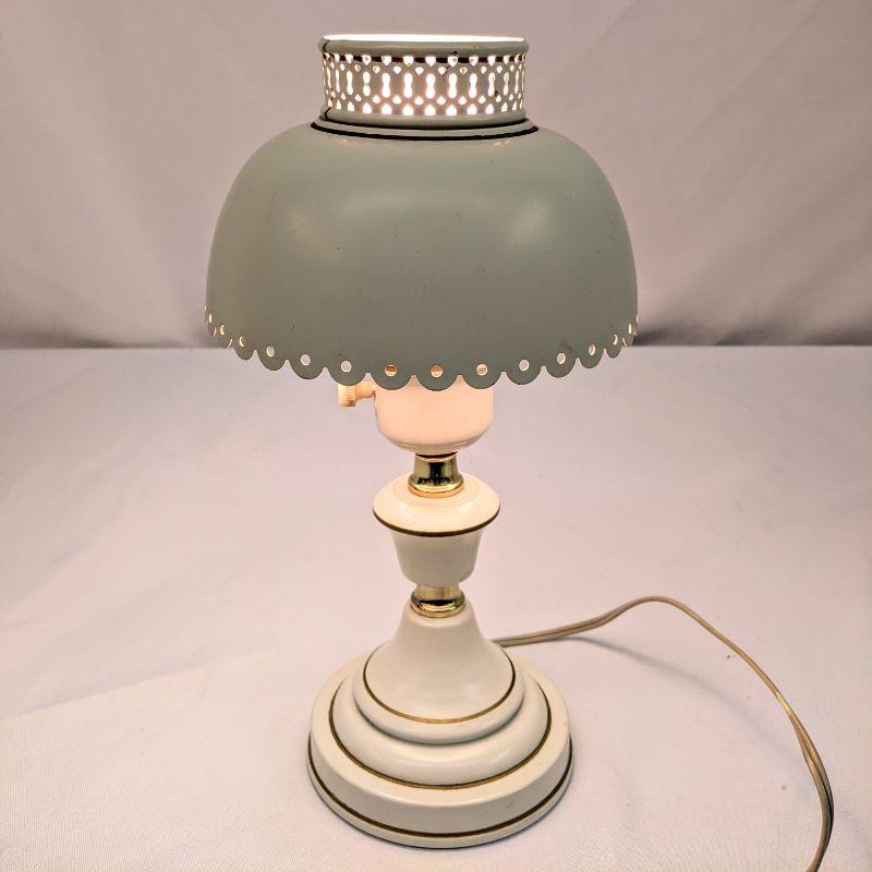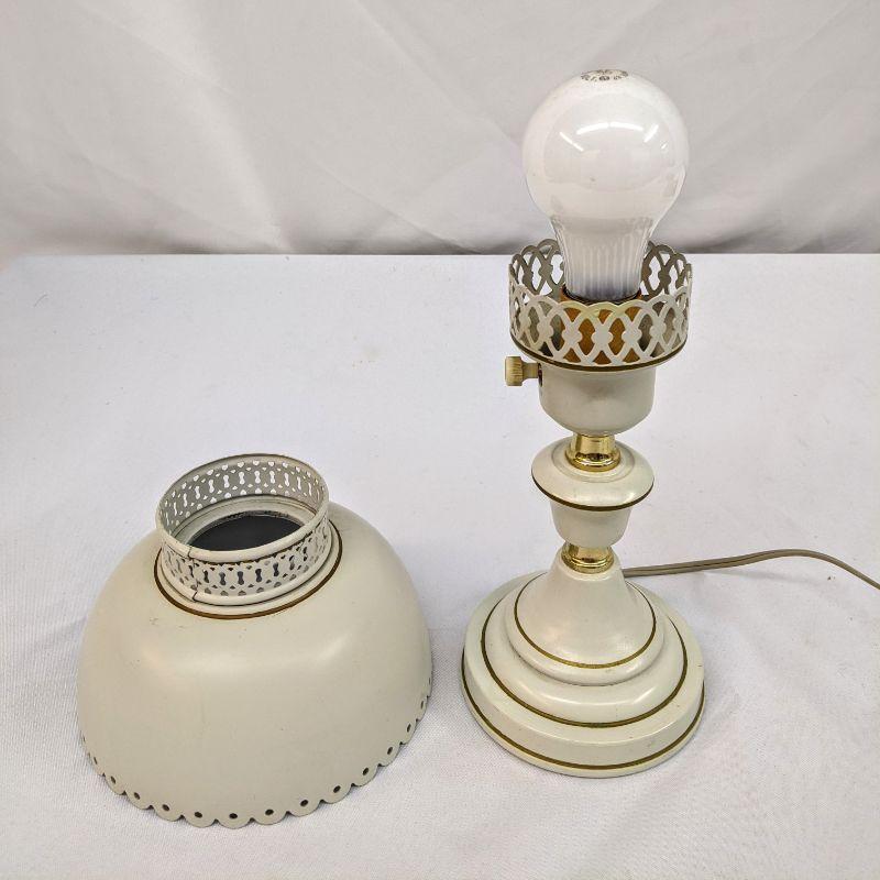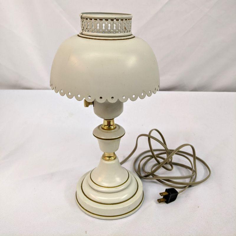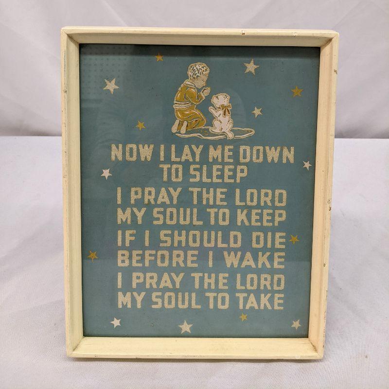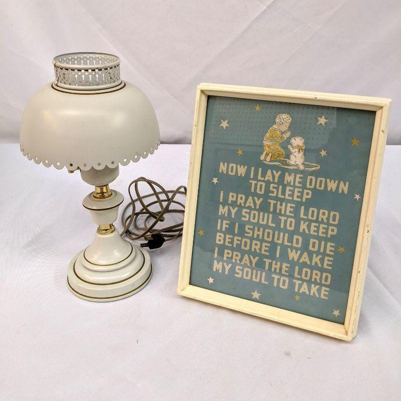 The lot includes a precious vintage lamp with a single bulb. The lamp is made of metal and painted white with gold trim. It is in great condition and works. The framed prayer has a vintage feel to it and would be perfect in a child's bedroom. The two pieces go well together.