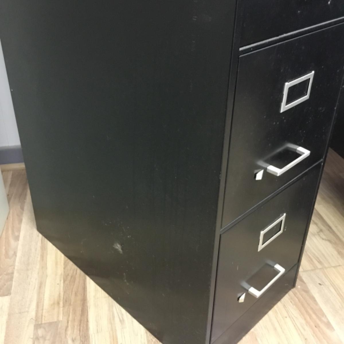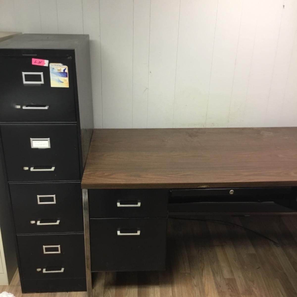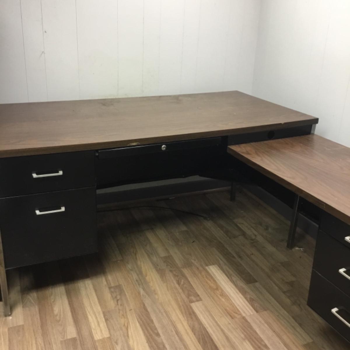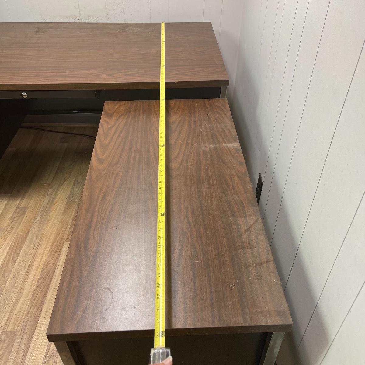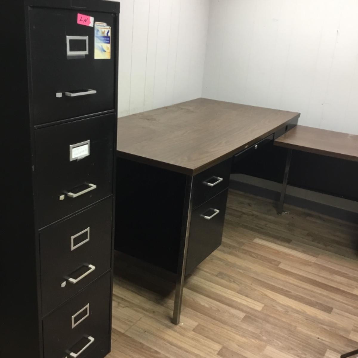 Corner desk with a wooden top and metal base paired with a black metal filing cabinet. The overall dimensions of the desk are 60 inches from side to side, 69.75 inches from the back to the longest point (pictured), and 29 inches tall. The cabinet is 14.75in x 26.5in x 51.5in. The smaller desk is screwed into the larger part (see pics).