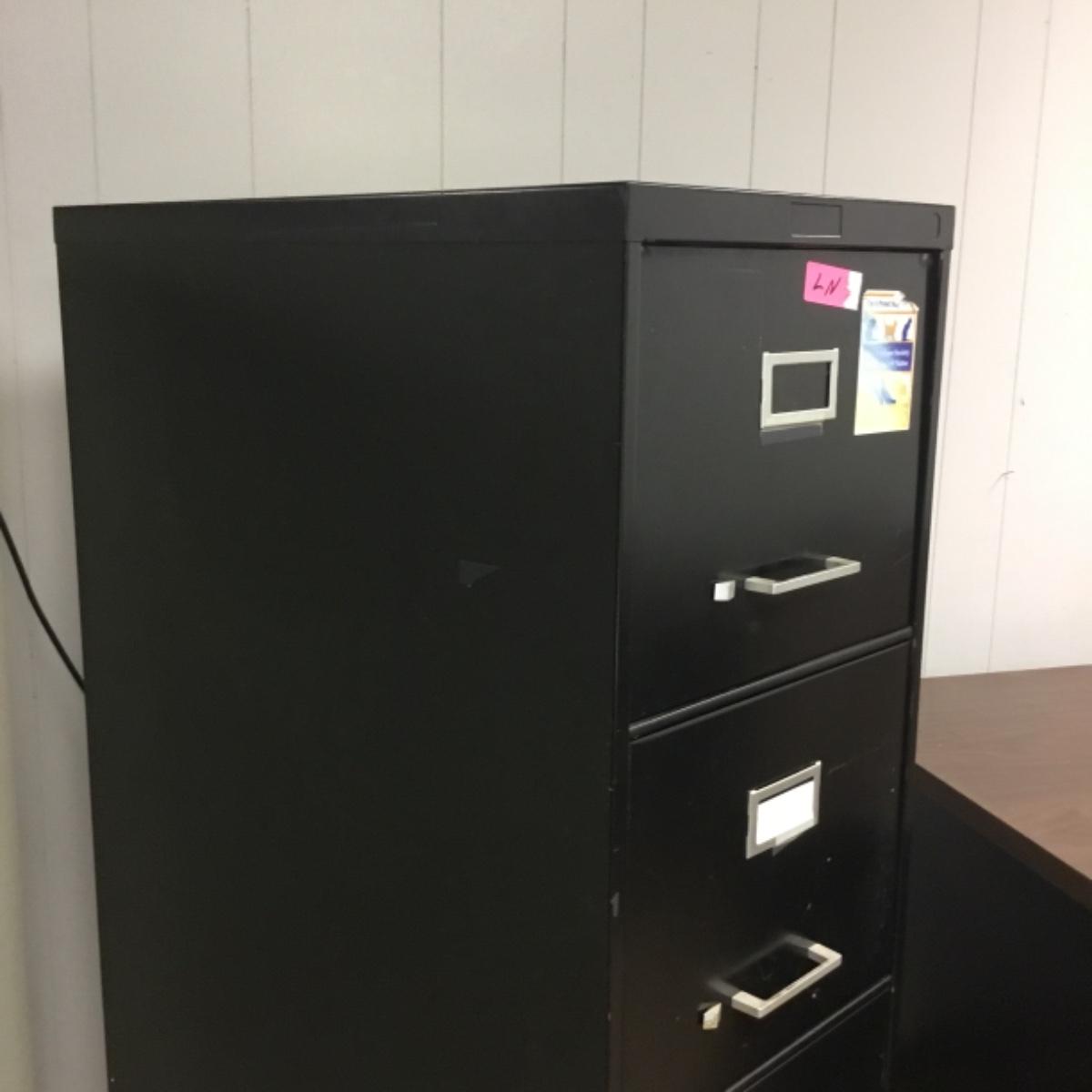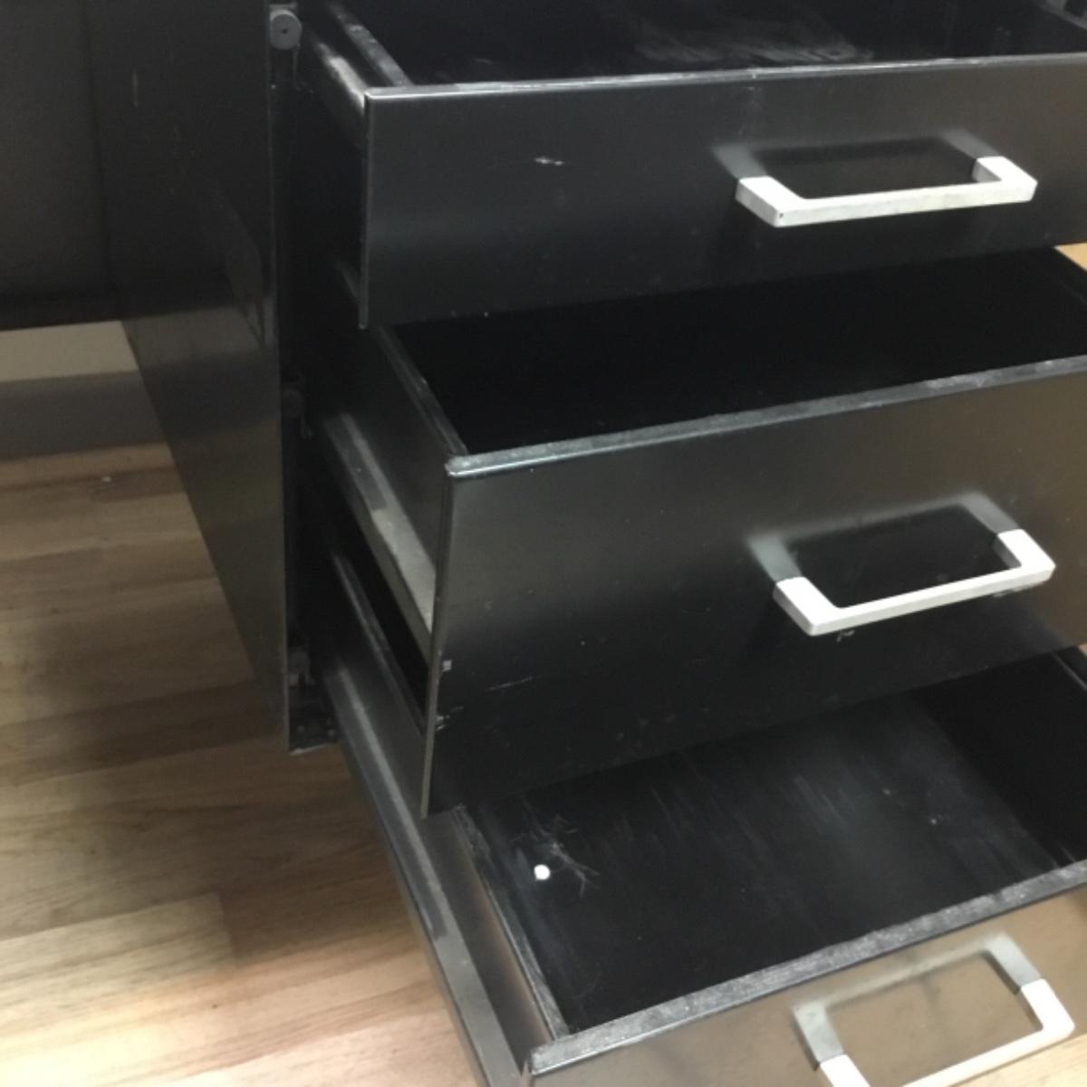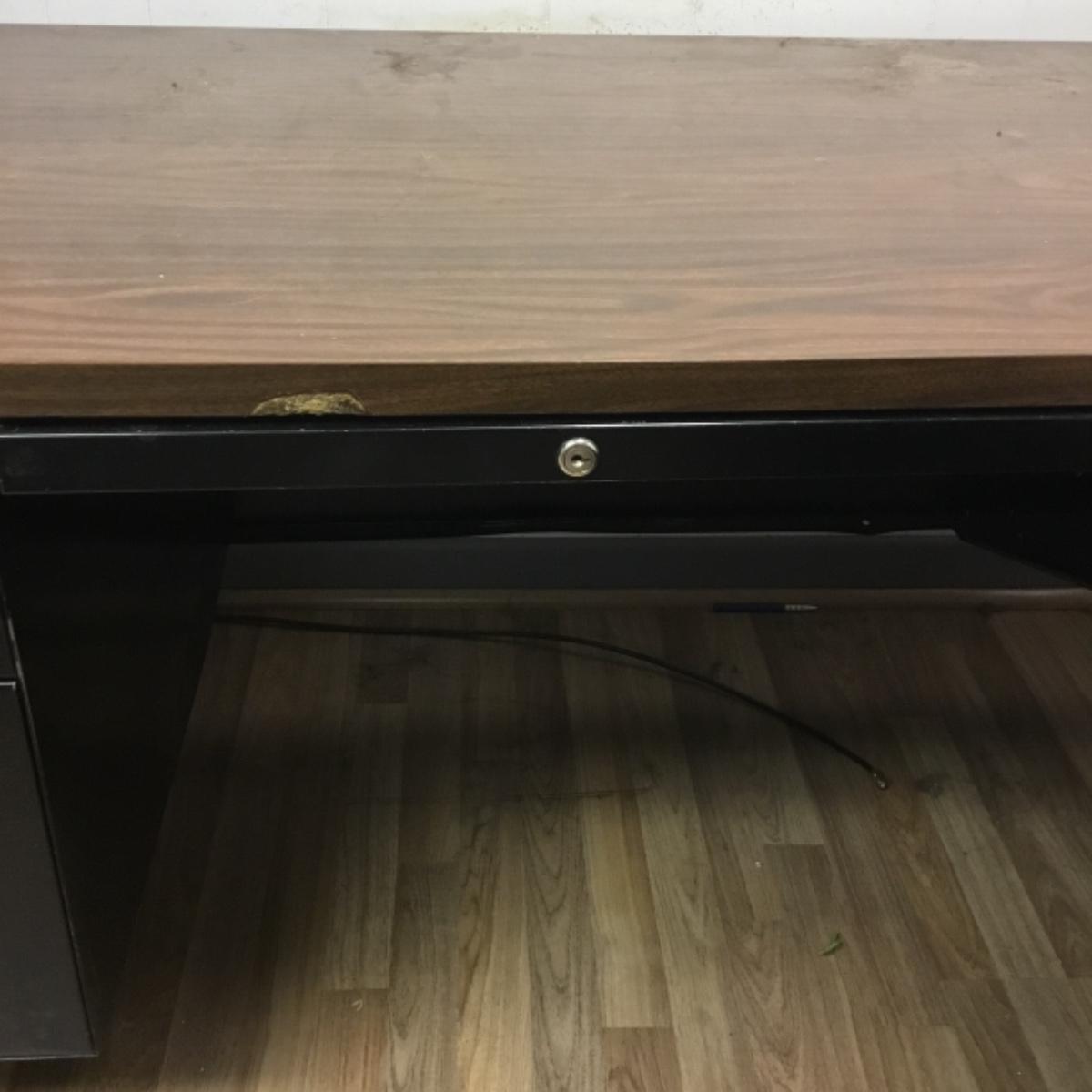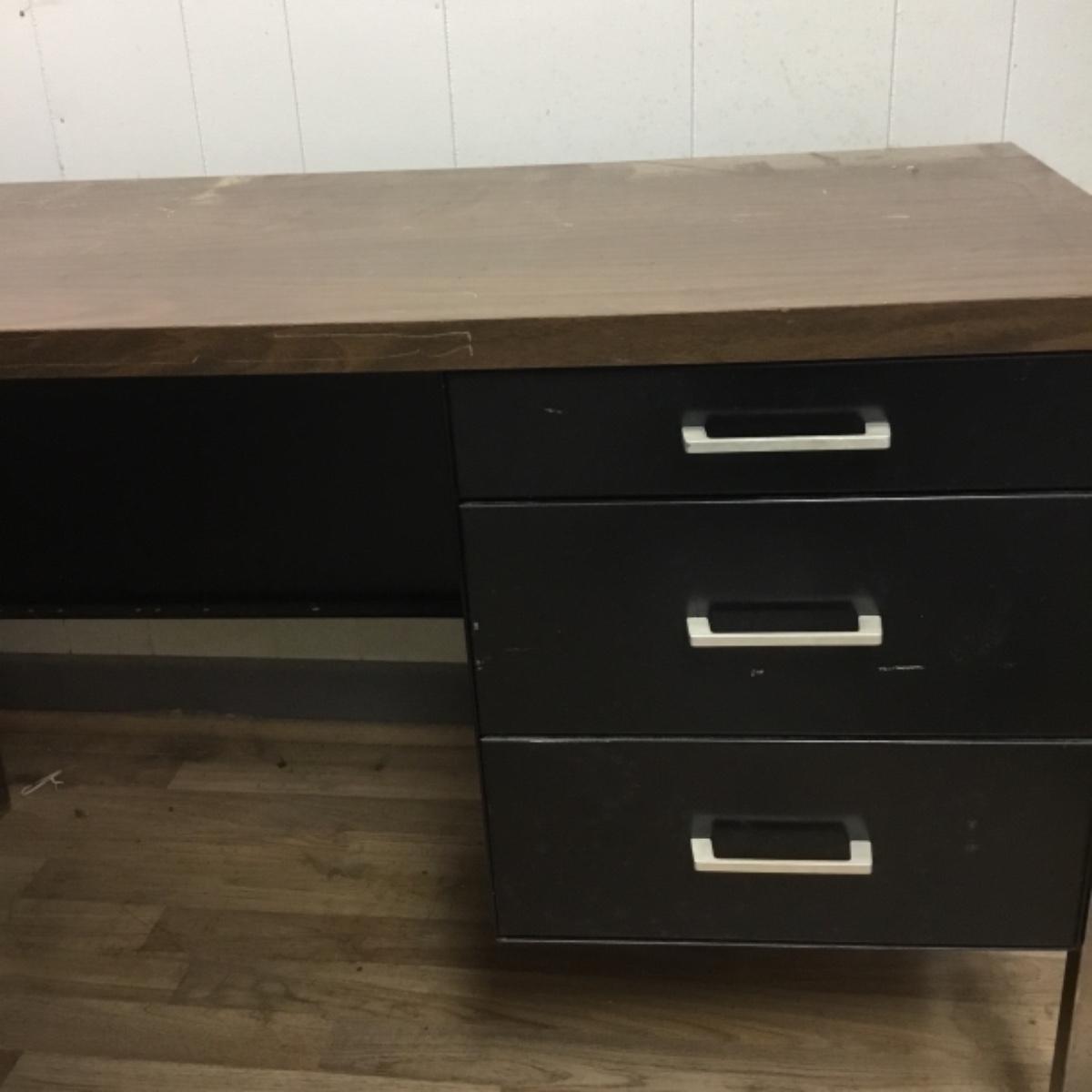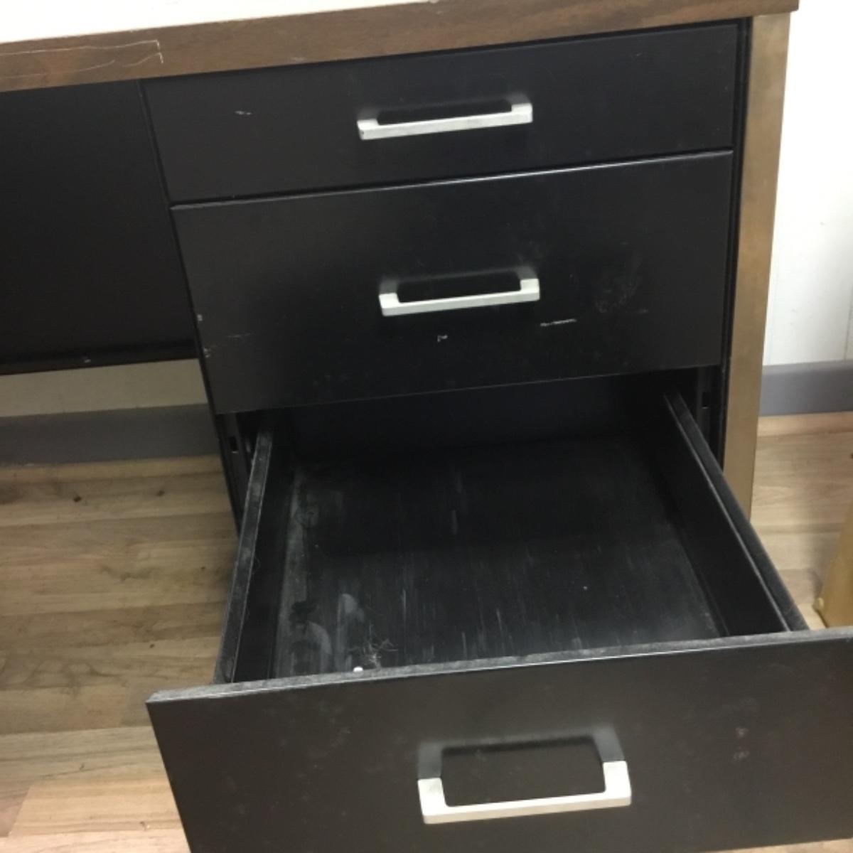 Corner desk with a wooden top and metal base paired with a black metal filing cabinet. The overall dimensions of the desk are 60 inches from side to side, 69.75 inches from the back to the longest point (pictured), and 29 inches tall. The cabinet is 14.75in x 26.5in x 51.5in. The smaller desk is screwed into the larger part (see pics).