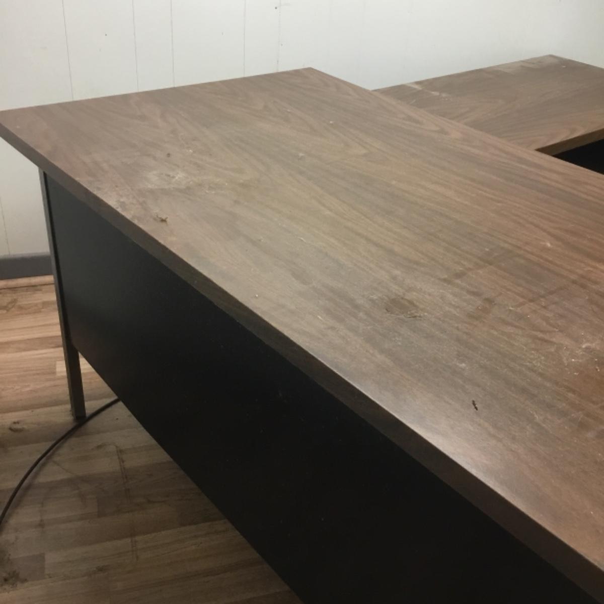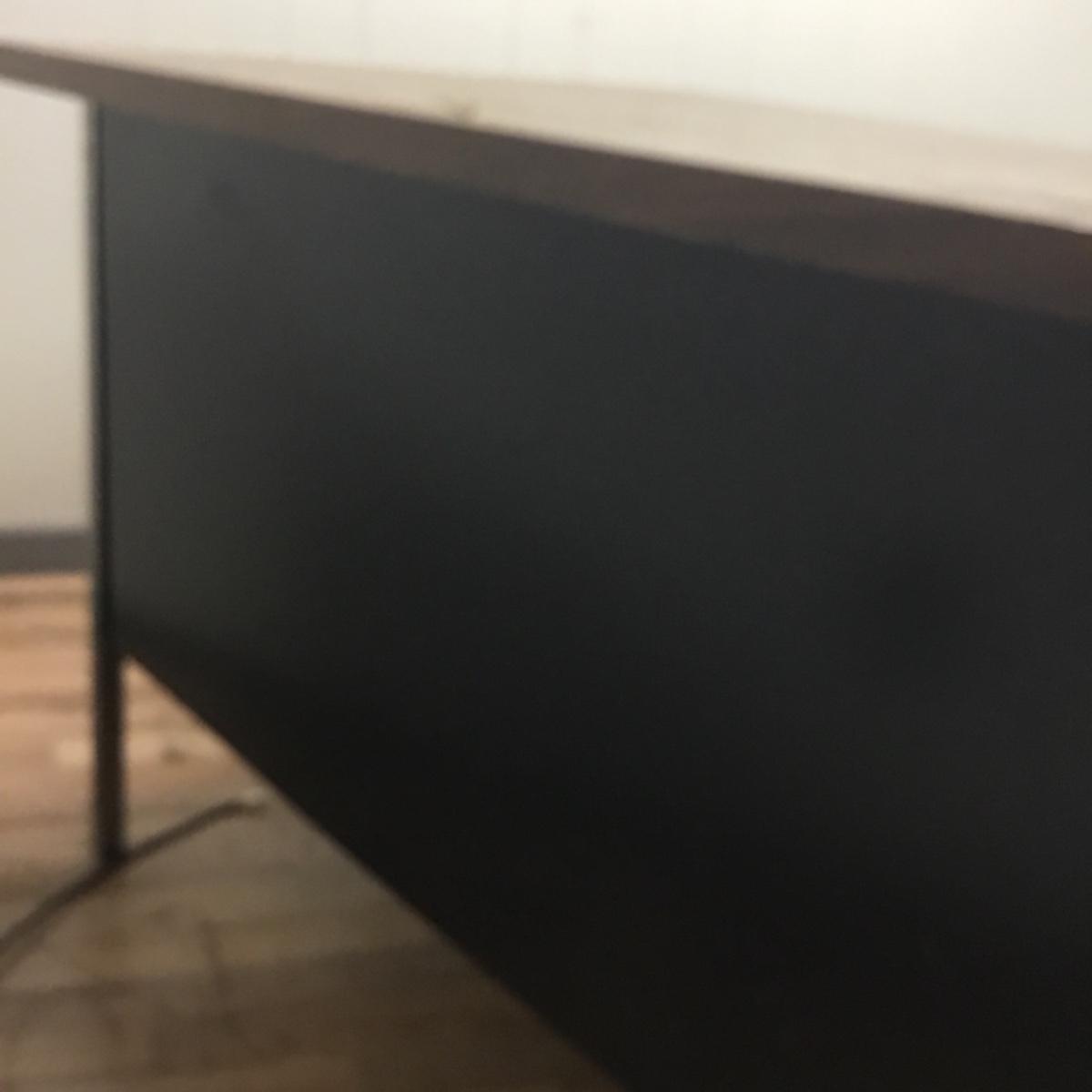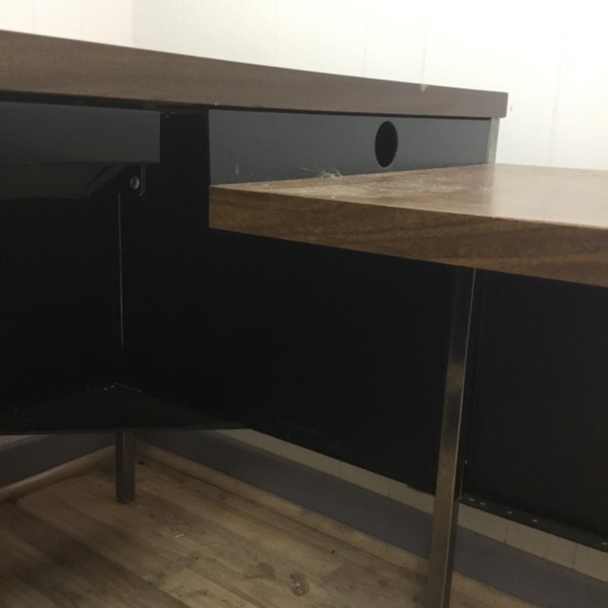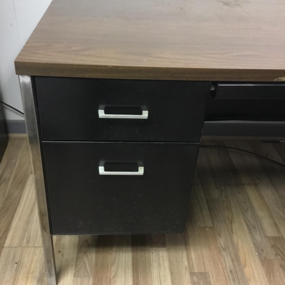 Corner desk with a wooden top and metal base paired with a black metal filing cabinet. The overall dimensions of the desk are 60 inches from side to side, 69.75 inches from the back to the longest point (pictured), and 29 inches tall. The cabinet is 14.75in x 26.5in x 51.5in. The smaller desk is screwed into the larger part (see pics).
