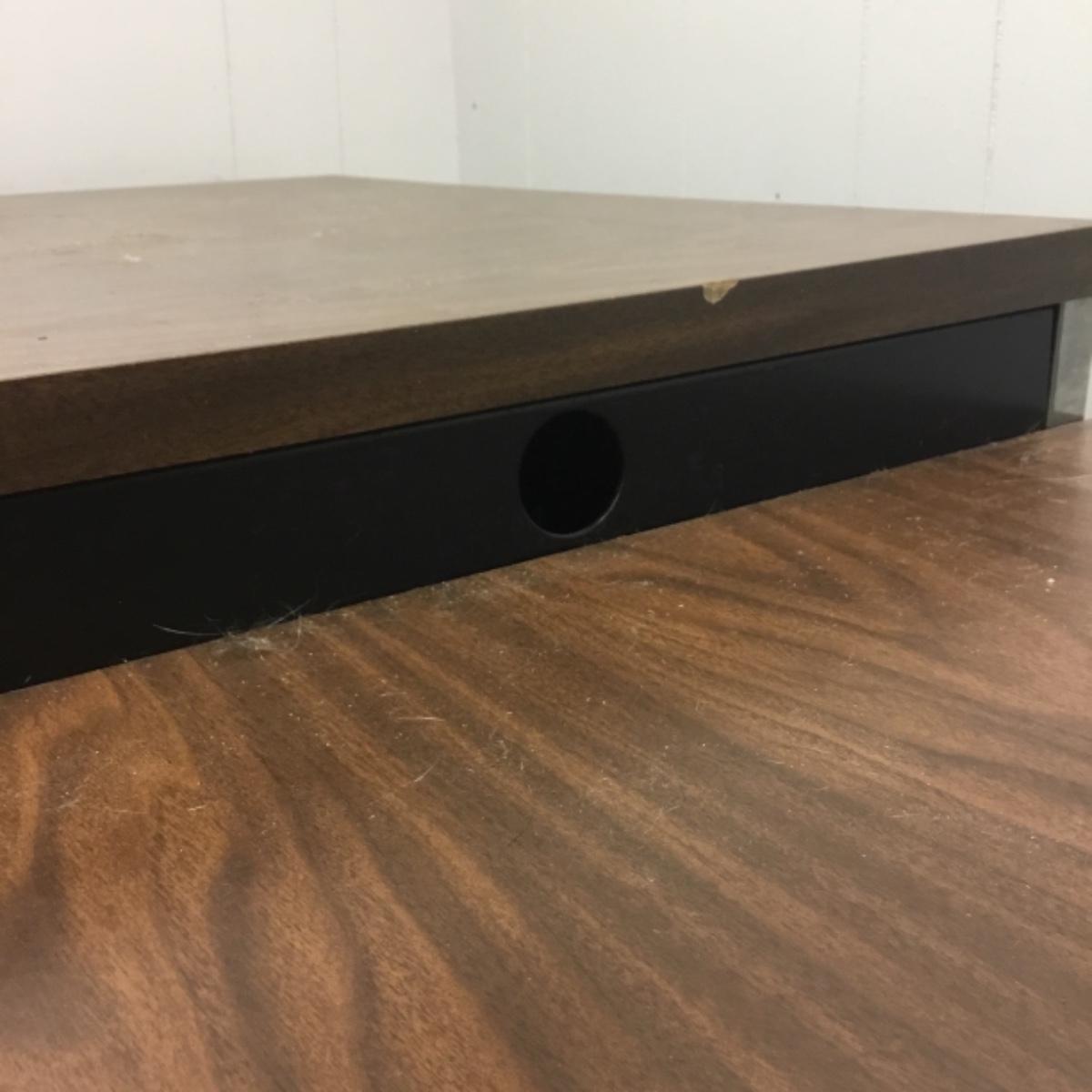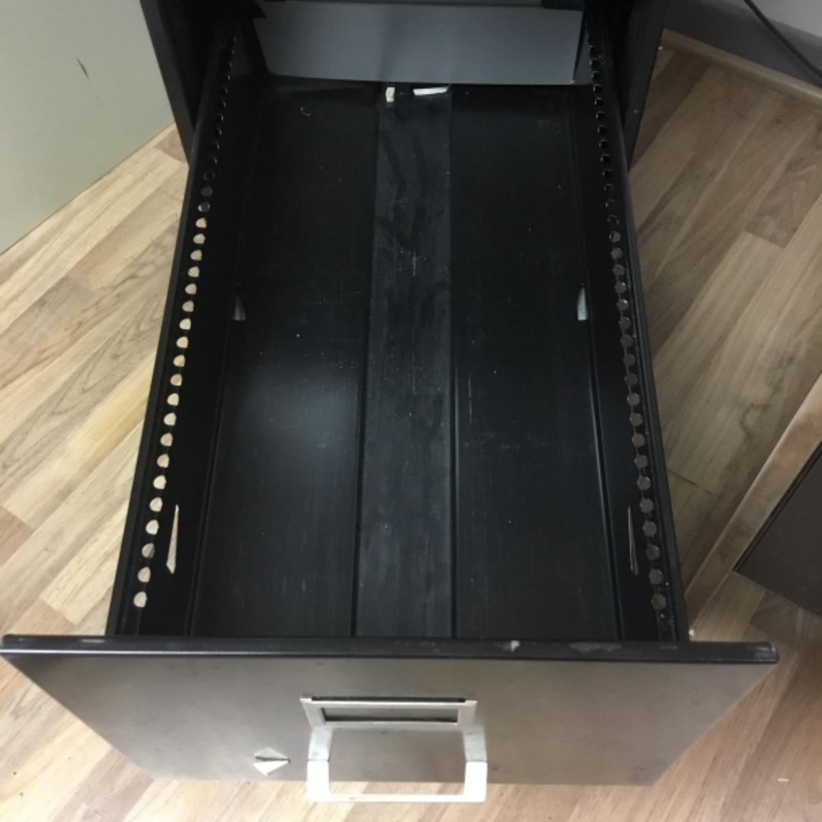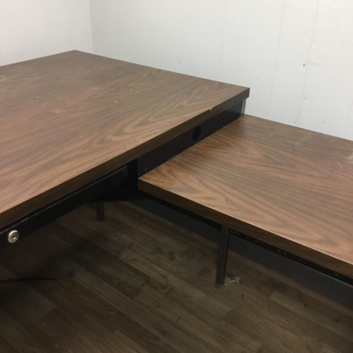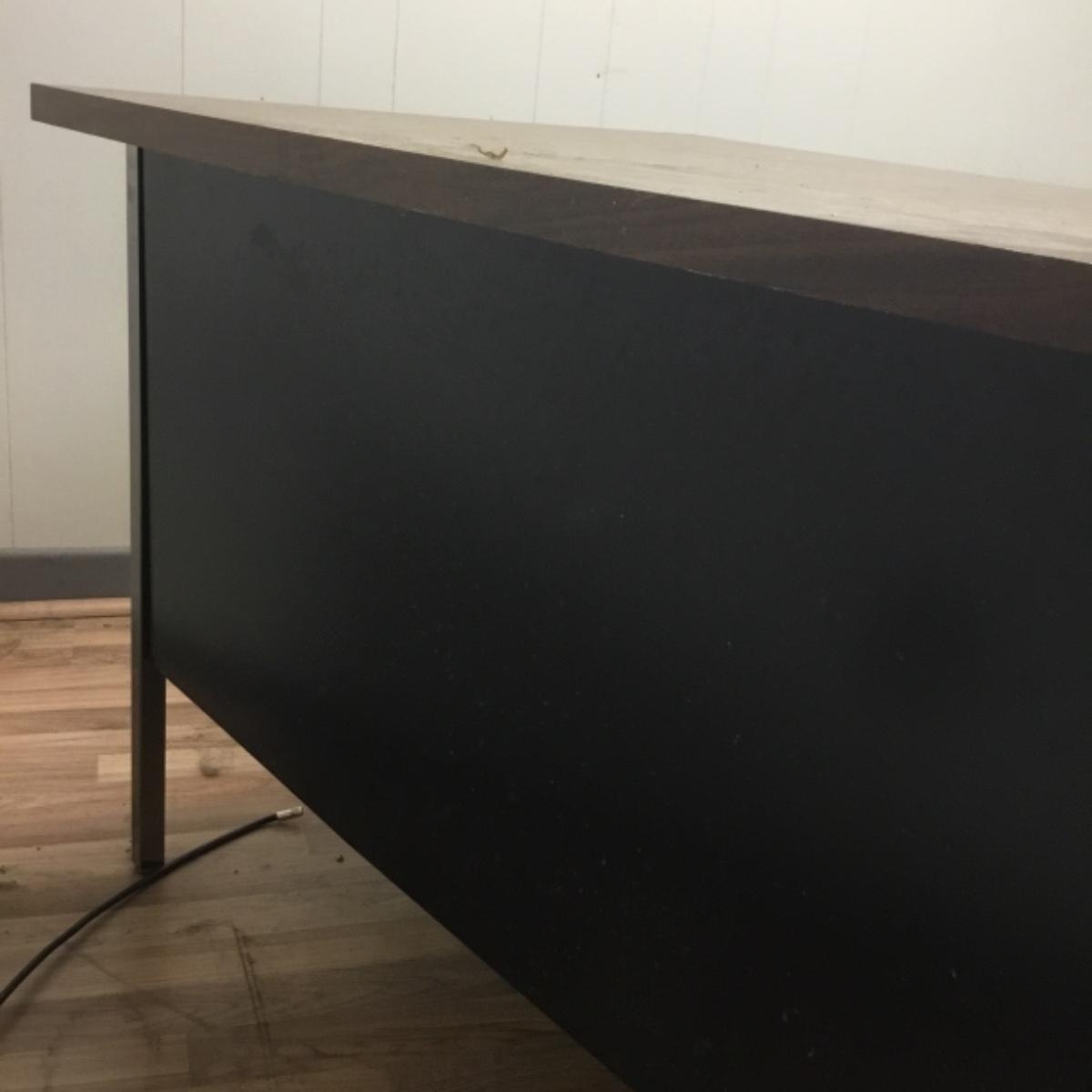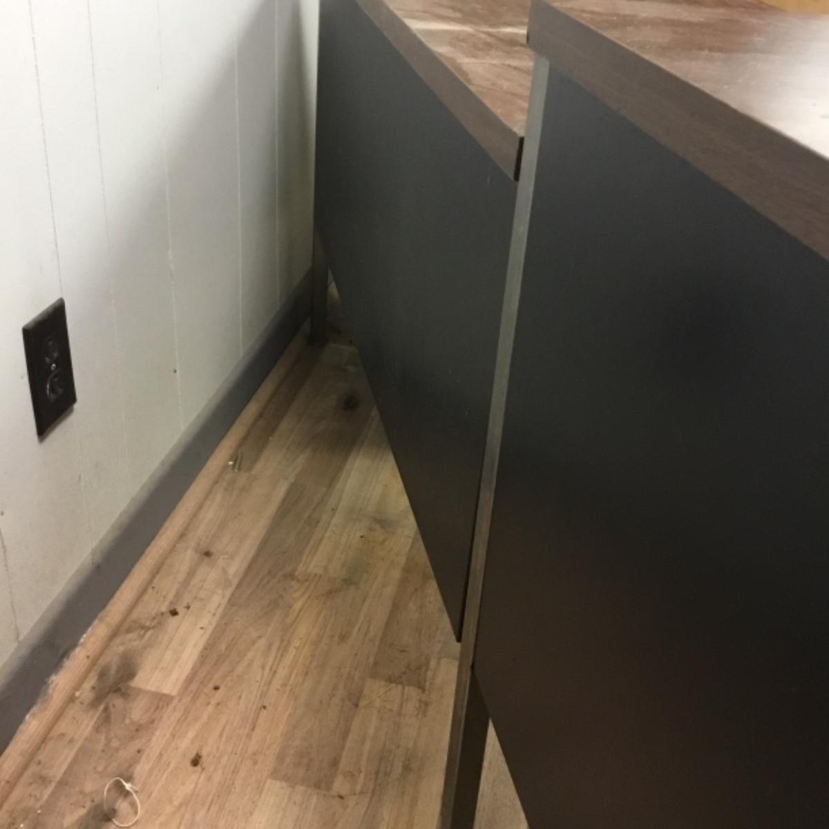 Corner desk with a wooden top and metal base paired with a black metal filing cabinet. The overall dimensions of the desk are 60 inches from side to side, 69.75 inches from the back to the longest point (pictured), and 29 inches tall. The cabinet is 14.75in x 26.5in x 51.5in. The smaller desk is screwed into the larger part (see pics).