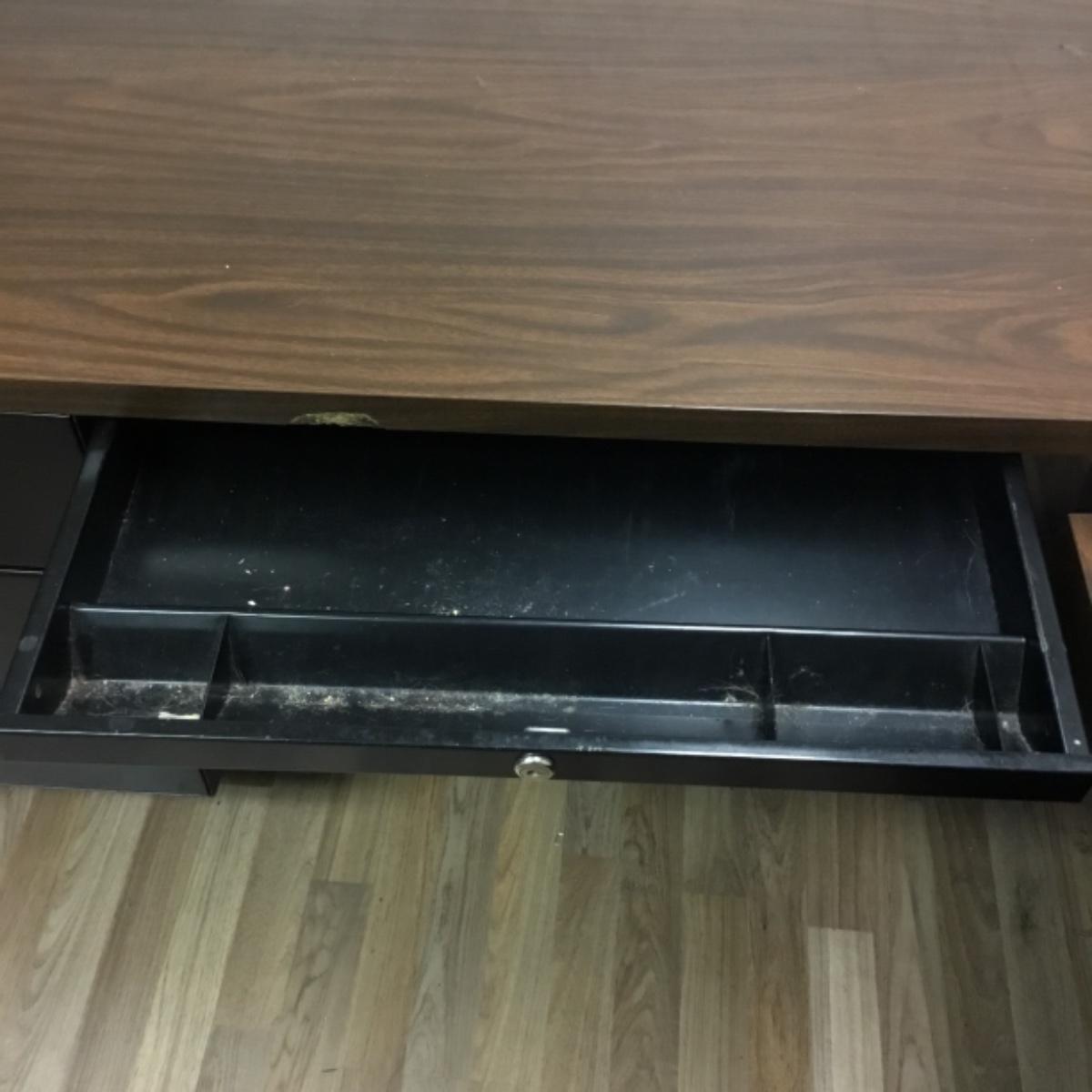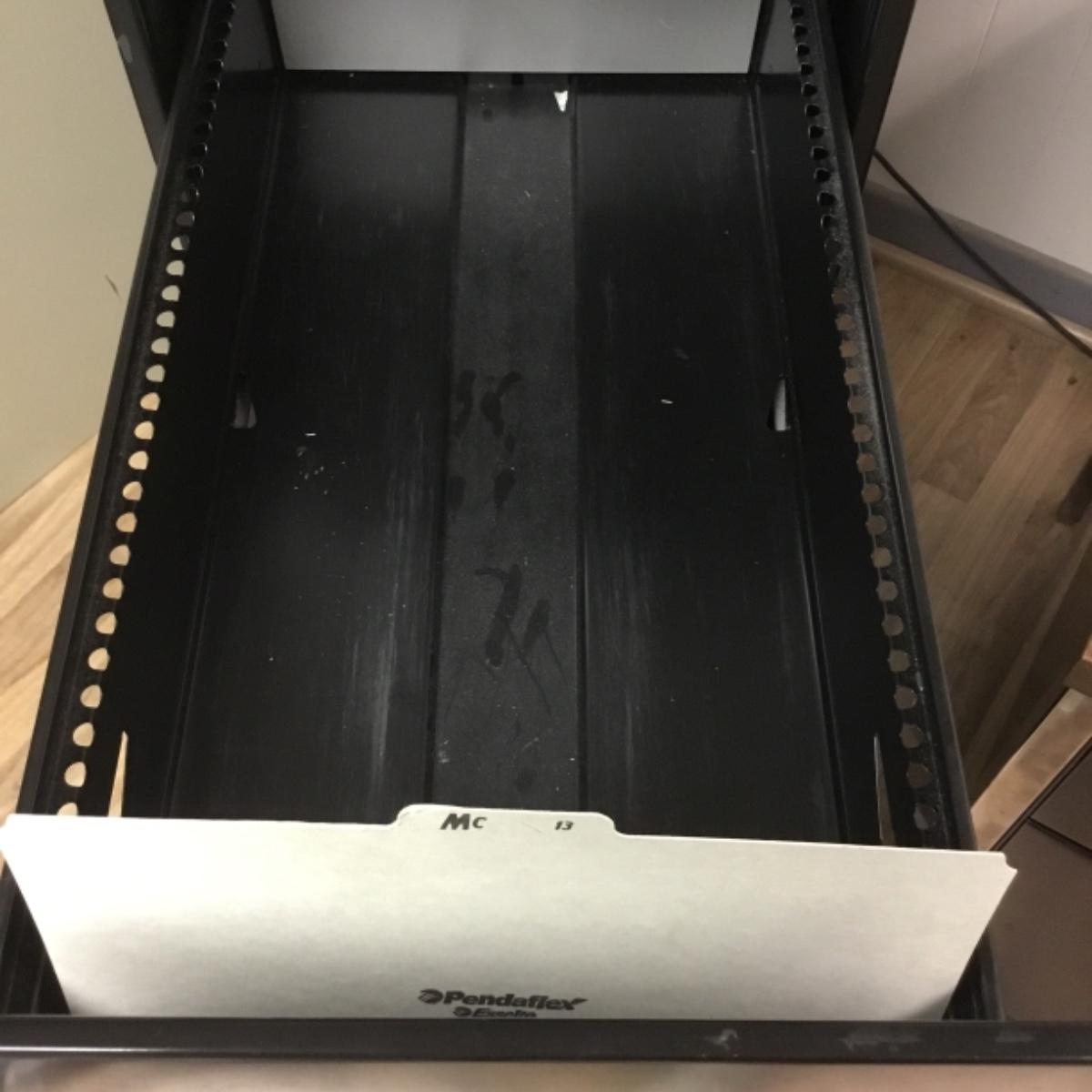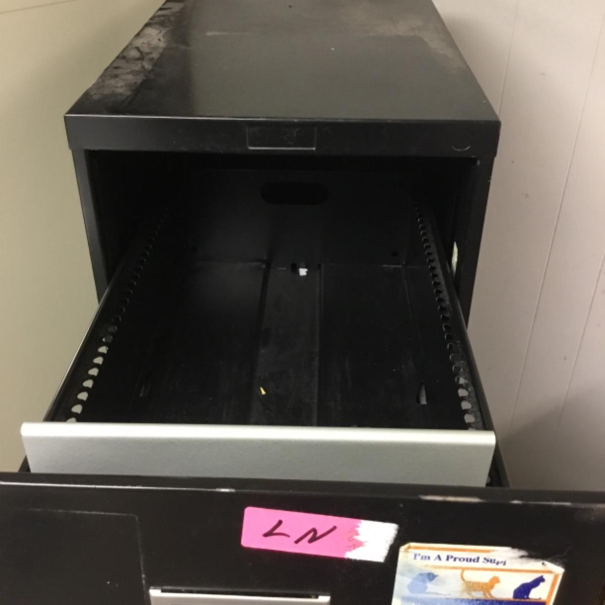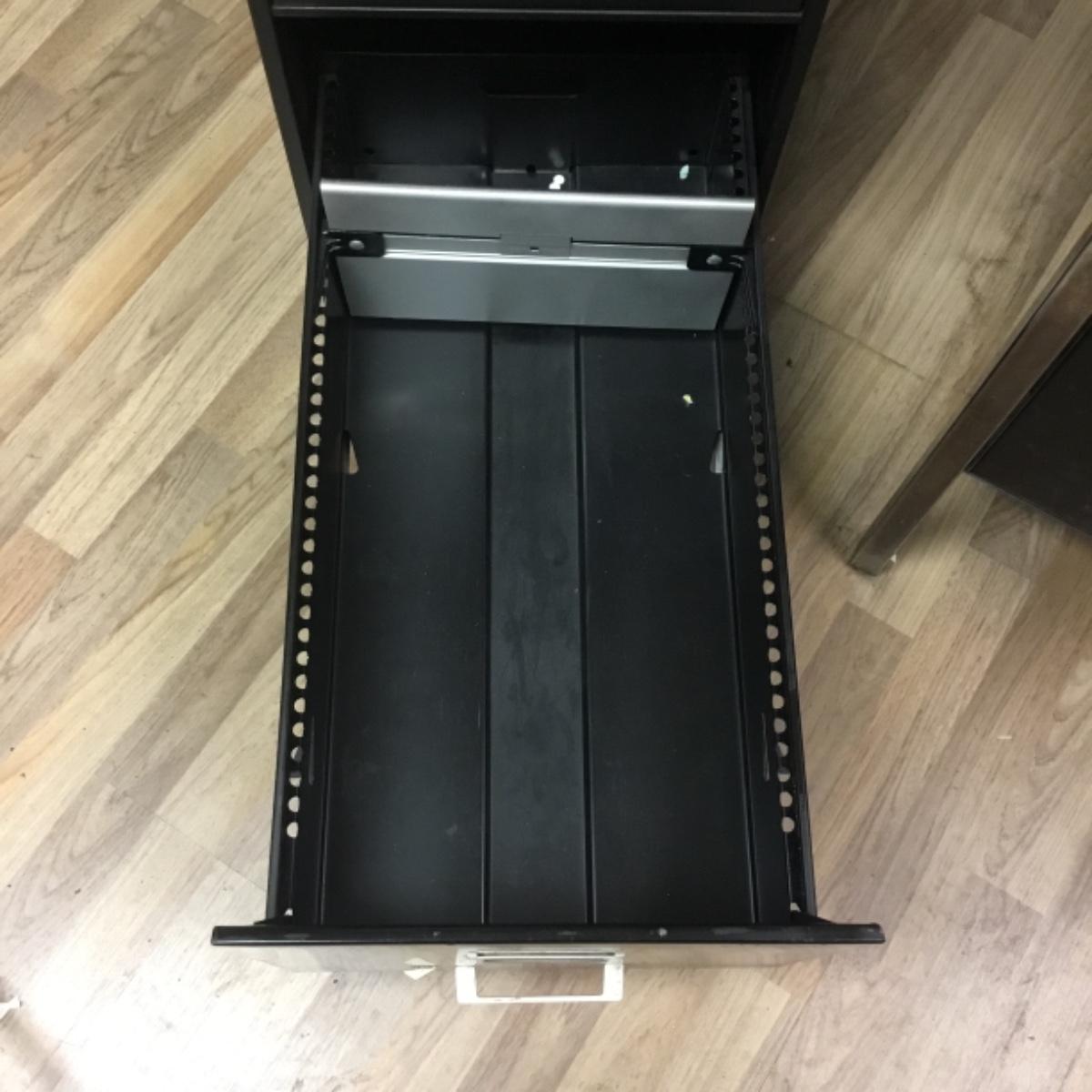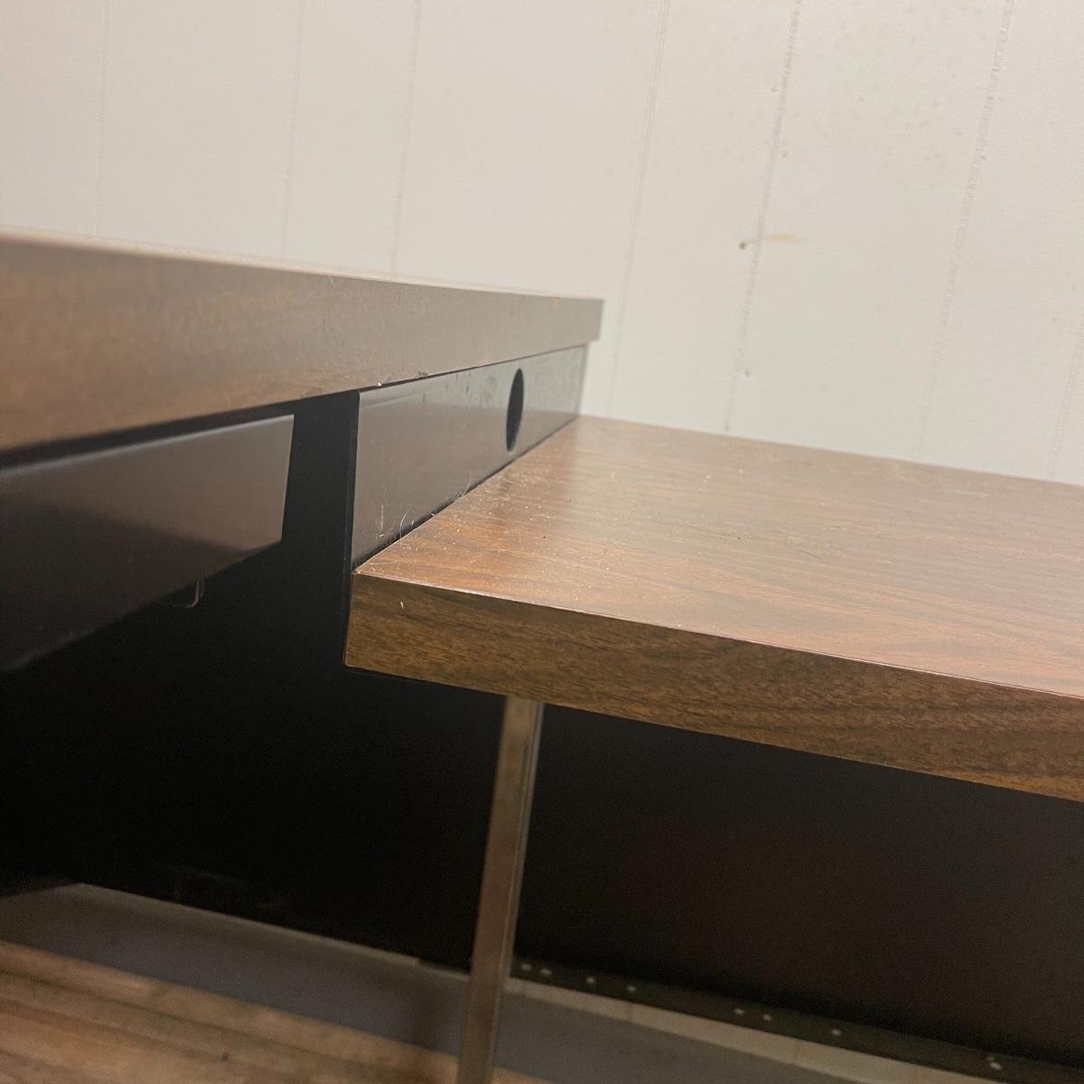 Corner desk with a wooden top and metal base paired with a black metal filing cabinet. The overall dimensions of the desk are 60 inches from side to side, 69.75 inches from the back to the longest point (pictured), and 29 inches tall. The cabinet is 14.75in x 26.5in x 51.5in. The smaller desk is screwed into the larger part (see pics).