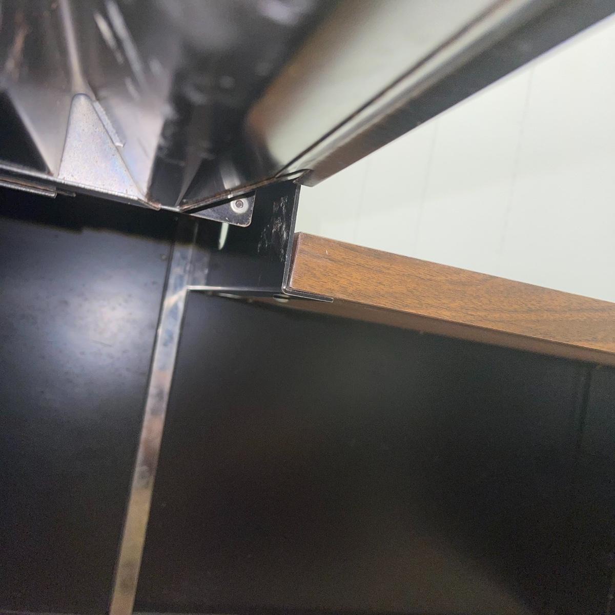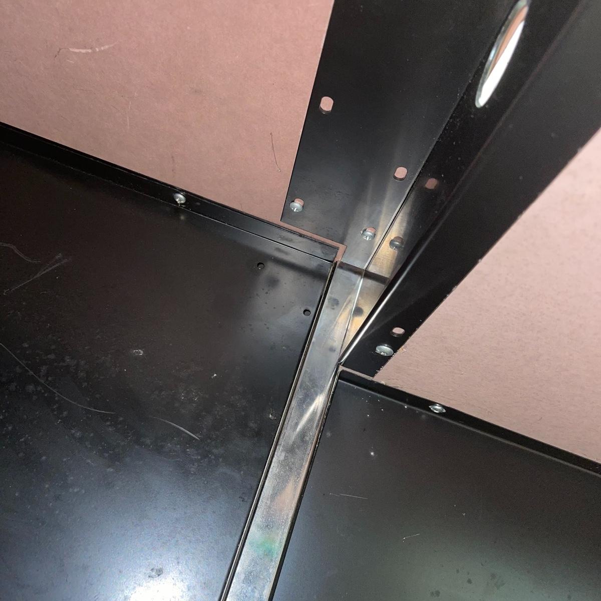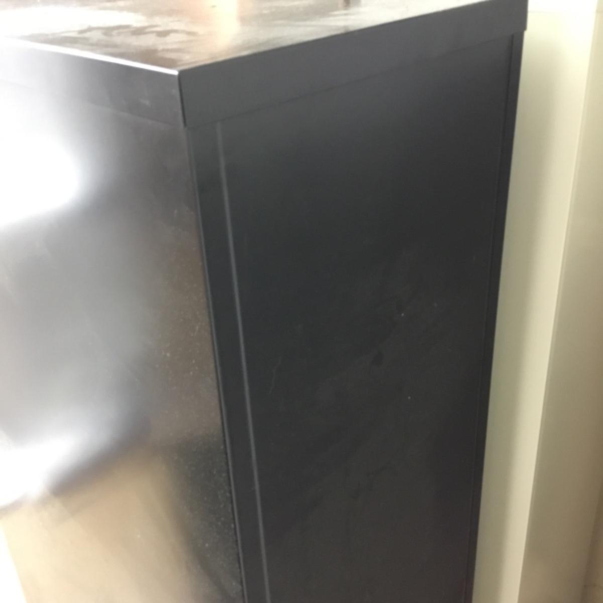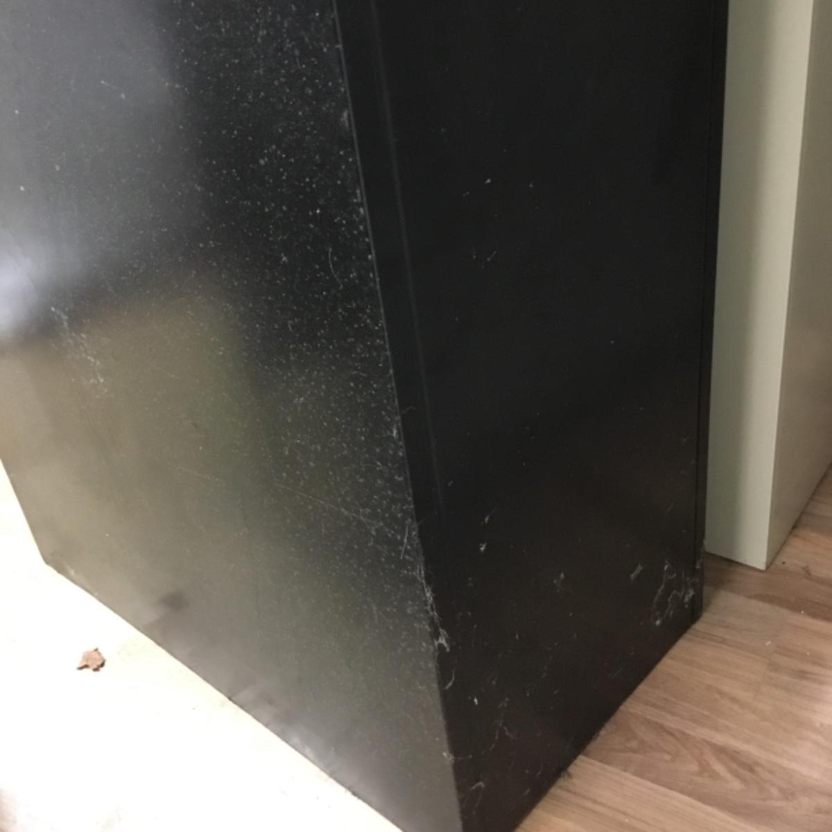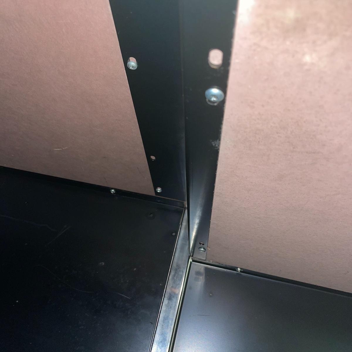 Corner desk with a wooden top and metal base paired with a black metal filing cabinet. The overall dimensions of the desk are 60 inches from side to side, 69.75 inches from the back to the longest point (pictured), and 29 inches tall. The cabinet is 14.75in x 26.5in x 51.5in. The smaller desk is screwed into the larger part (see pics).