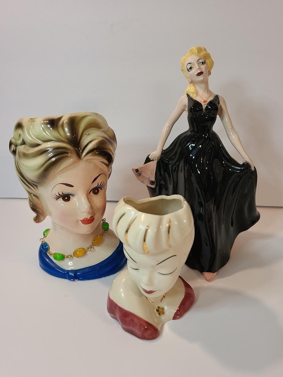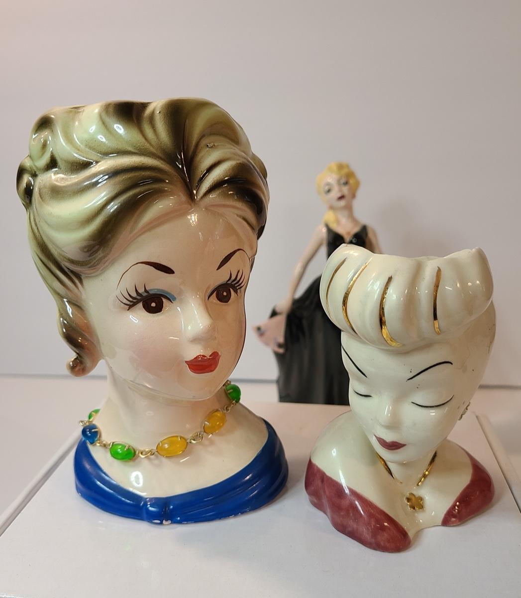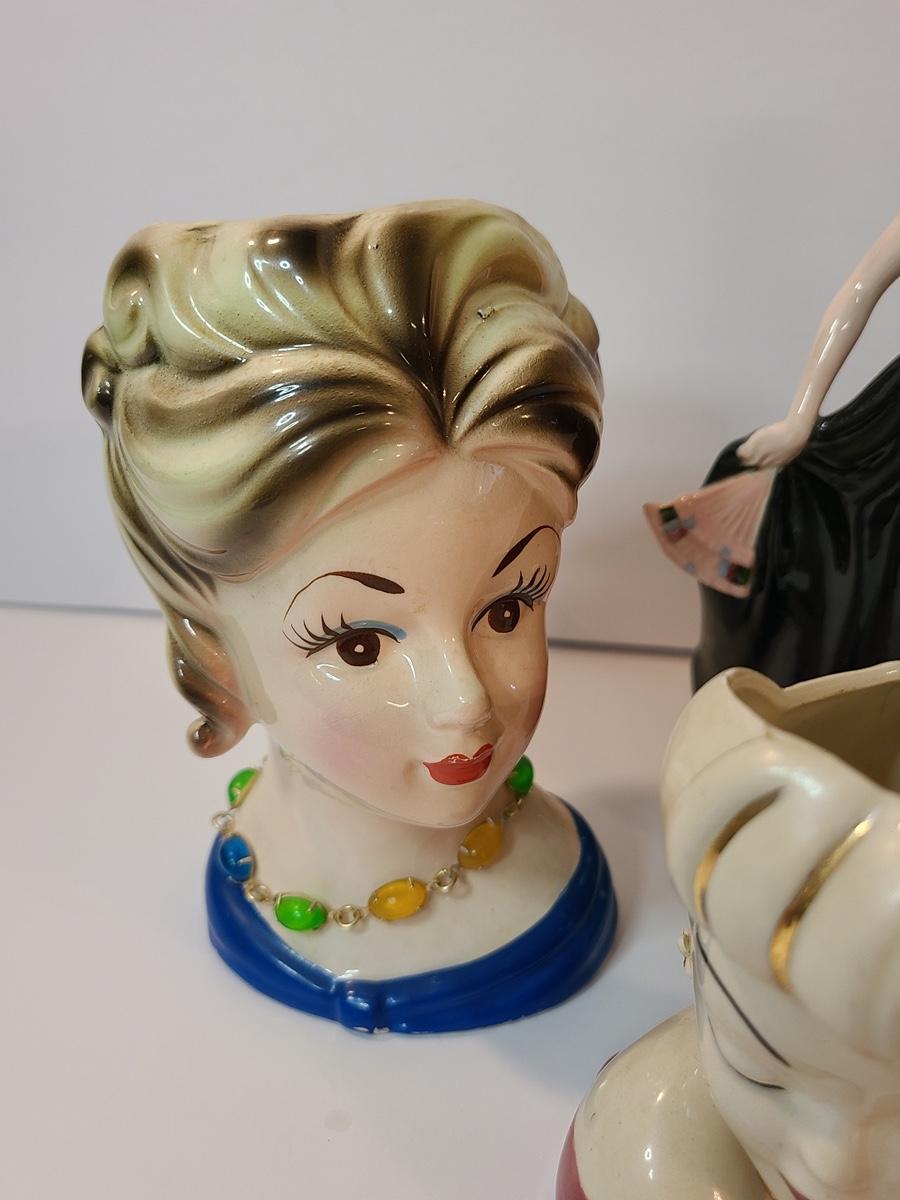 Vintage head vases, the blue dress face shows minimal wear to the paint, the small face has a small hairline fissure that does not go all the way through, and the black gowned lady is ceramic with a mold mark on bottom. Gorgeous collection! Please see all pictures as they are the best representation of the items. The pictures show condition, measurements if taken, and what is included in the lot. Due to the large amount that we photograph and the time frame, we are not always able to take measurements. All items unless noted, are pre-owned and have been used. If you purchased furniture, you must bring help. We do not allow one person to carry large furniture out on their own. Bring help, tools and a truck for the safety of our client’s homes, and your personal safety. Company policy. Thank you.