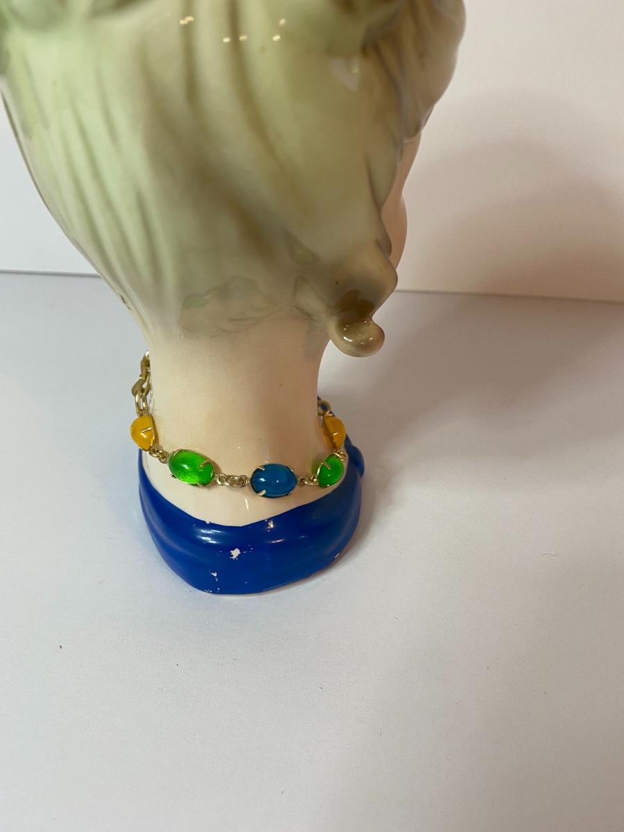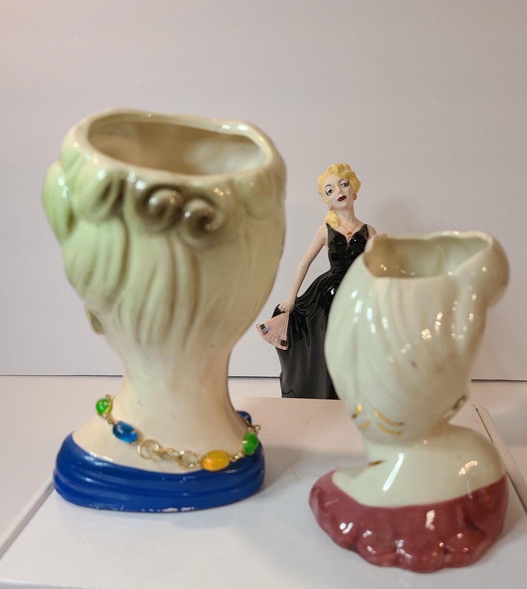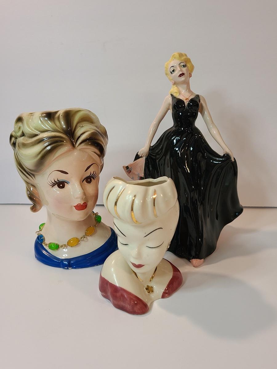 Vintage head vases, the blue dress face shows minimal wear to the paint, the small face has a small hairline fissure that does not go all the way through, and the black gowned lady is ceramic with a mold mark on bottom. Gorgeous collection! Please see all pictures as they are the best representation of the items. The pictures show condition, measurements if taken, and what is included in the lot. Due to the large amount that we photograph and the time frame, we are not always able to take measurements. All items unless noted, are pre-owned and have been used. If you purchased furniture, you must bring help. We do not allow one person to carry large furniture out on their own. Bring help, tools and a truck for the safety of our client’s homes, and your personal safety. Company policy. Thank you.