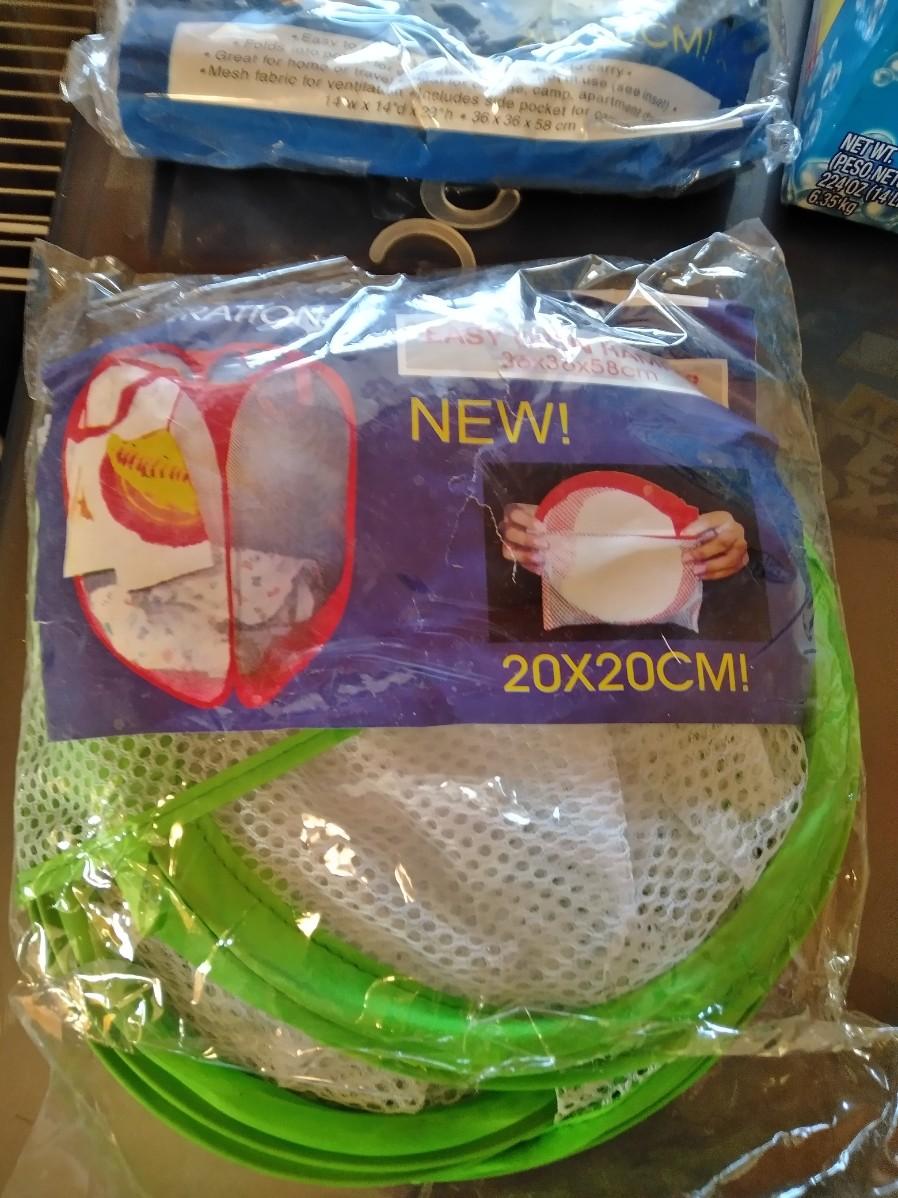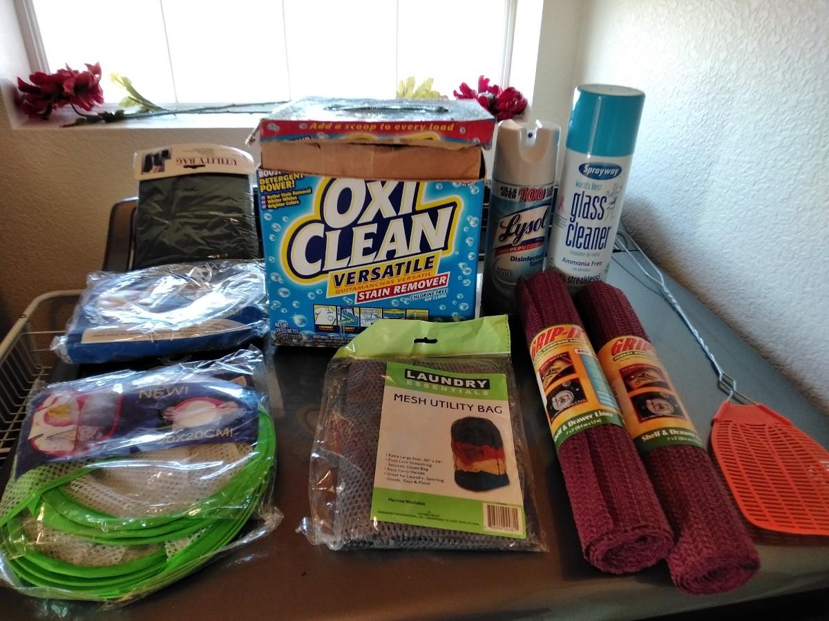 NEARLY FULL BOX OF OXI-XLEAN STAIN REMOVER POWDER, GLASS CLEANER, LAUNDRY MESH BAGS, AND HAMPERS, SHELF LINER AND MORE
