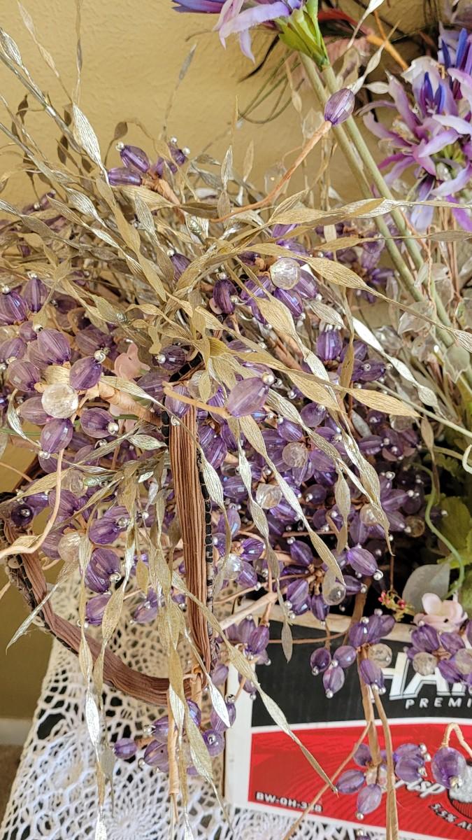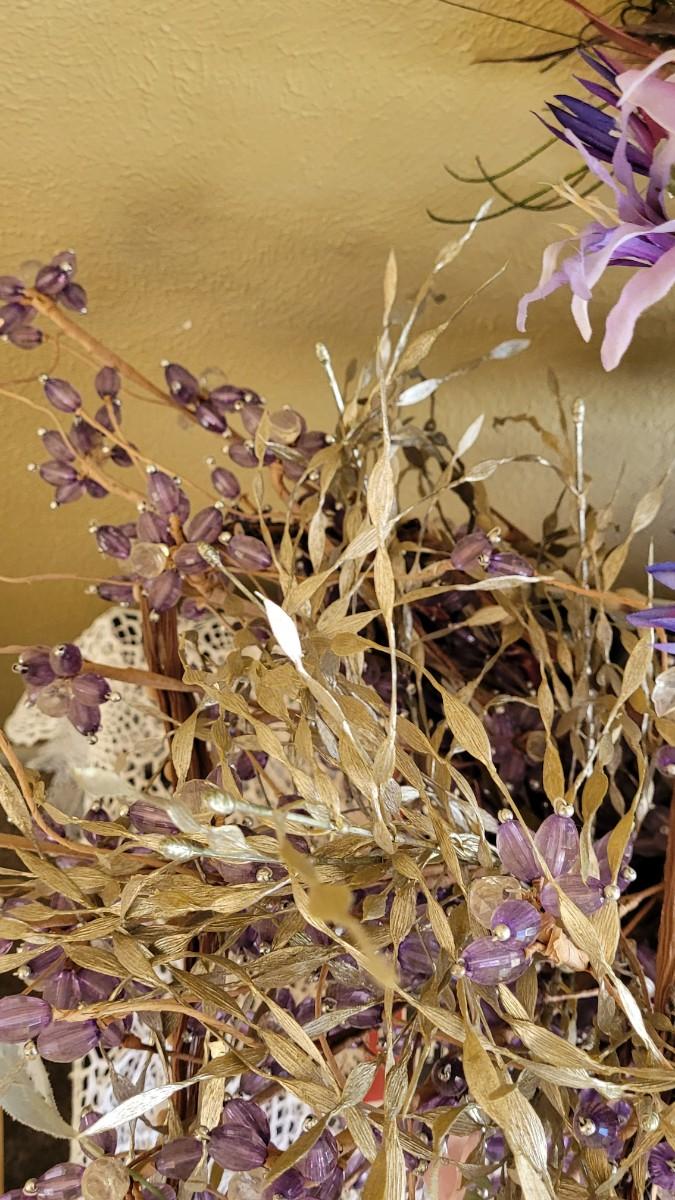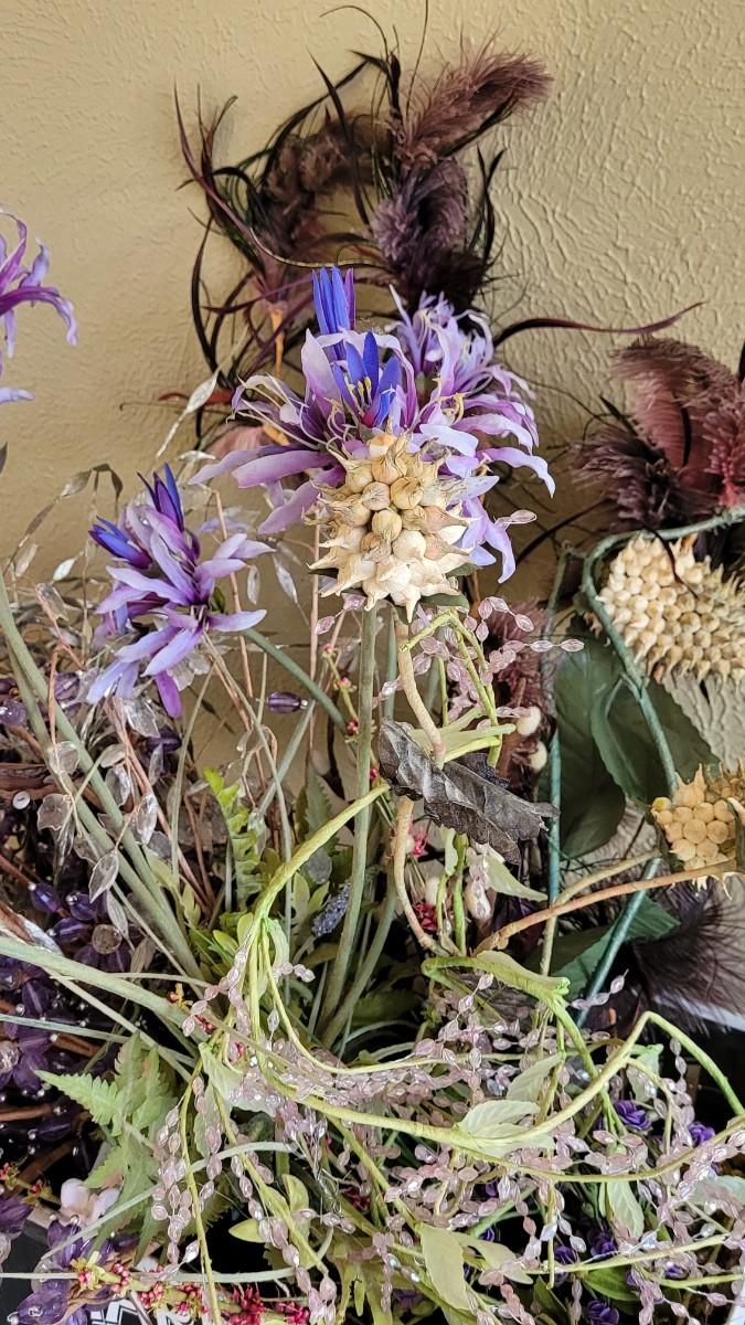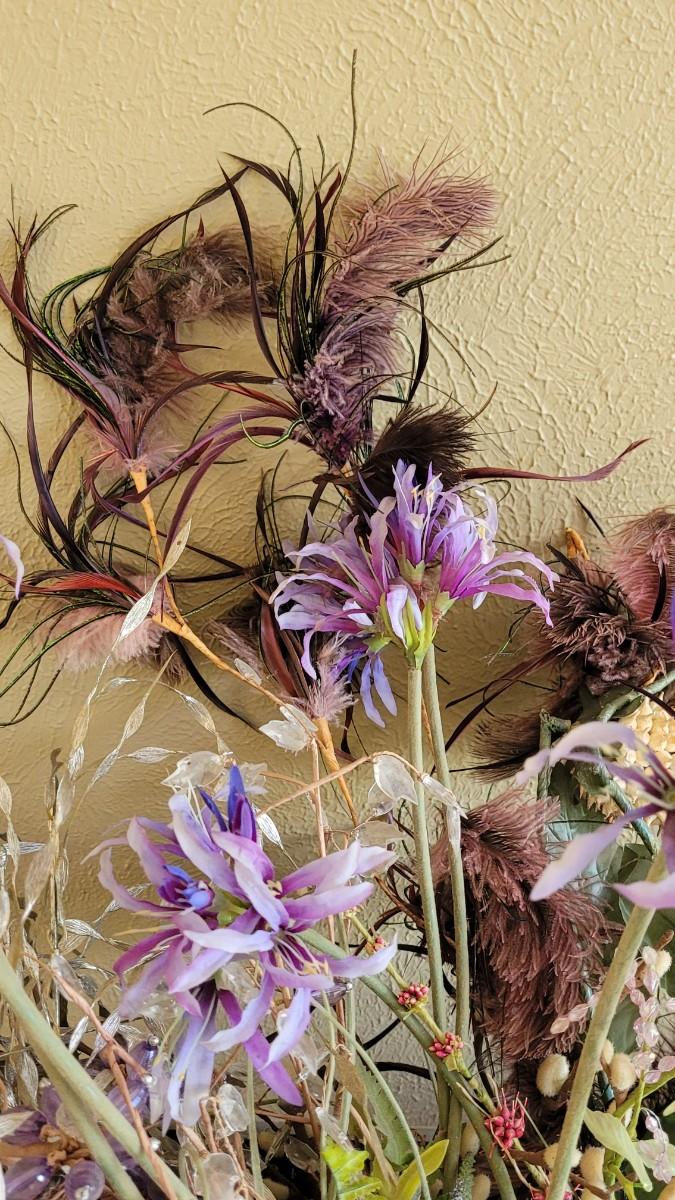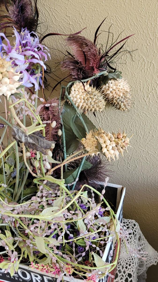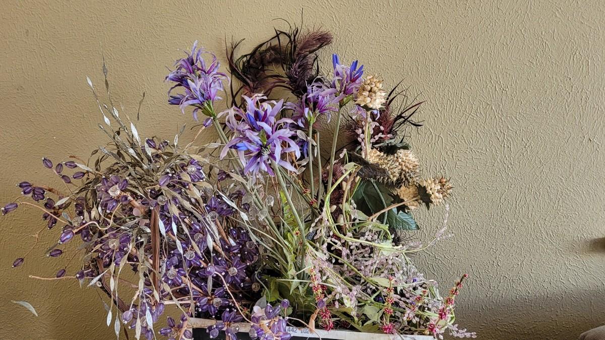 Lot 227: Box of Floral Items - Flowers, Beaded Flowers, Feathers and Pods