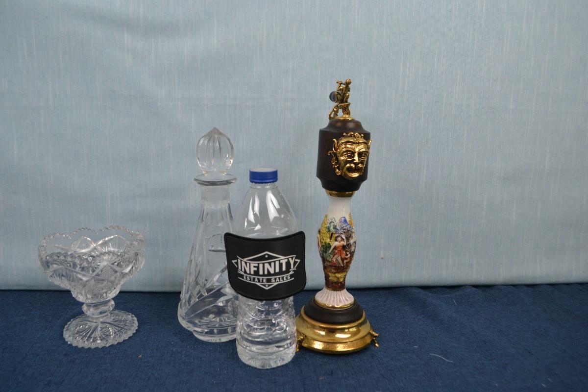 LOT 227. GLASSWARE AND VINTAGE PEPPER GRINDER MUSIC BOX