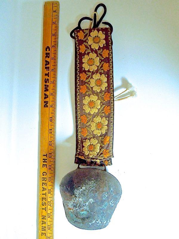 Total length is 19". Antique forged metal. Sturdy welds. Nice patina. Has a forged metal hook at end of vintage embroidered 3" wide ribbon. Clabber intact and bell rings nicely.
