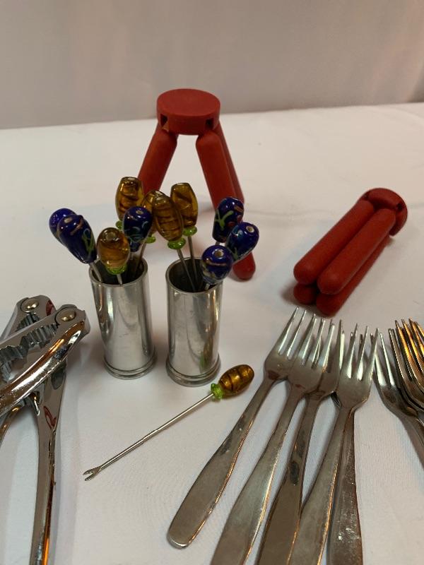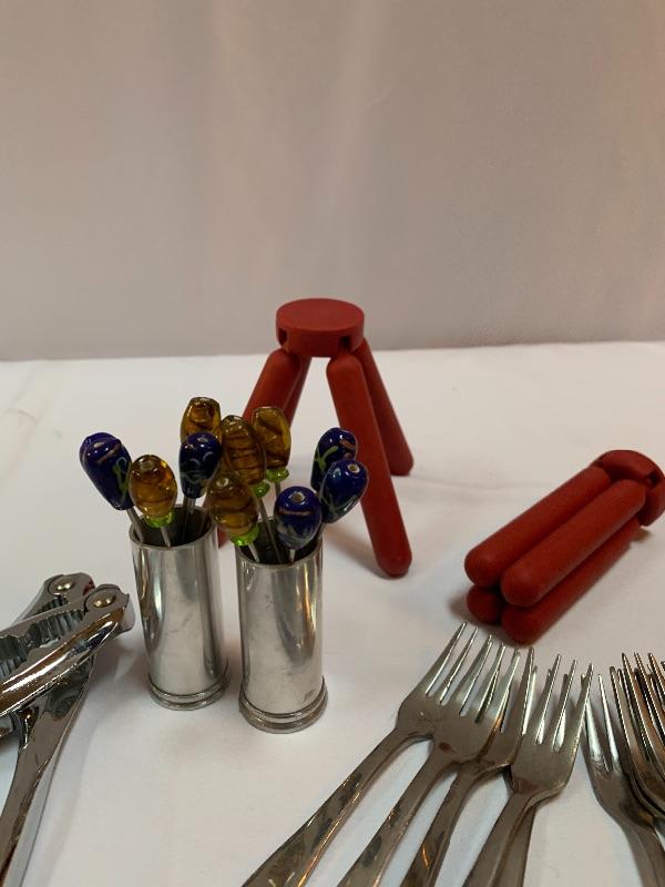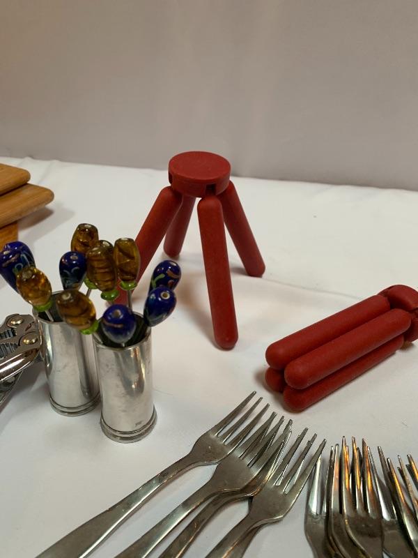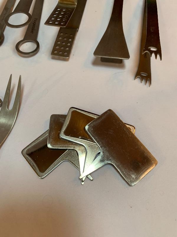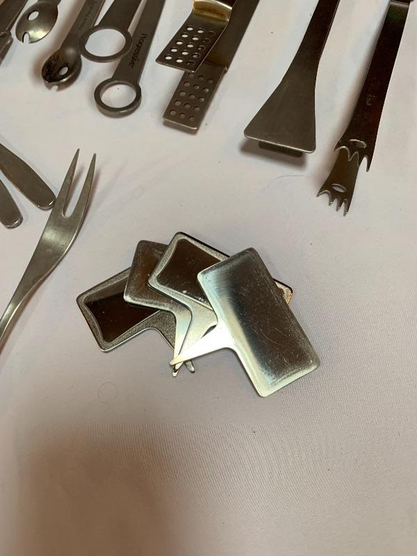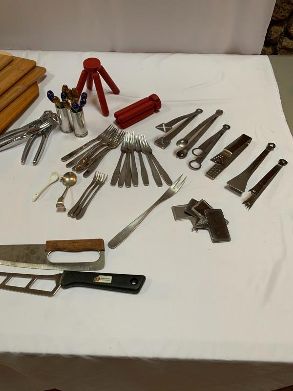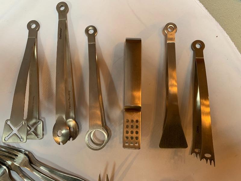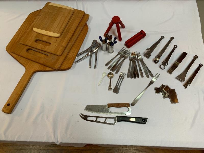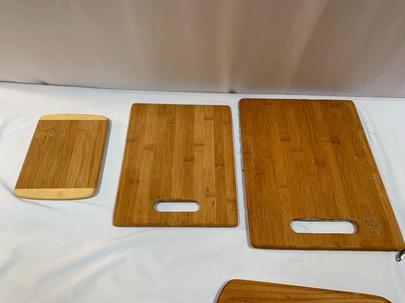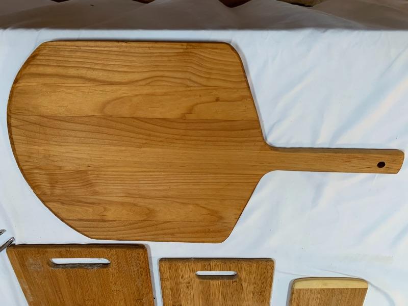 This lot includes three smaller bamboo cutting boards with the largest measuring 14” x10.5”. Pizza board that measures 24” long with the handle and has an angled end for scooping up. The rest are service pieces and two small red risers for giving the varied landscape of a yummy board. Local pick up only.