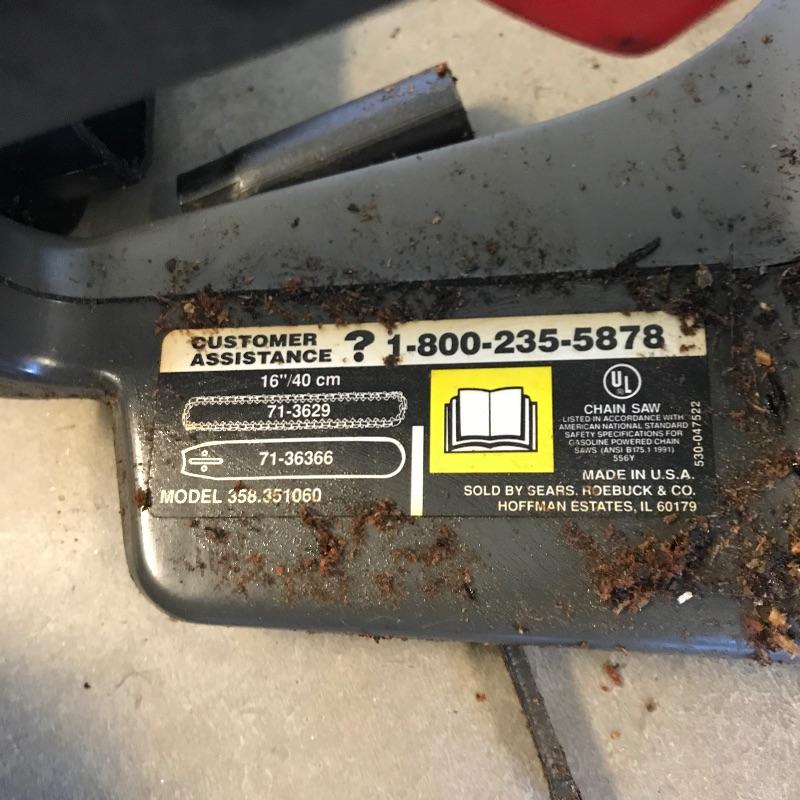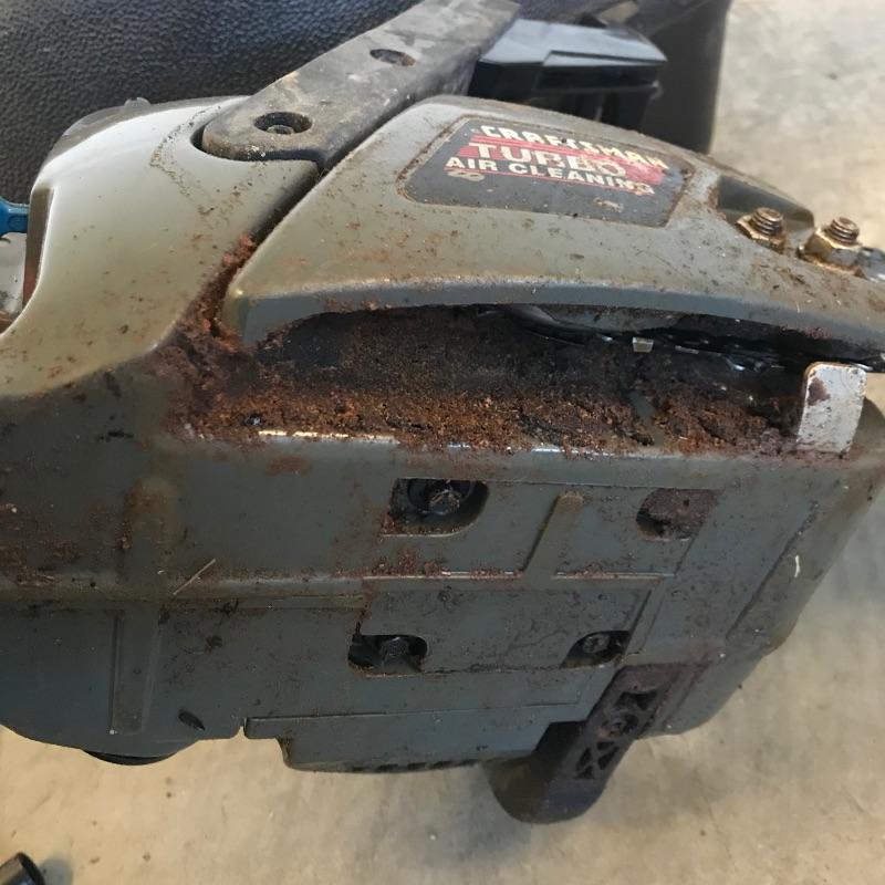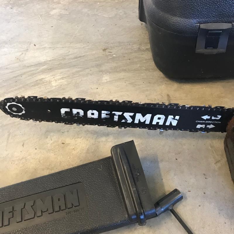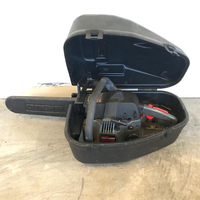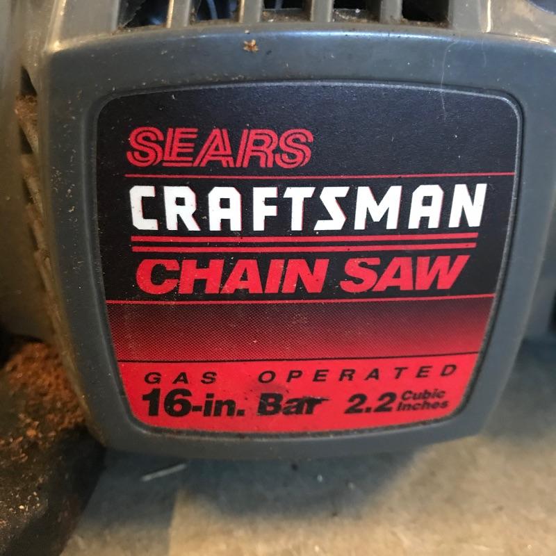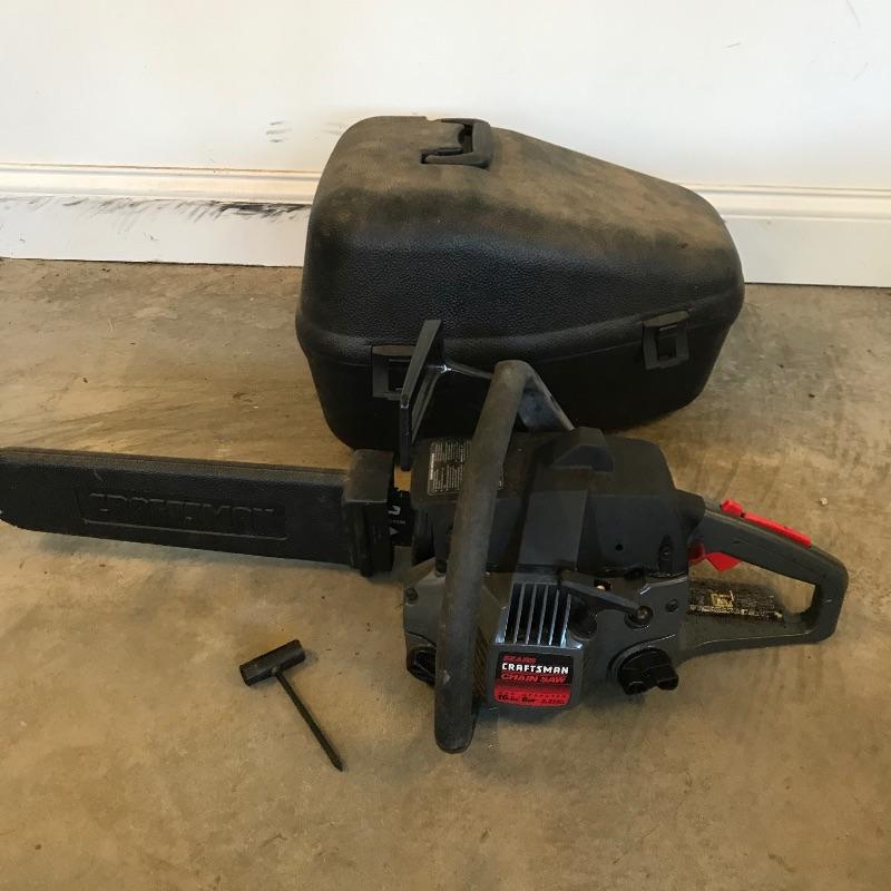 Strong and lightweight, Craftsman’s gas operated 16” chain saw. Motor tries to turn, but may need gas to power up. The primer switch is also currently indented. Outer bottom area of chainsaw has some gas or oil residue that could be cleaned up. Lot includes tool and case for machine and saw. See photos. No shipping.