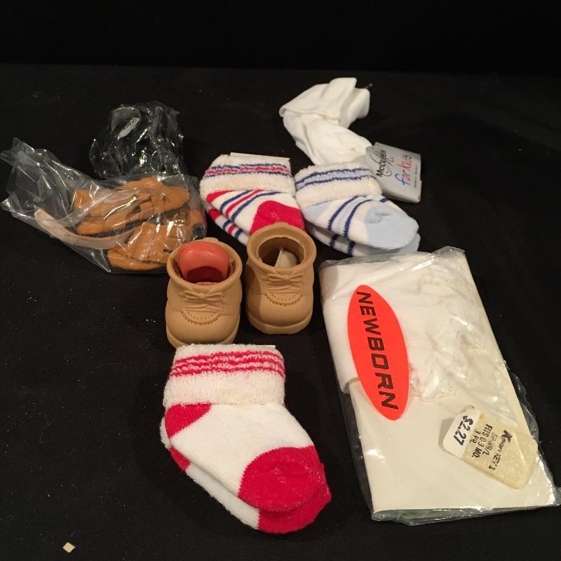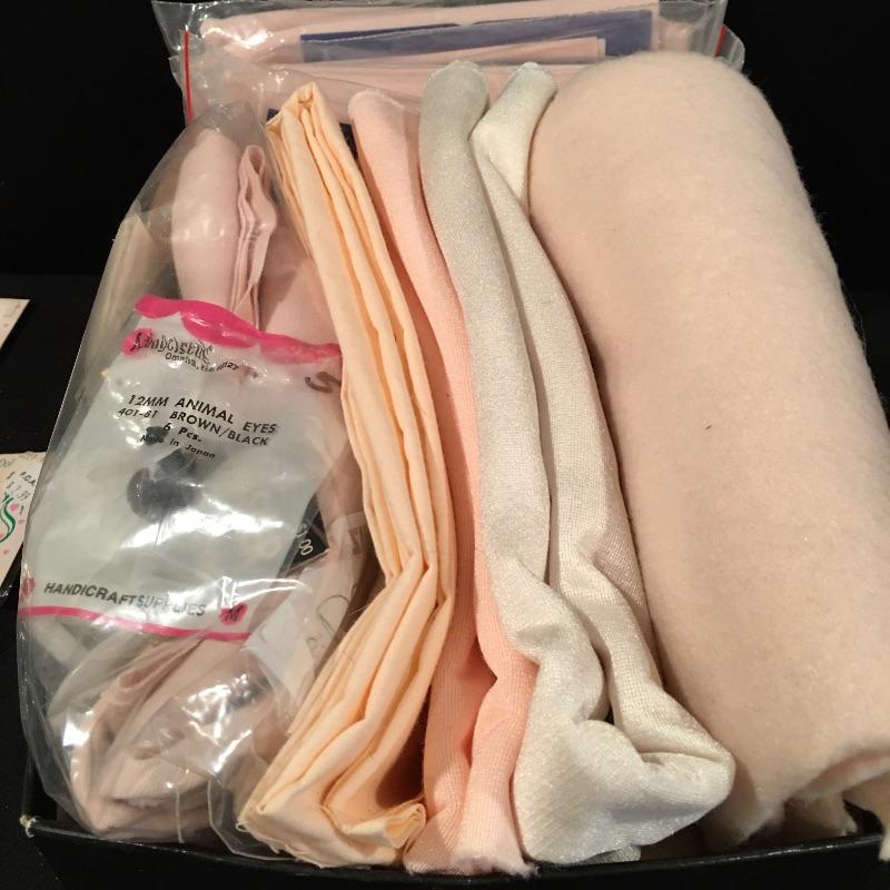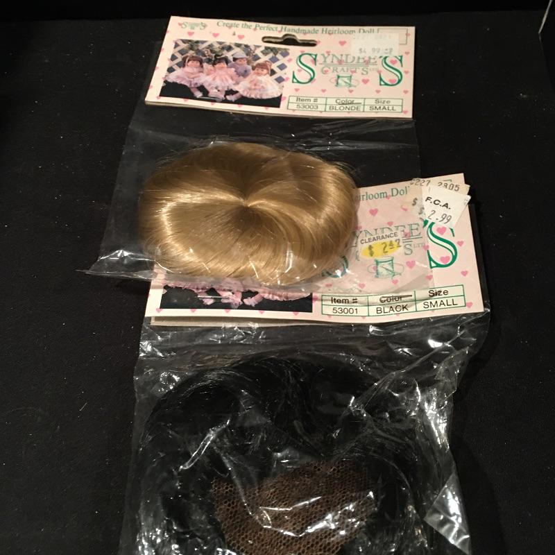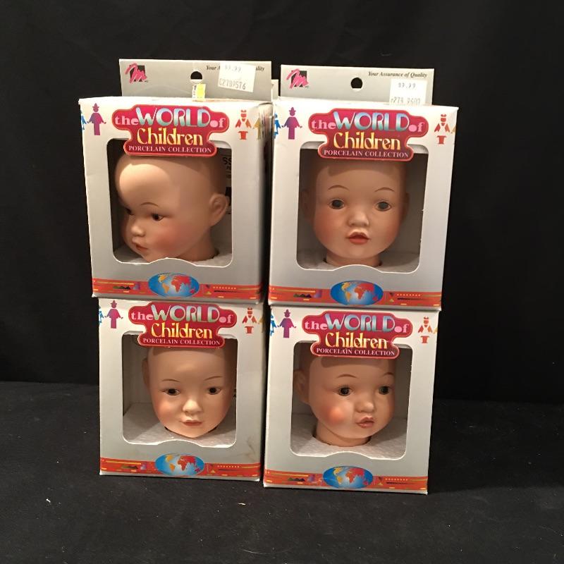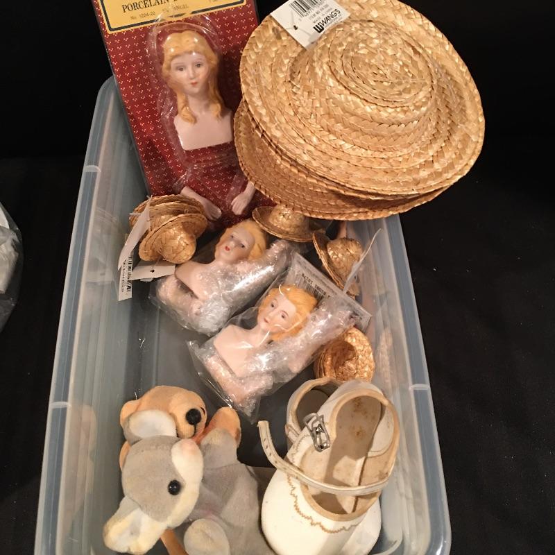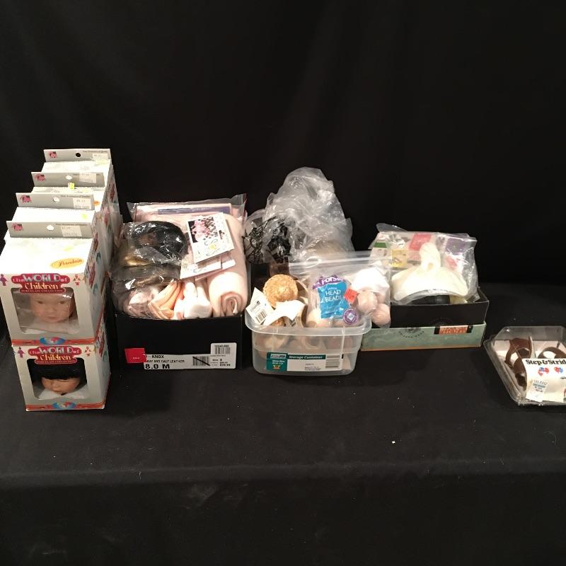 Doll making supplies includes The World of Children porcelain doll heads, doll hair, fabric, sox, hats, hush puppies and more.