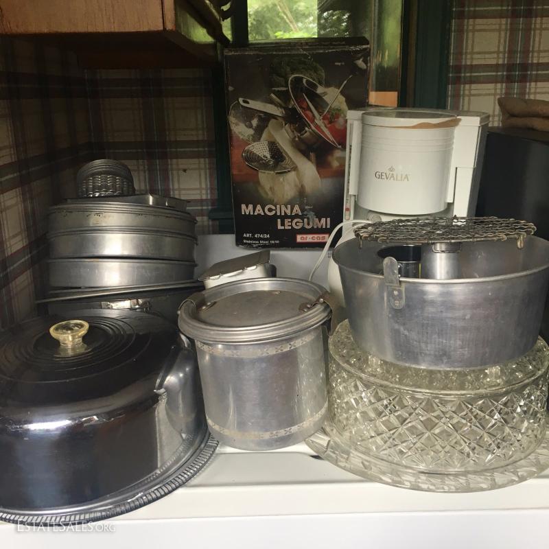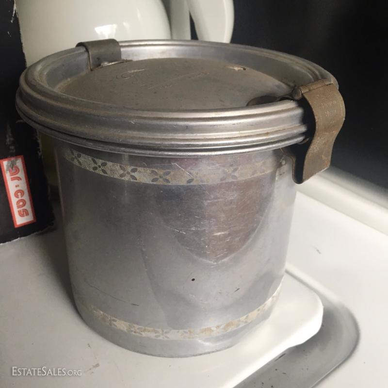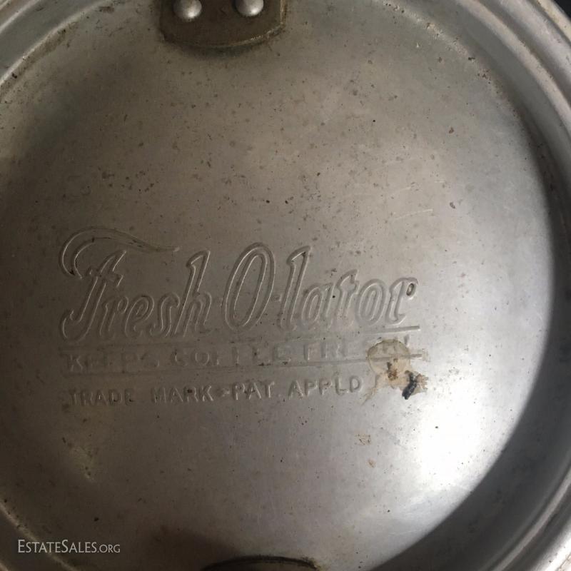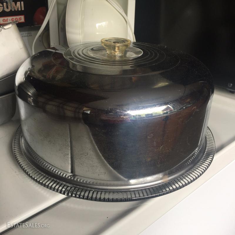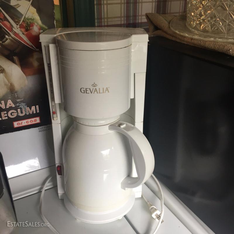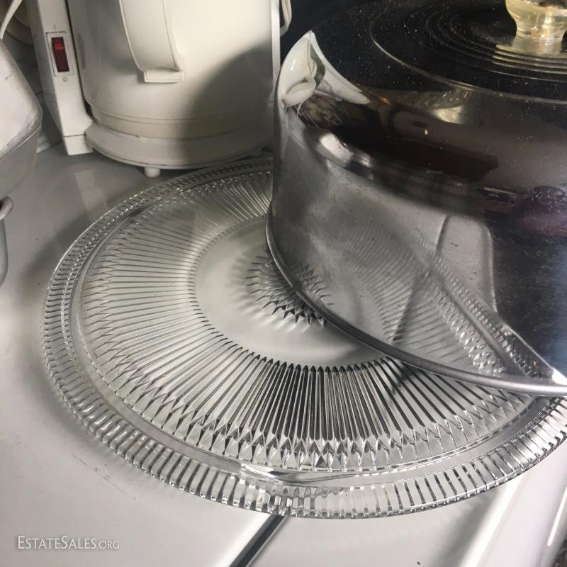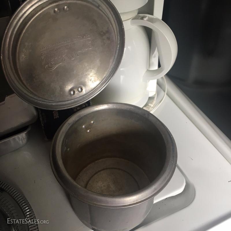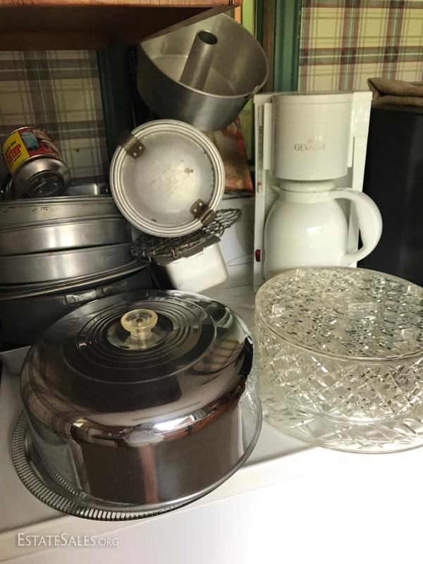 White Gevalia Coffee Maker with Carafe. Vintage Tin Fresh-O-Lator coffee container. Retro cake saver with glass plate bottom. Other misc bake ware. Local pick up in Arden, NC only.
