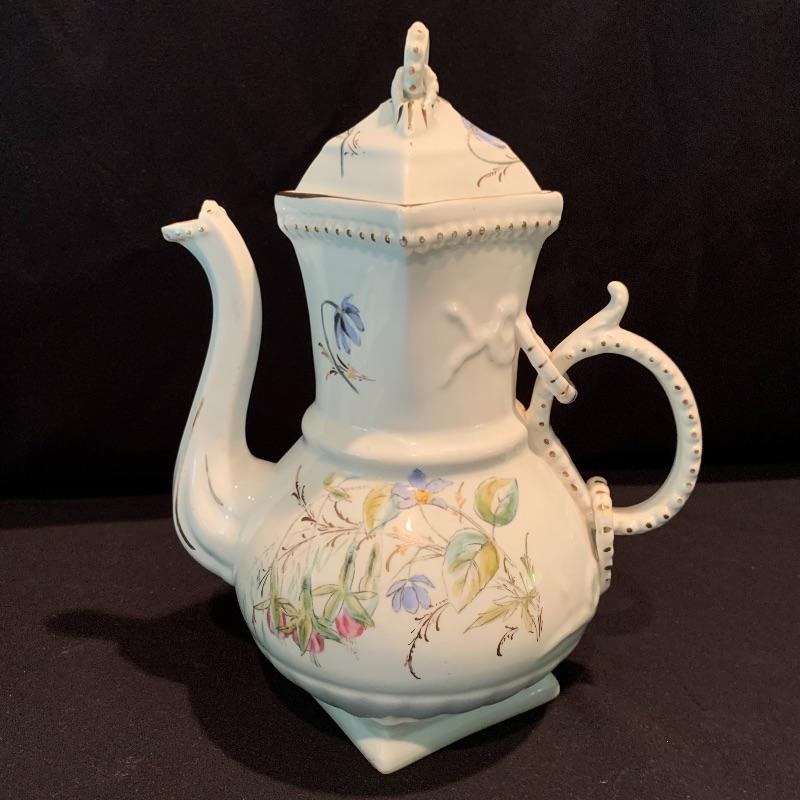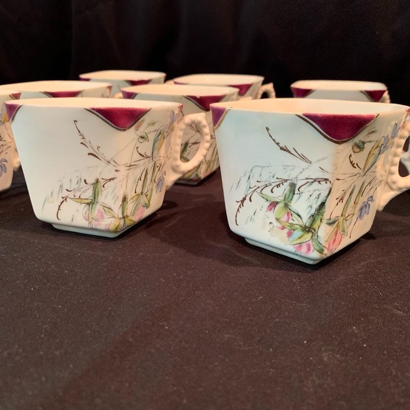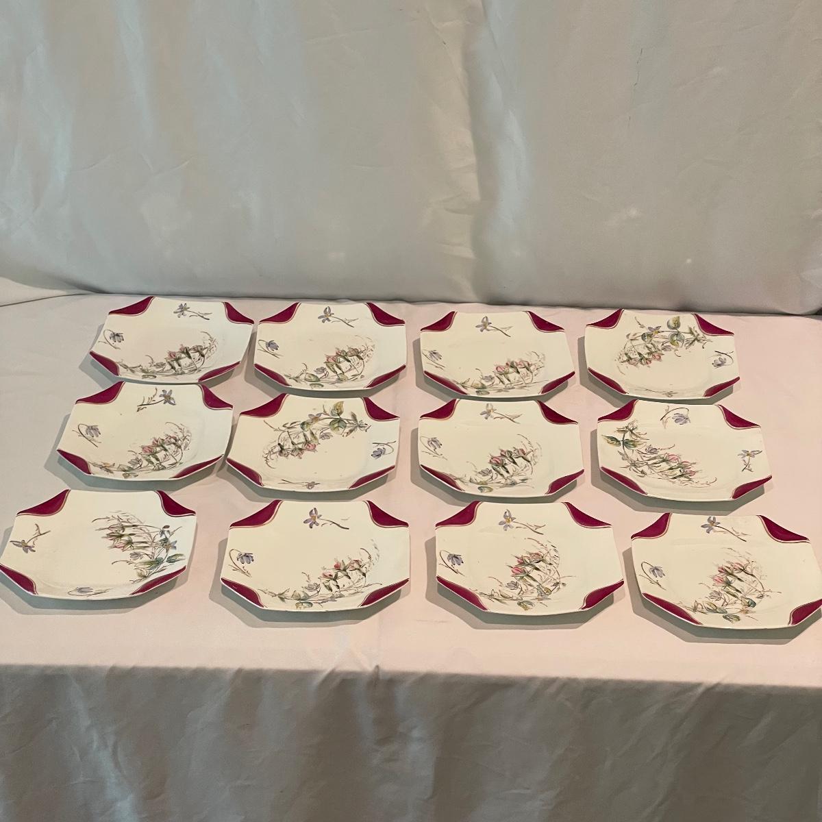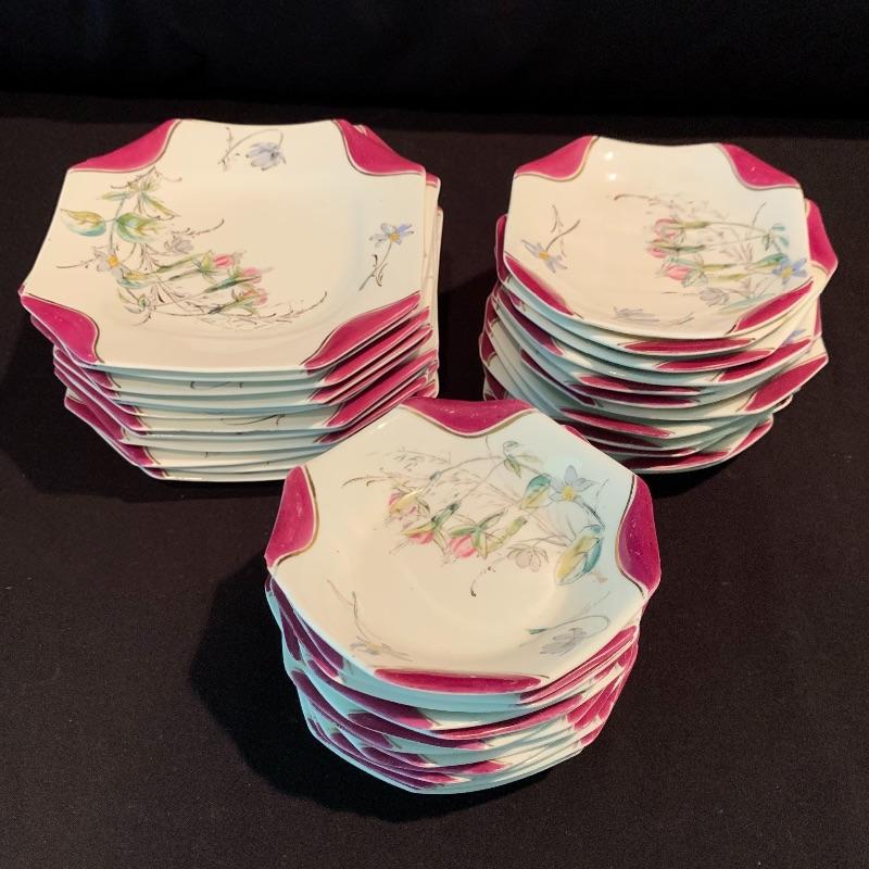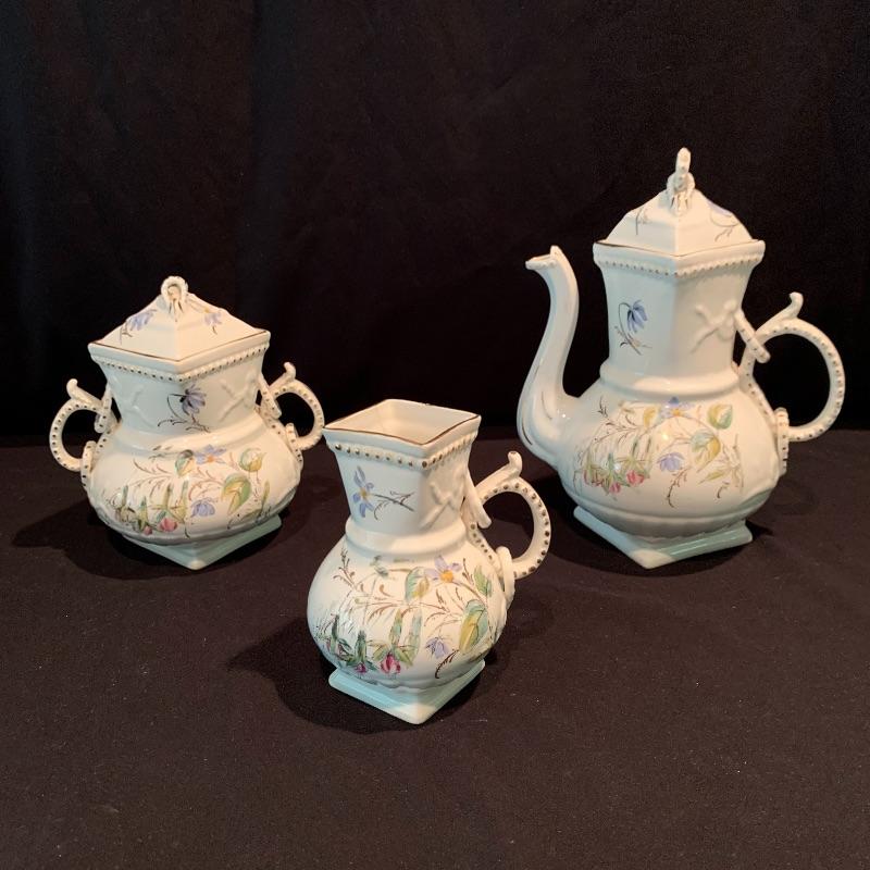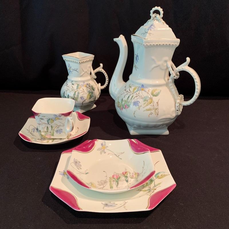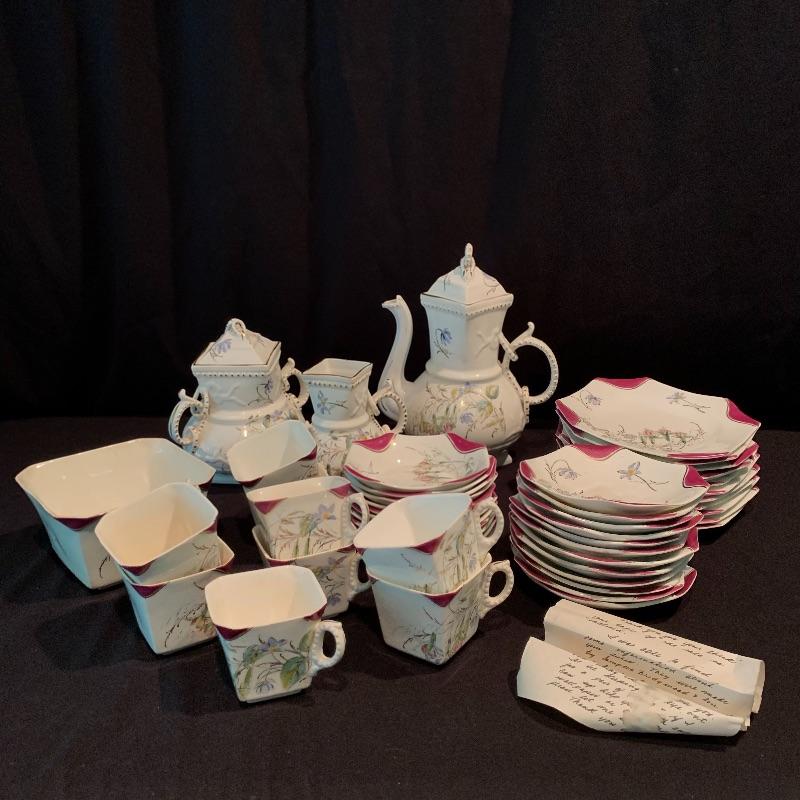 According to a handwritten note written by antique dealer Mary Linn Coldiron to Mr. and Mrs. Olson when they purchased this breathtaking set of China in 1973, it was made by Sampson Bridgwood & Son in Longton, England in 1885. This set features a beautiful and very elegant floral design, with metallic golden accents throughout. The set includes one teapot, one 6” tall pitcher for cream and a 7.5” tall lidded container for sugar, nine teacups, twelve 5.5” saucers, twelve 5.5” bread plates, twelve 7” entree plates, and one 6” square dish. Both sugar and creamer have small cracks, only a couple chips were noticed, but make an appointment for the preview and check out each piece for yourself! See photos. Shipping available.