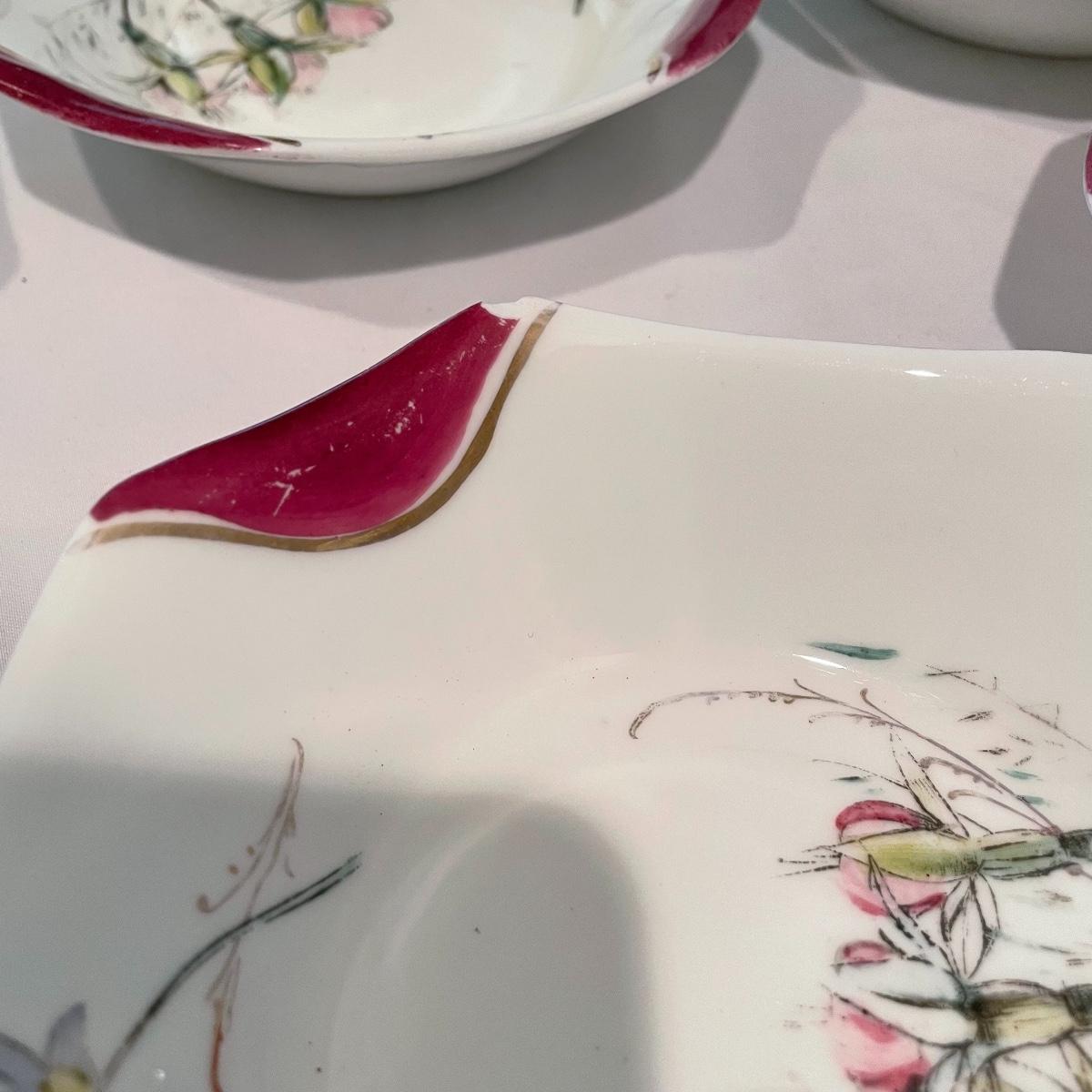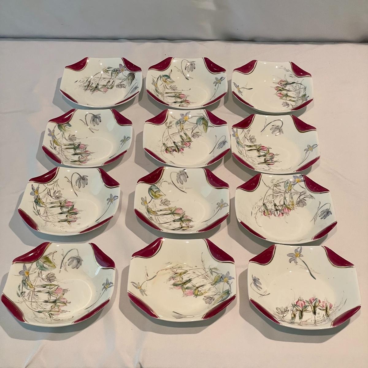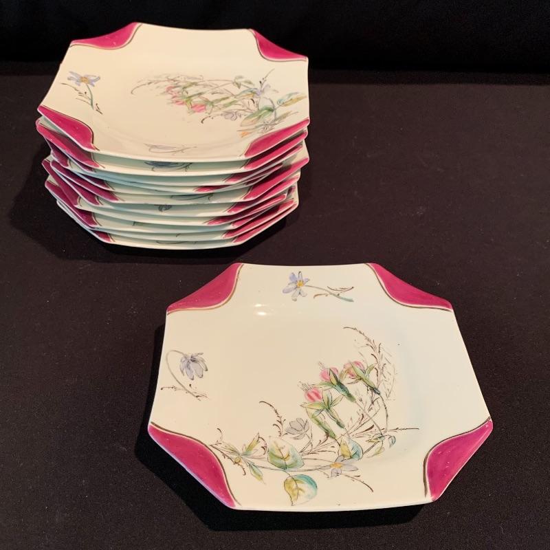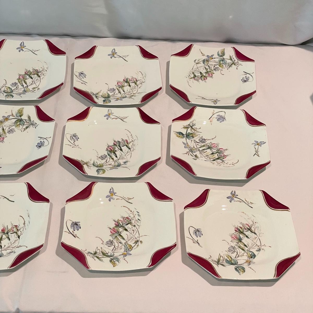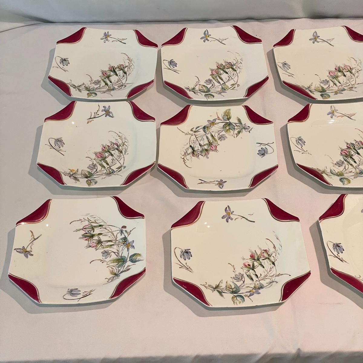 According to a handwritten note written by antique dealer Mary Linn Coldiron to Mr. and Mrs. Olson when they purchased this breathtaking set of China in 1973, it was made by Sampson Bridgwood & Son in Longton, England in 1885. This set features a beautiful and very elegant floral design, with metallic golden accents throughout. The set includes one teapot, one 6” tall pitcher for cream and a 7.5” tall lidded container for sugar, nine teacups, twelve 5.5” saucers, twelve 5.5” bread plates, twelve 7” entree plates, and one 6” square dish. Both sugar and creamer have small cracks, only a couple chips were noticed, but make an appointment for the preview and check out each piece for yourself! See photos. Shipping available.