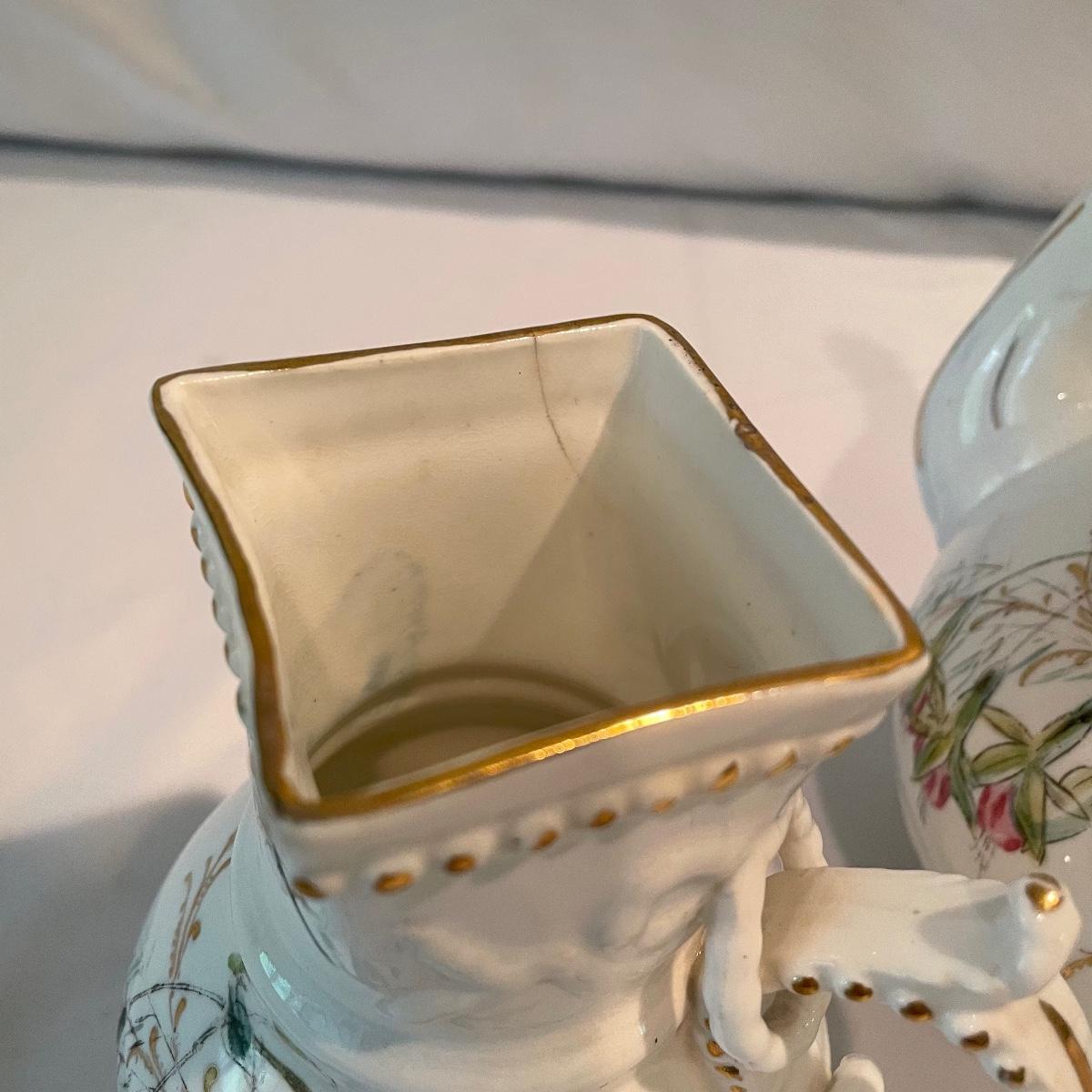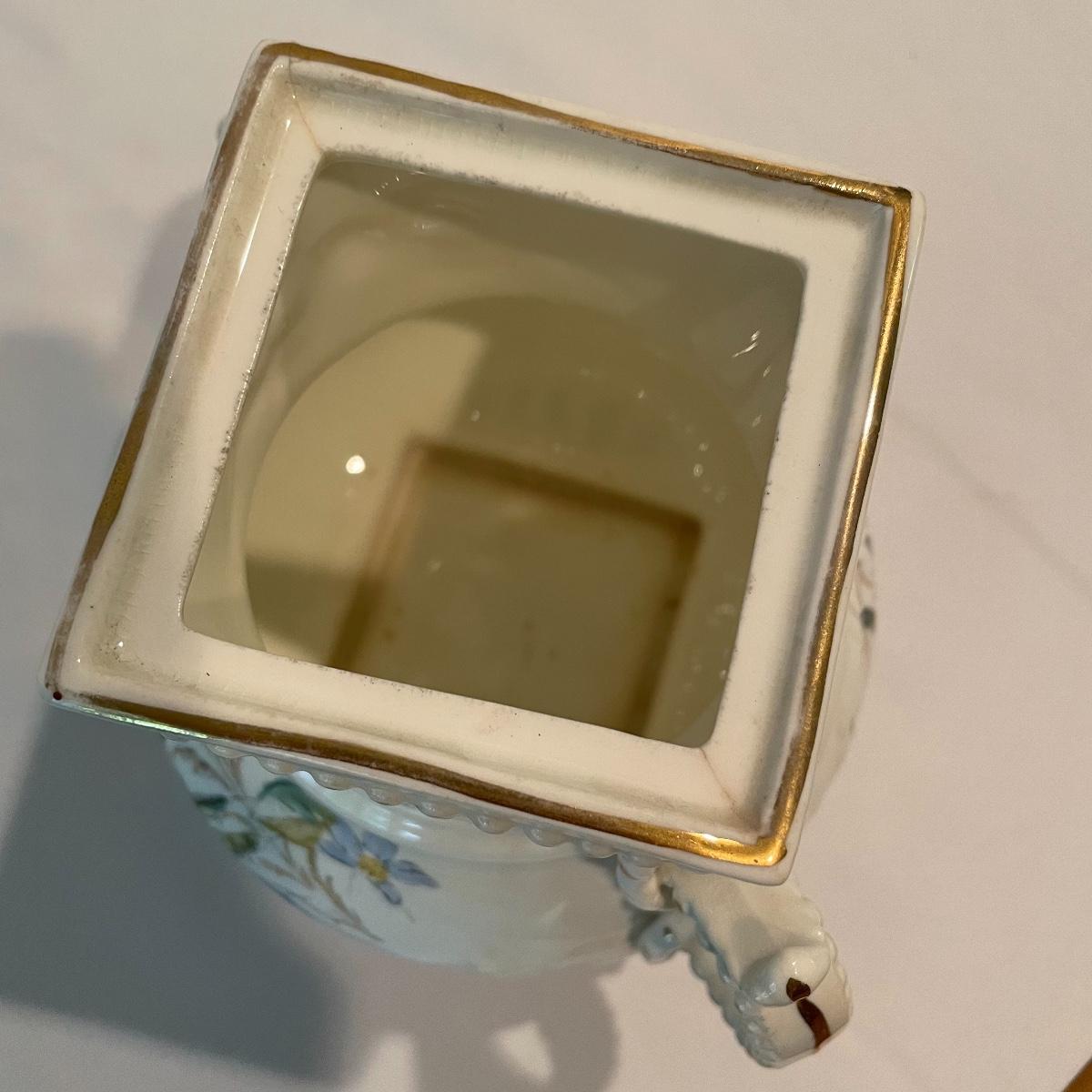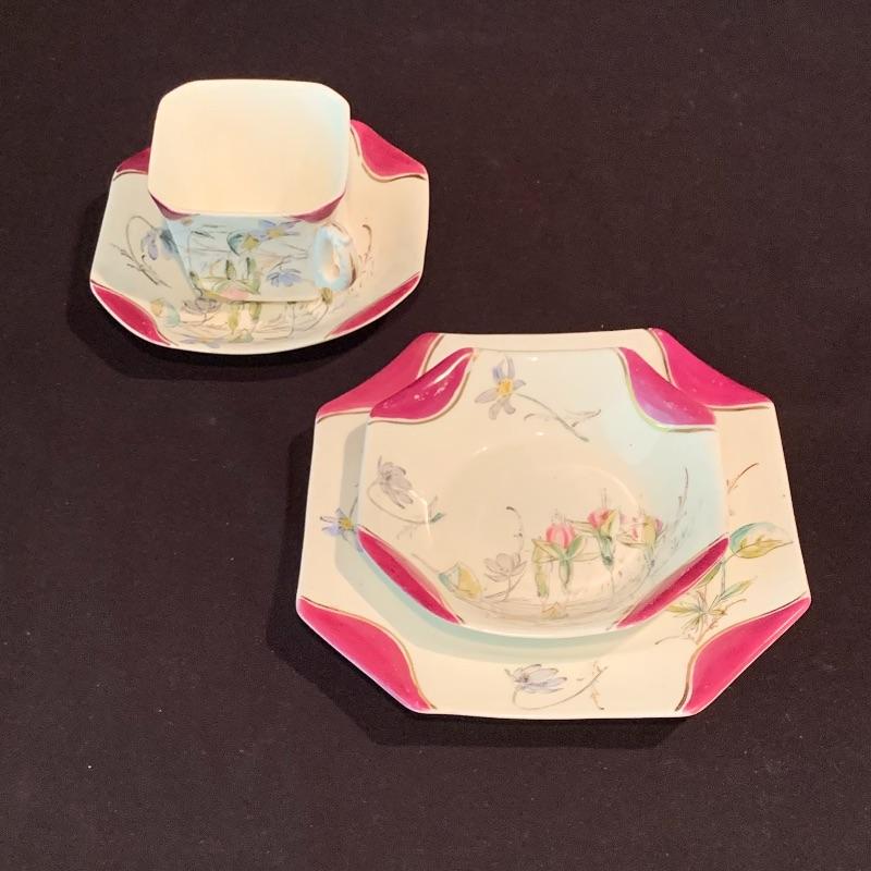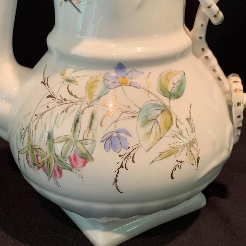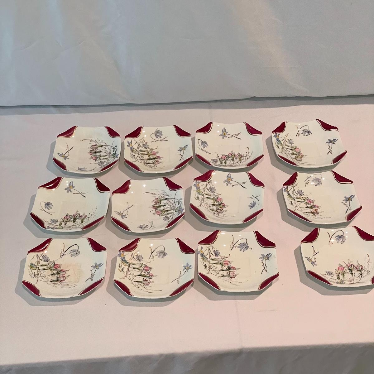 According to a handwritten note written by antique dealer Mary Linn Coldiron to Mr. and Mrs. Olson when they purchased this breathtaking set of China in 1973, it was made by Sampson Bridgwood & Son in Longton, England in 1885. This set features a beautiful and very elegant floral design, with metallic golden accents throughout. The set includes one teapot, one 6” tall pitcher for cream and a 7.5” tall lidded container for sugar, nine teacups, twelve 5.5” saucers, twelve 5.5” bread plates, twelve 7” entree plates, and one 6” square dish. Both sugar and creamer have small cracks, only a couple chips were noticed, but make an appointment for the preview and check out each piece for yourself! See photos. Shipping available.