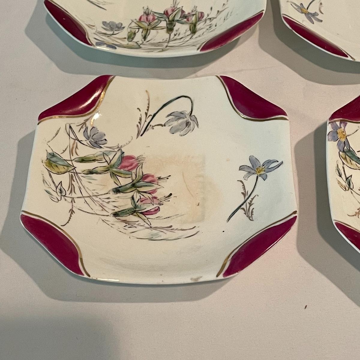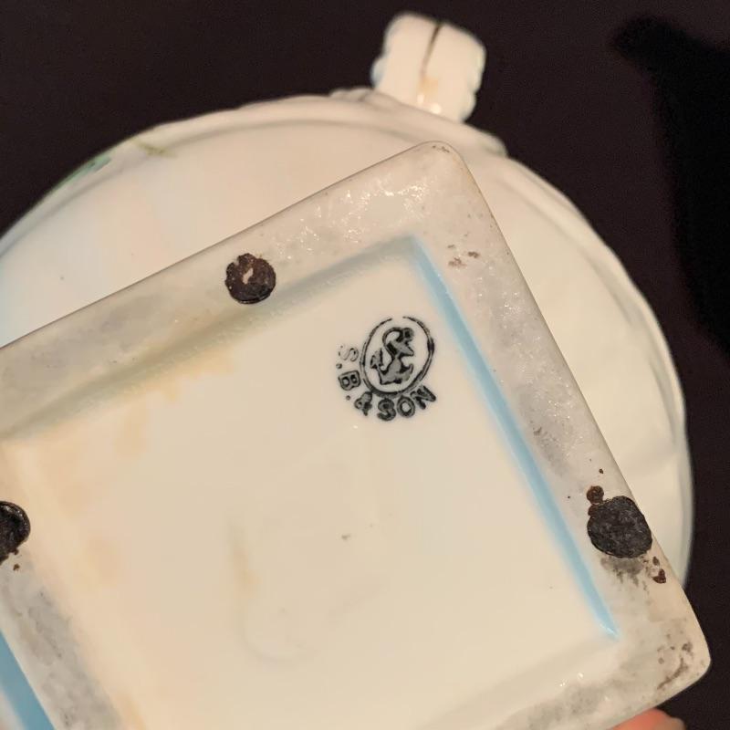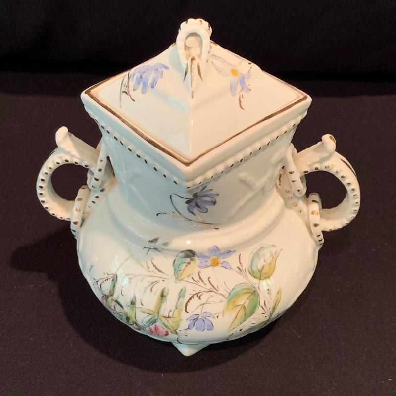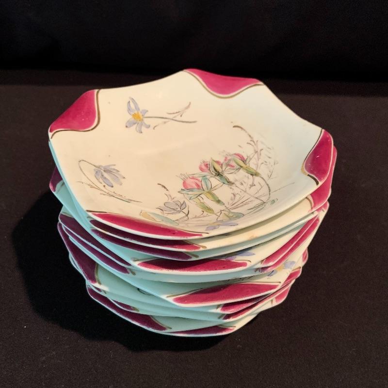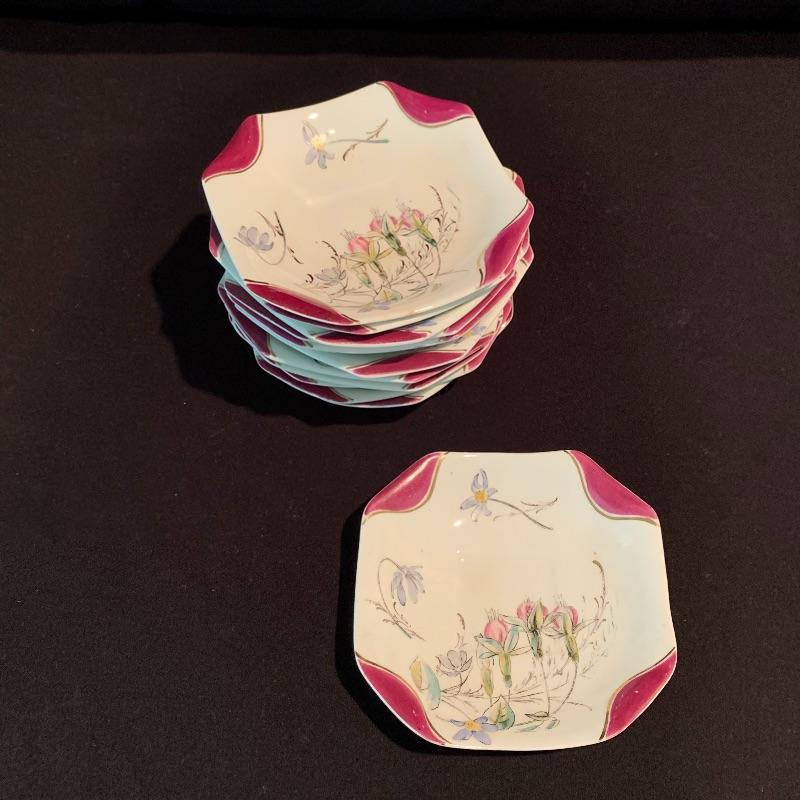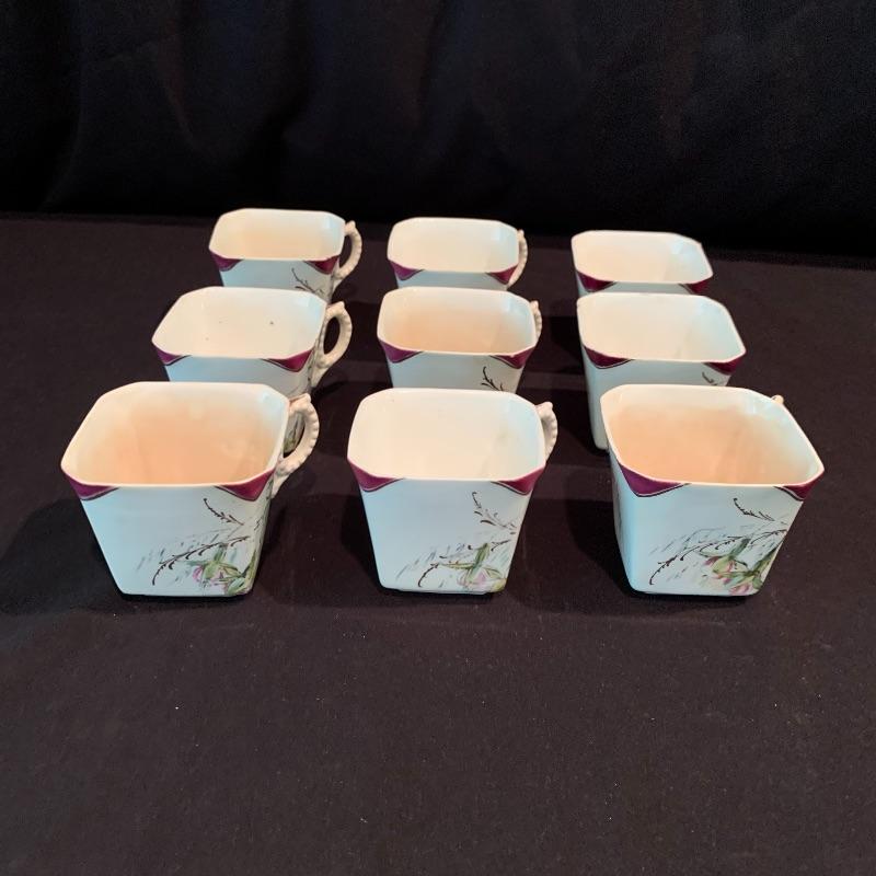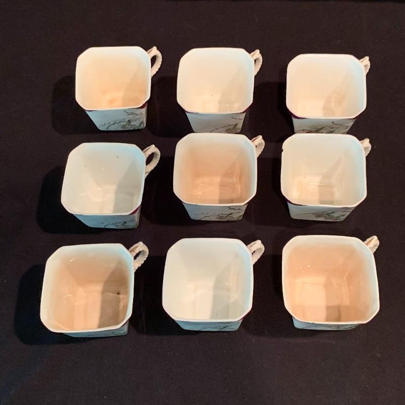 According to a handwritten note written by antique dealer Mary Linn Coldiron to Mr. and Mrs. Olson when they purchased this breathtaking set of China in 1973, it was made by Sampson Bridgwood & Son in Longton, England in 1885. This set features a beautiful and very elegant floral design, with metallic golden accents throughout. The set includes one teapot, one 6” tall pitcher for cream and a 7.5” tall lidded container for sugar, nine teacups, twelve 5.5” saucers, twelve 5.5” bread plates, twelve 7” entree plates, and one 6” square dish. Both sugar and creamer have small cracks, only a couple chips were noticed, but make an appointment for the preview and check out each piece for yourself! See photos. Shipping available.