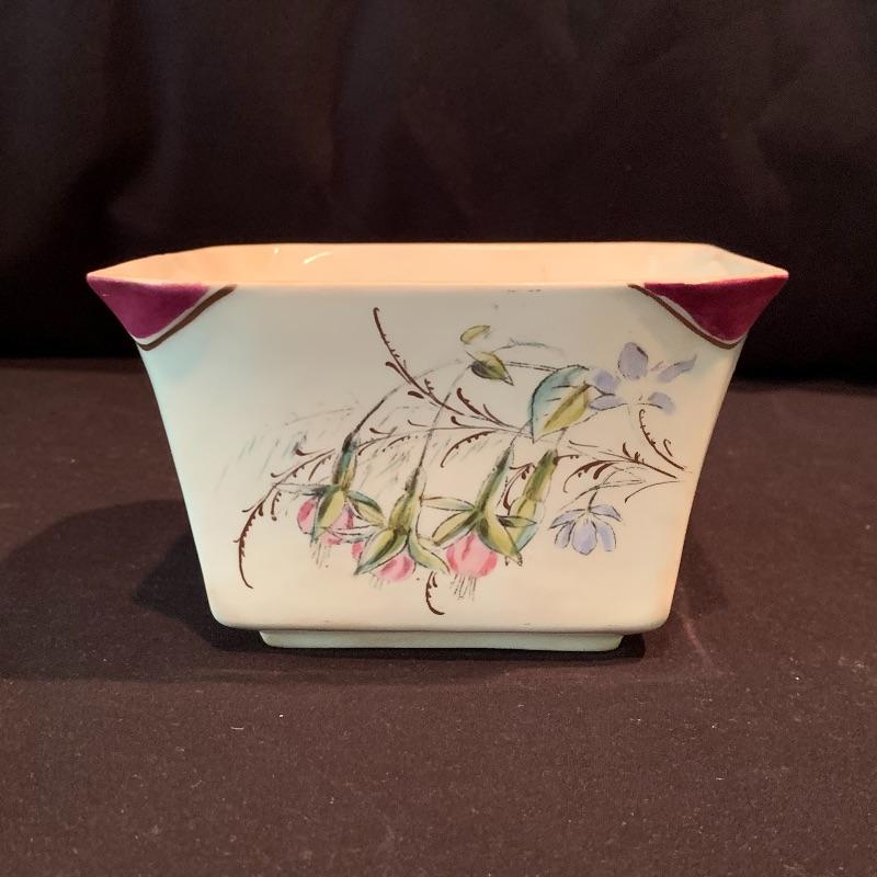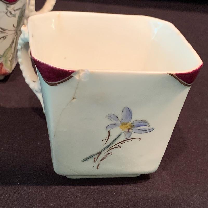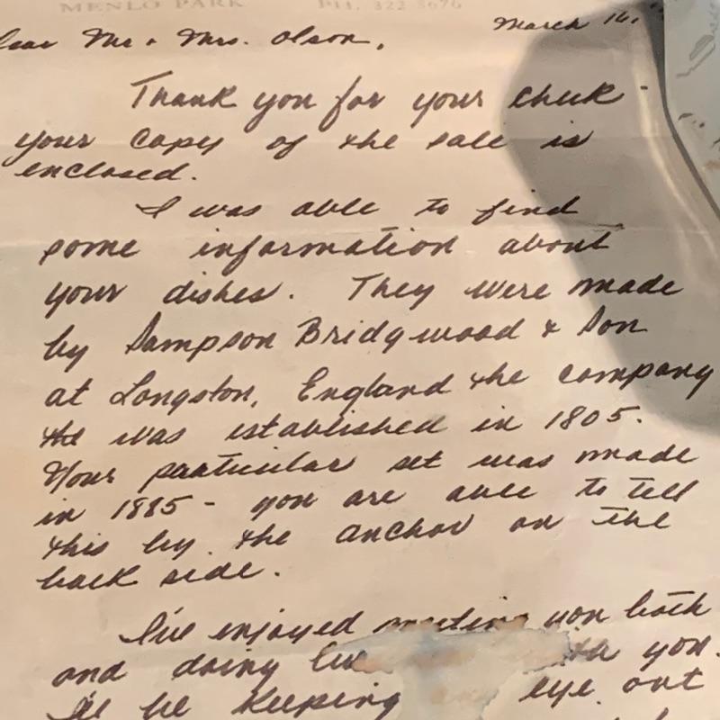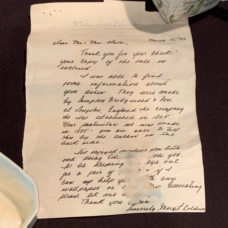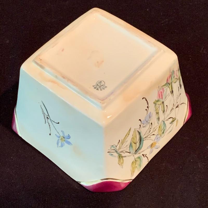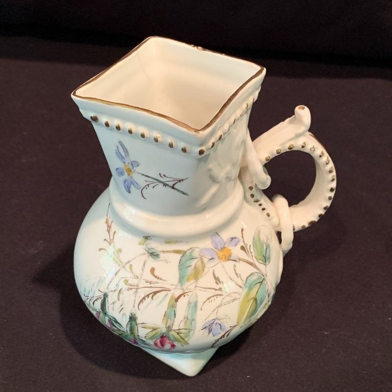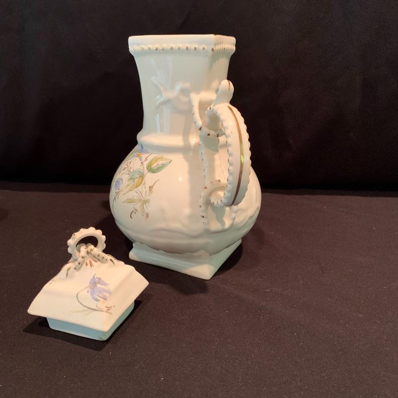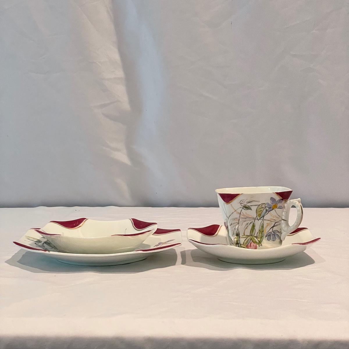 According to a handwritten note written by antique dealer Mary Linn Coldiron to Mr. and Mrs. Olson when they purchased this breathtaking set of China in 1973, it was made by Sampson Bridgwood & Son in Longton, England in 1885. This set features a beautiful and very elegant floral design, with metallic golden accents throughout. The set includes one teapot, one 6” tall pitcher for cream and a 7.5” tall lidded container for sugar, nine teacups, twelve 5.5” saucers, twelve 5.5” bread plates, twelve 7” entree plates, and one 6” square dish. Both sugar and creamer have small cracks, only a couple chips were noticed, but make an appointment for the preview and check out each piece for yourself! See photos. Shipping available.