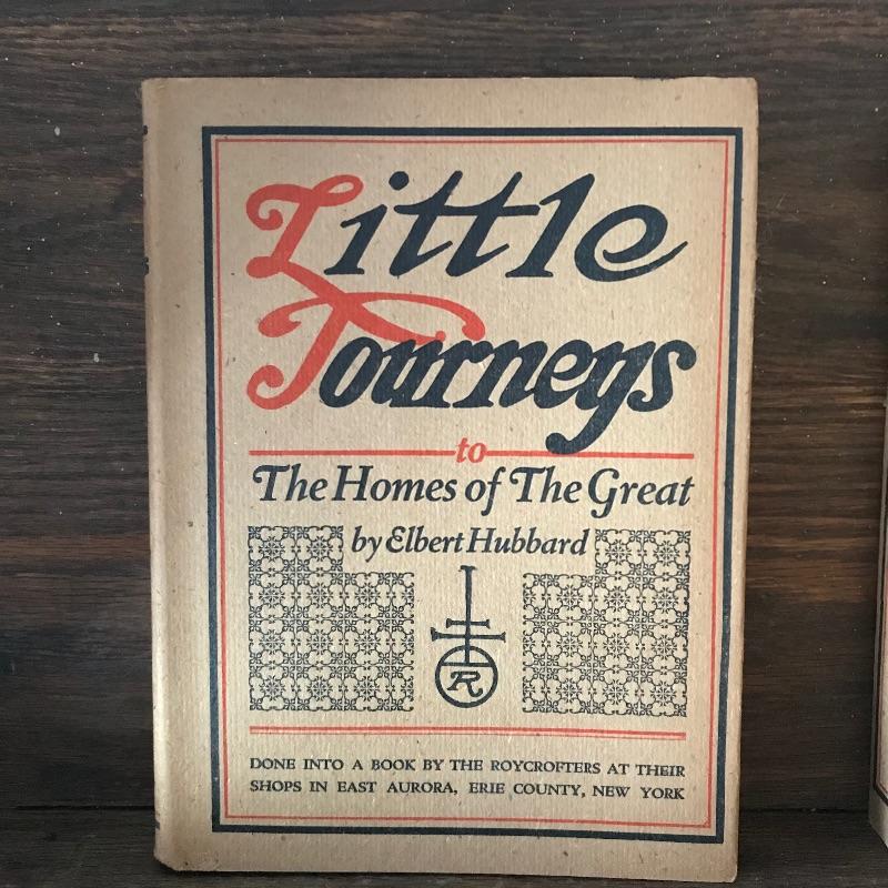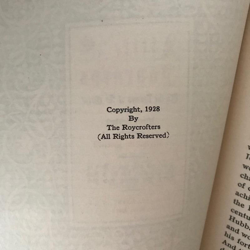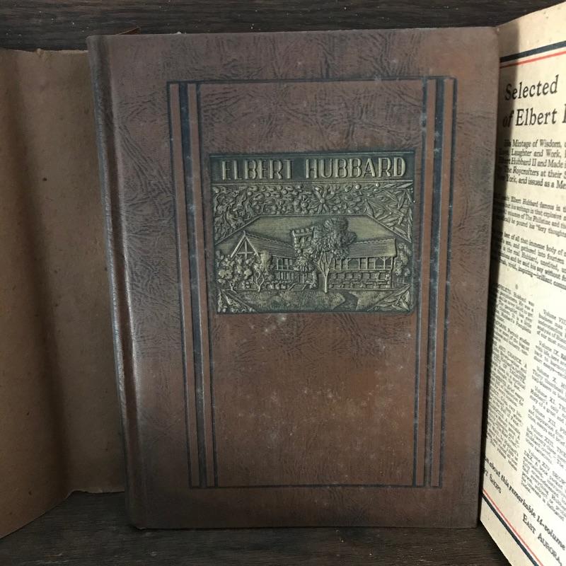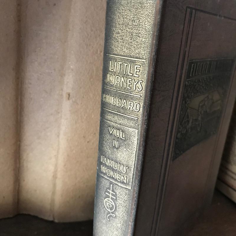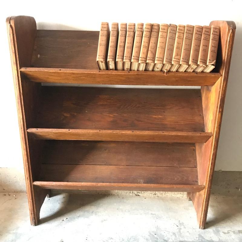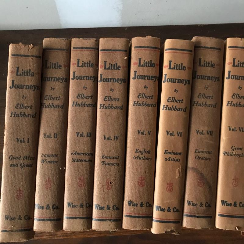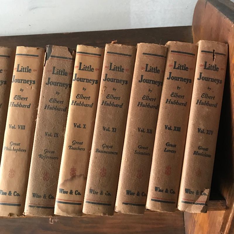 Fascinating collection of Little Journeys volumes I through XIV paired with a solid wood Arts & Crafts style book shelf. The collection of Elbert Hubbard books have a Roycrofters copyright 1928. Each book has a paper cover, some in better condition than others, over a gorgeous leather-like faced hard cover. Books are in remarkable condition and very dusty. They are a perfect companion for this lovely Arts & Crafts solid wood shelf. This three shelf unit does not appear to have a maker’s stamp and stands 38.75” x 11.75” x 44”. Piece has display style shelves, minute Arts & Crafts details and beautiful wood grain. It appears there may be some paint splatter on the top shelf, but it can be easily hidden by your new Elbert Hubbard books. See photos.