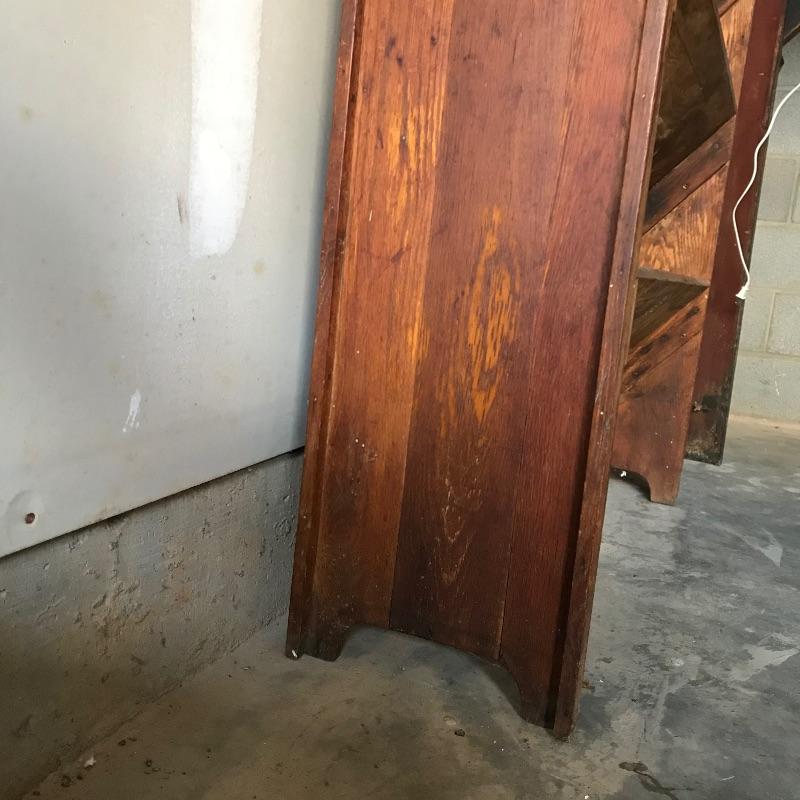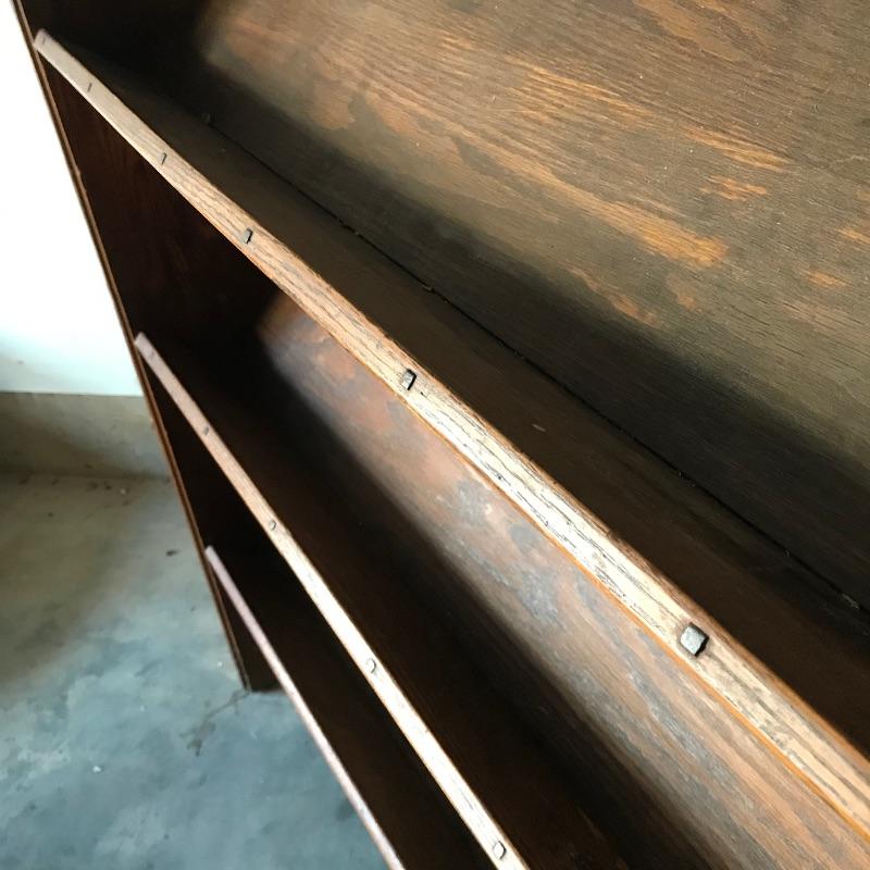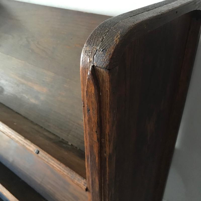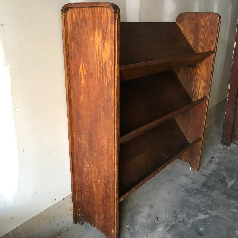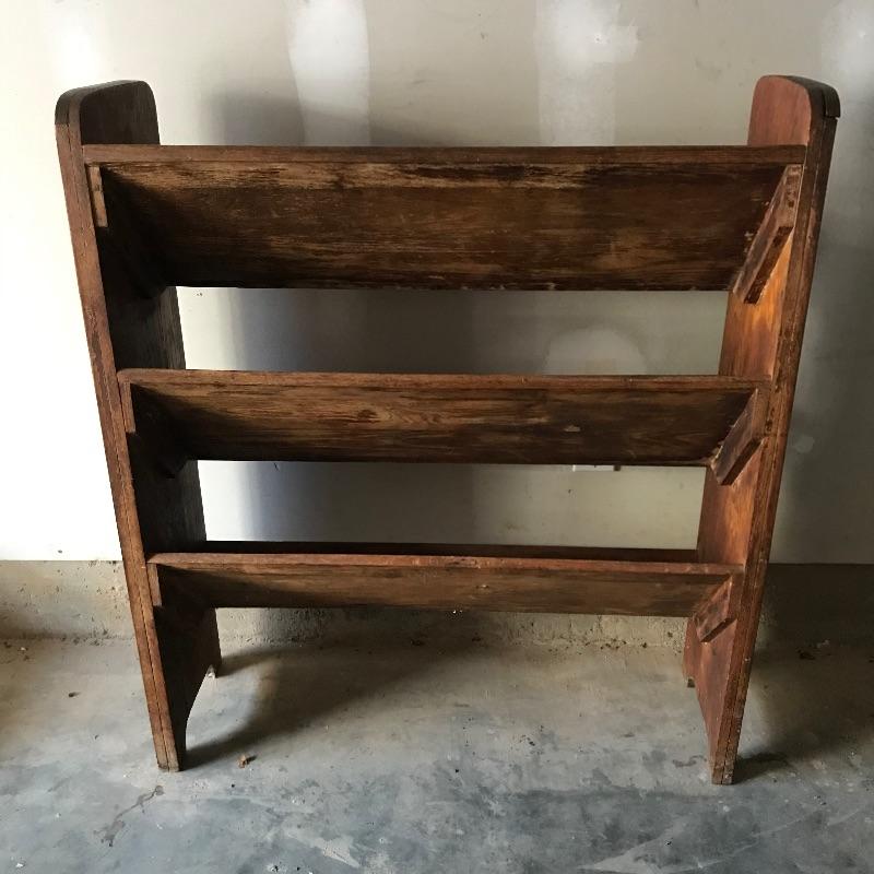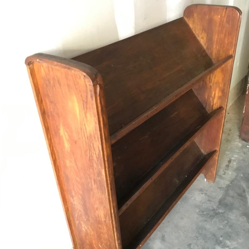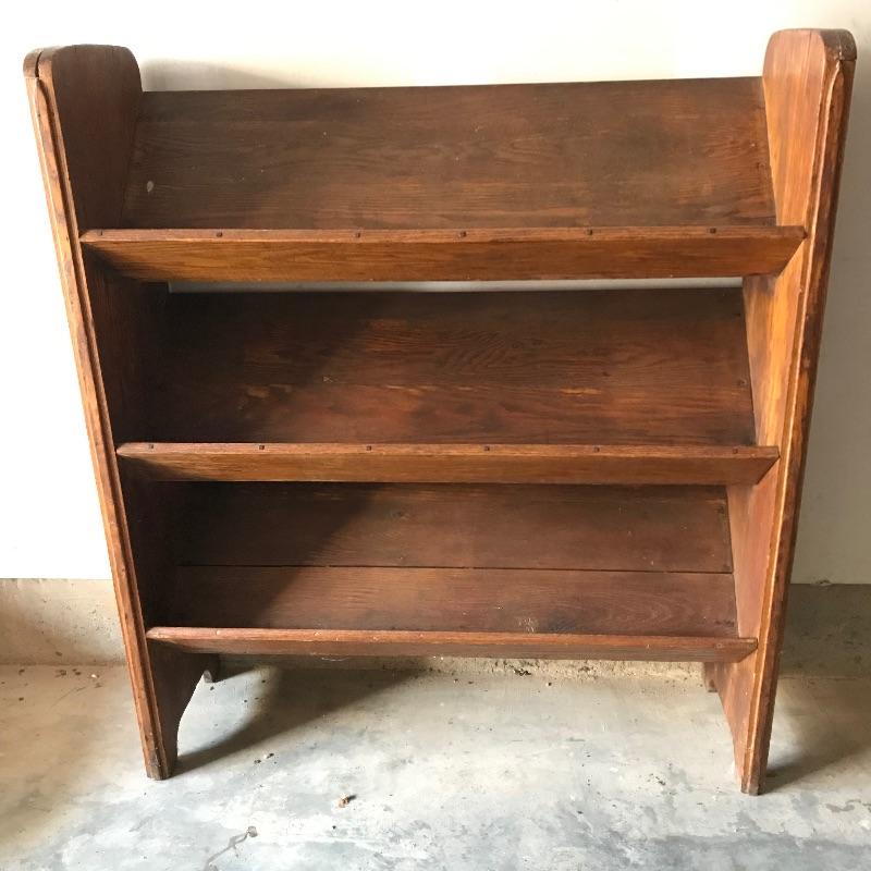 Fascinating collection of Little Journeys volumes I through XIV paired with a solid wood Arts & Crafts style book shelf. The collection of Elbert Hubbard books have a Roycrofters copyright 1928. Each book has a paper cover, some in better condition than others, over a gorgeous leather-like faced hard cover. Books are in remarkable condition and very dusty. They are a perfect companion for this lovely Arts & Crafts solid wood shelf. This three shelf unit does not appear to have a maker’s stamp and stands 38.75” x 11.75” x 44”. Piece has display style shelves, minute Arts & Crafts details and beautiful wood grain. It appears there may be some paint splatter on the top shelf, but it can be easily hidden by your new Elbert Hubbard books. See photos.