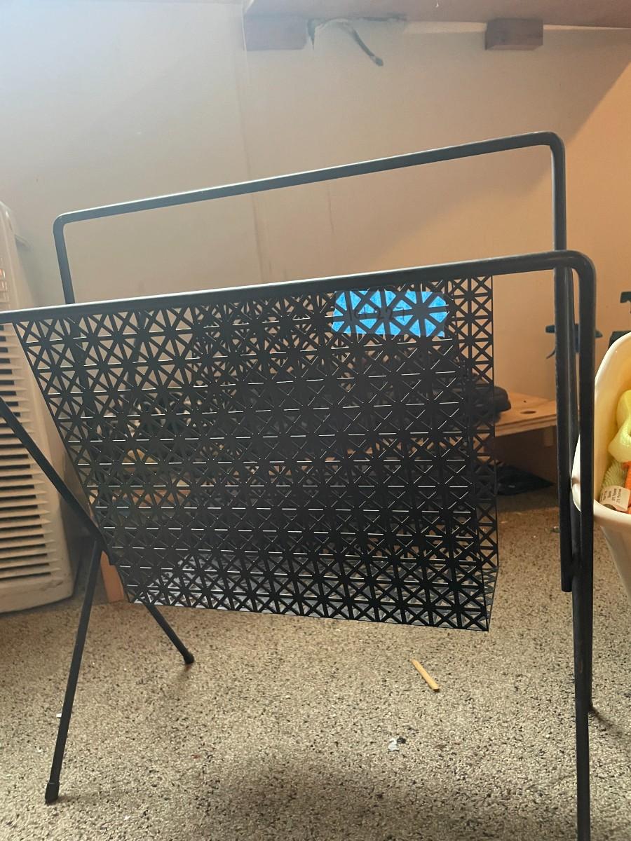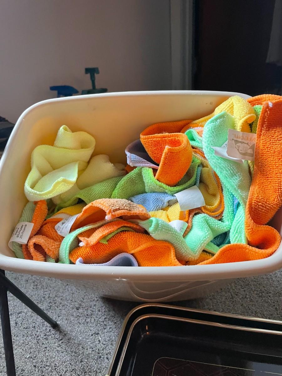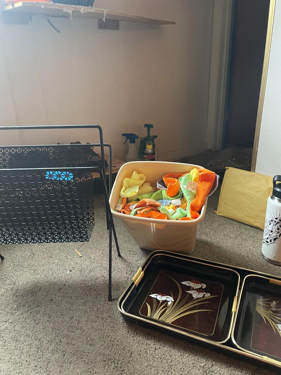 lot 227- magazine rack, set of (3) trays, box of microfiber rags