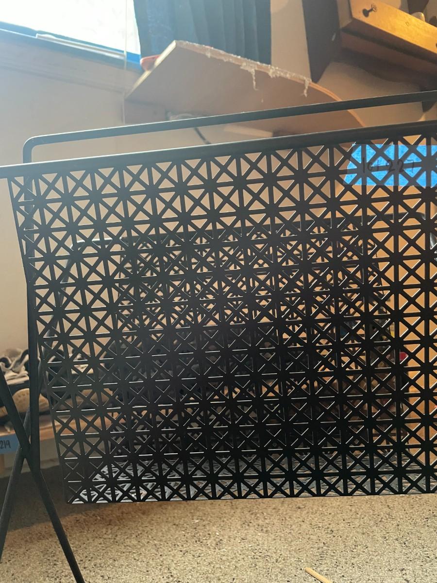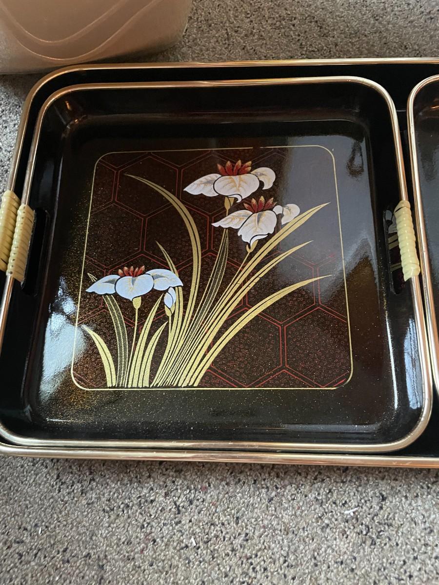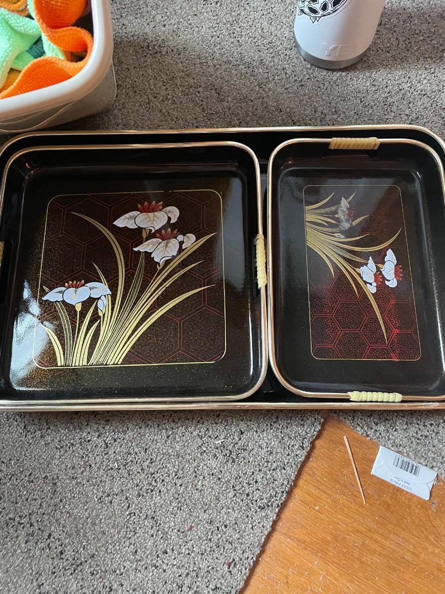 lot 227- magazine rack, set of (3) trays, box of microfiber rags