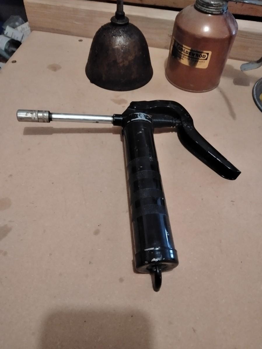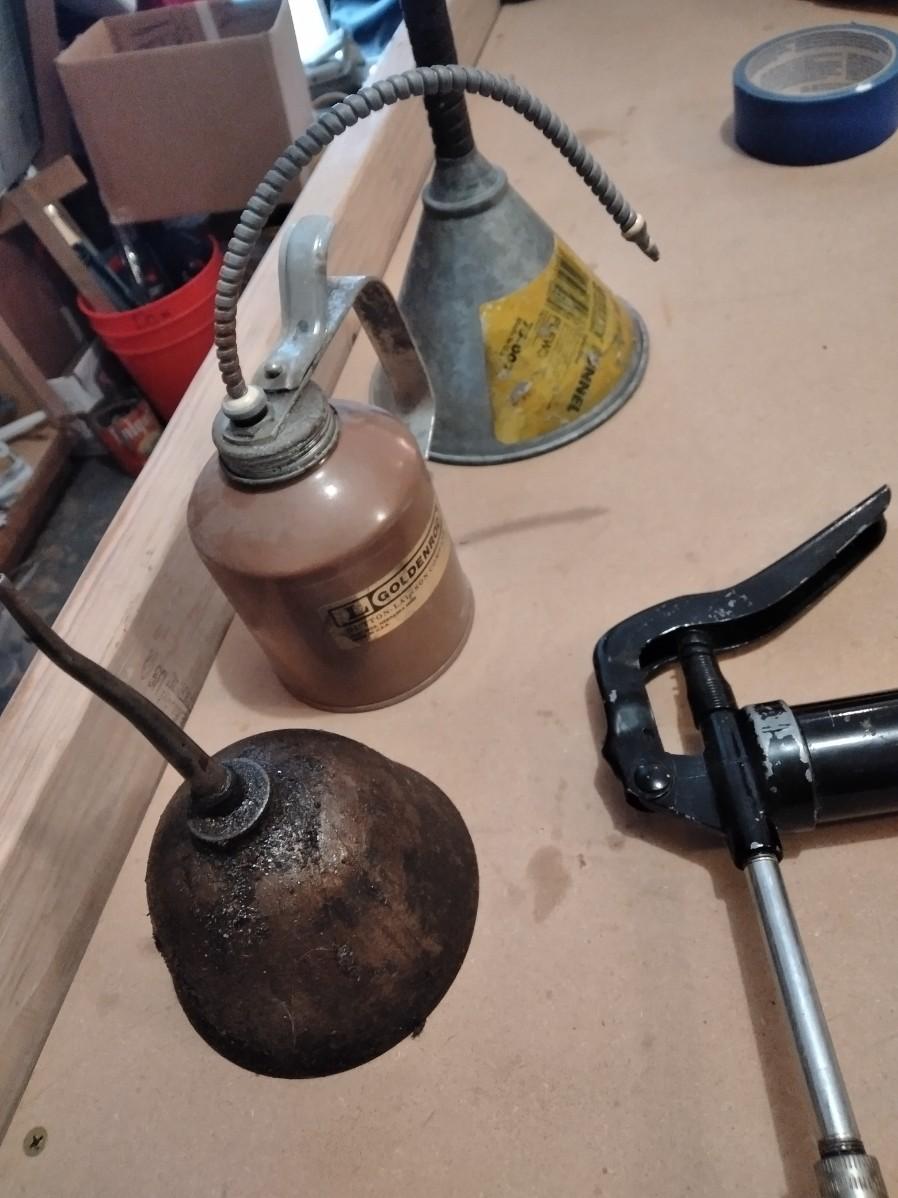 TWO METAL OIL CANS, A GREASE GUN AND METAL FUNNEL