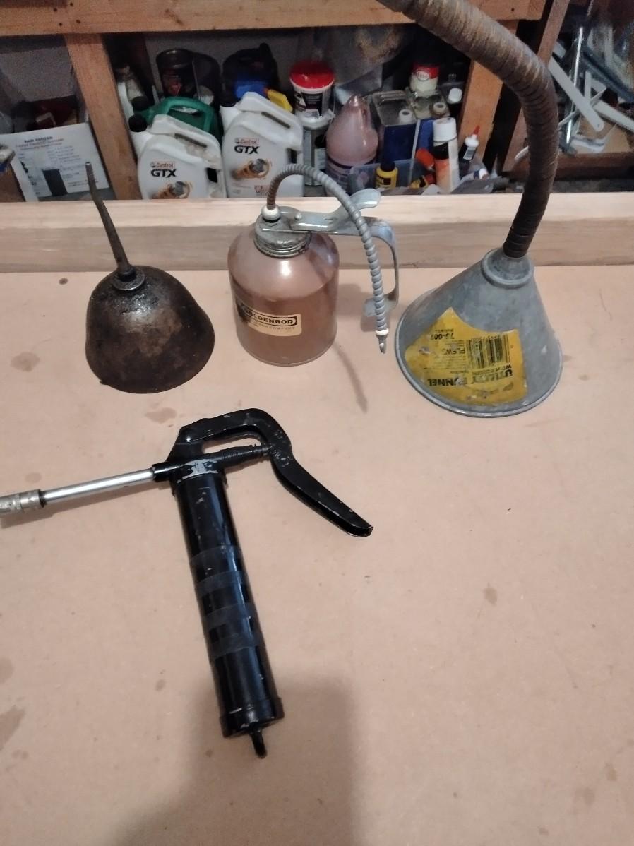 LOT 227 METAL OIL CANS, GREASE GUN AND FUNNEL