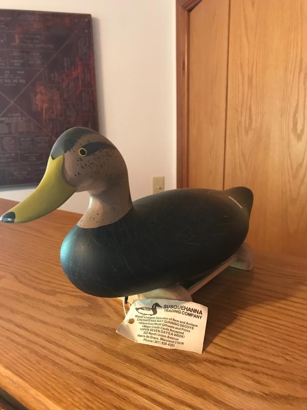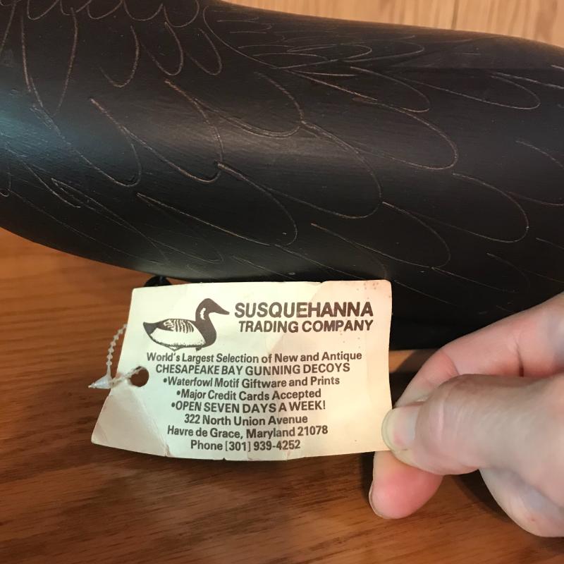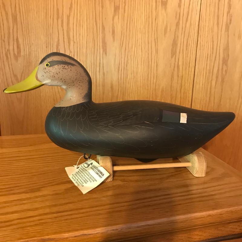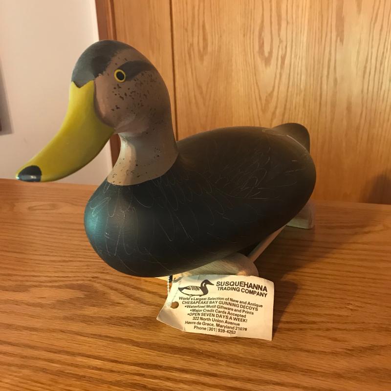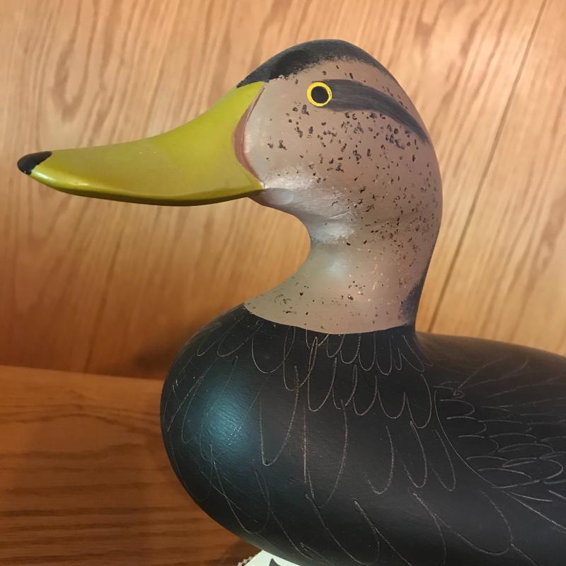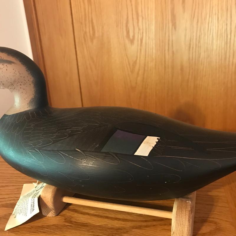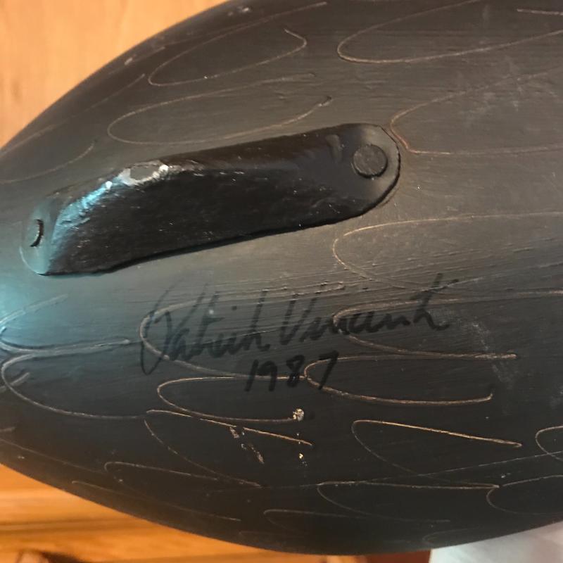 1987 signed Patrick Vincent decoy measuring 17” long. Comes with stand. Lot is available for shipping or local pick up in Horseshoe, NC.