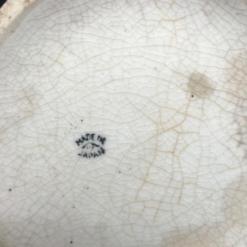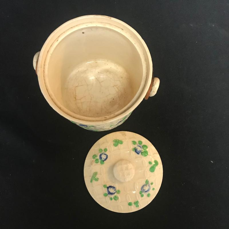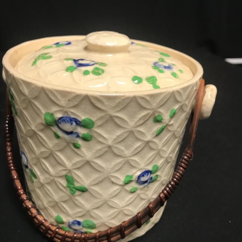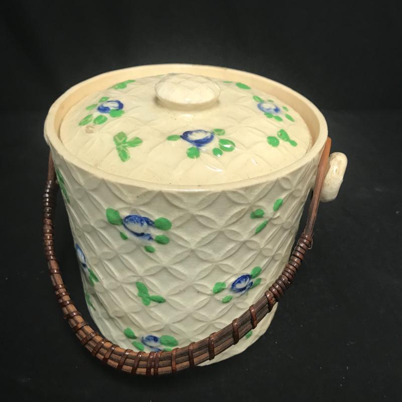 Belleek style but made in Japan. Cream colored with blue flowers and wicker handle measures 5” x 5”. Shipping available.