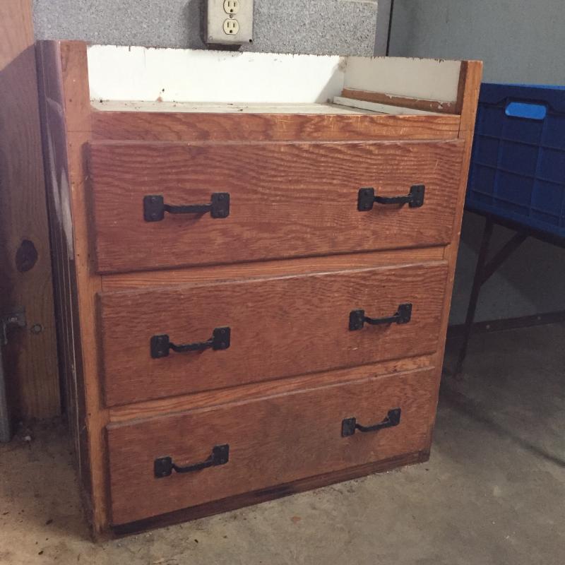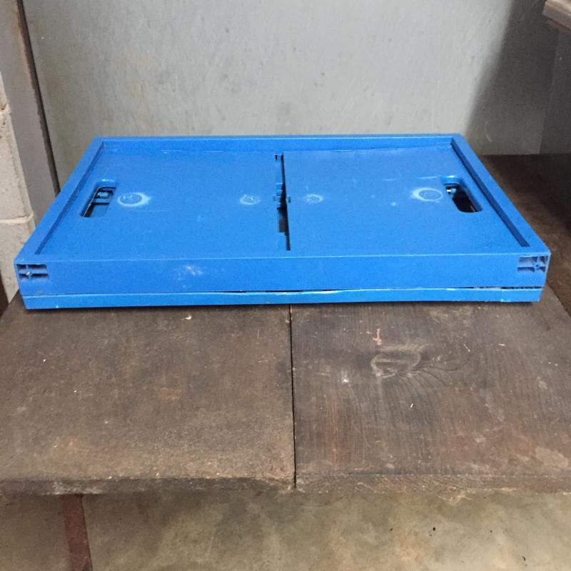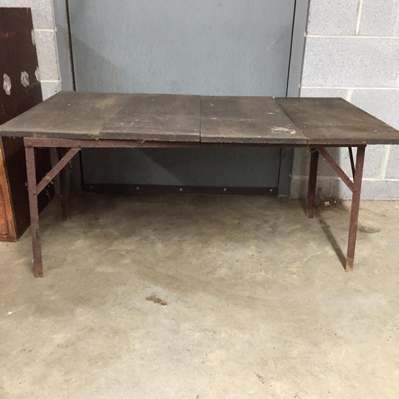 Furniture in collection includes a metal framed table with a four piece panel top and a three-drawer wooden cabinet. Lot also includes a collapsible crate and other plastic storage, see photos. Table top measures 27” x 47”. No shipping.
