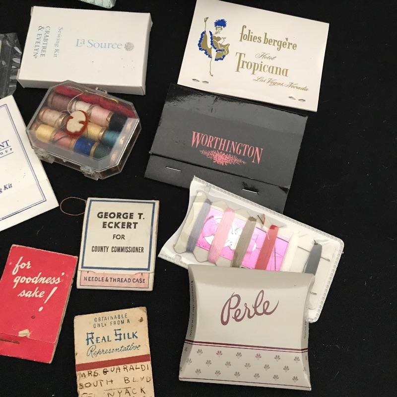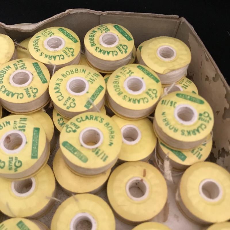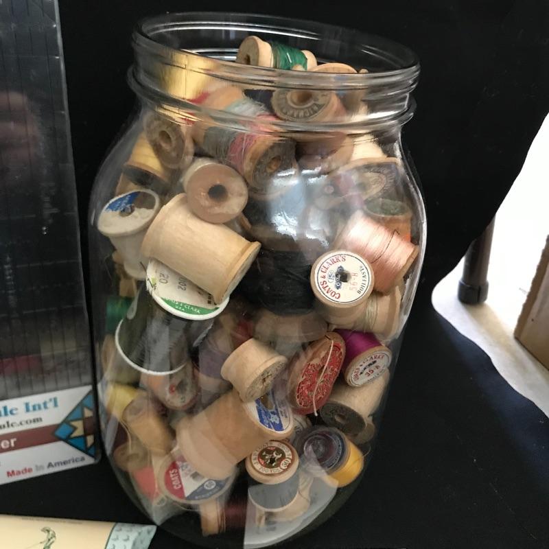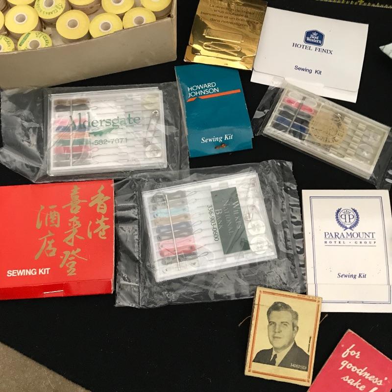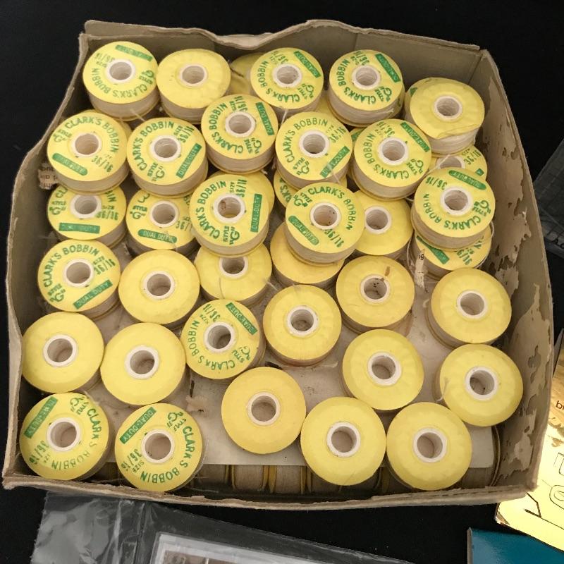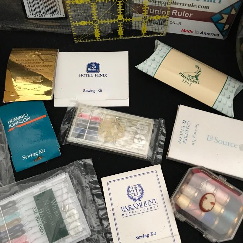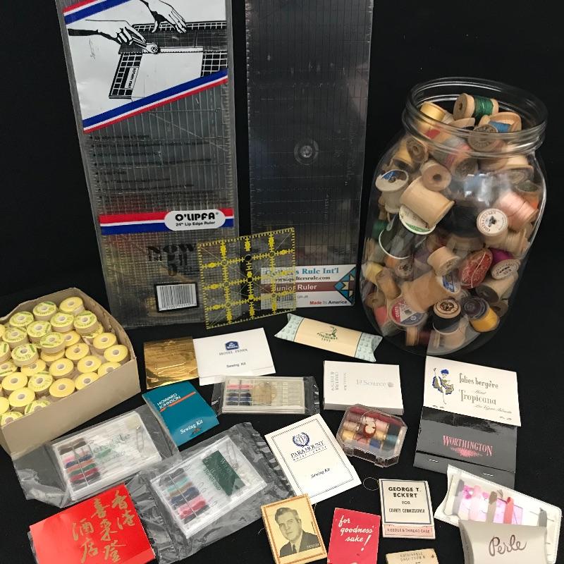 Lot includes dozens of Clark’s Bobbins, a large jar full of wooden spools of thread, two O’Lipfa lip edge rulers, a junior ruler by Quilters Rule Int’l, and a collection of sewing kits from hotels and businesses, etc. See pics. Shipping available.