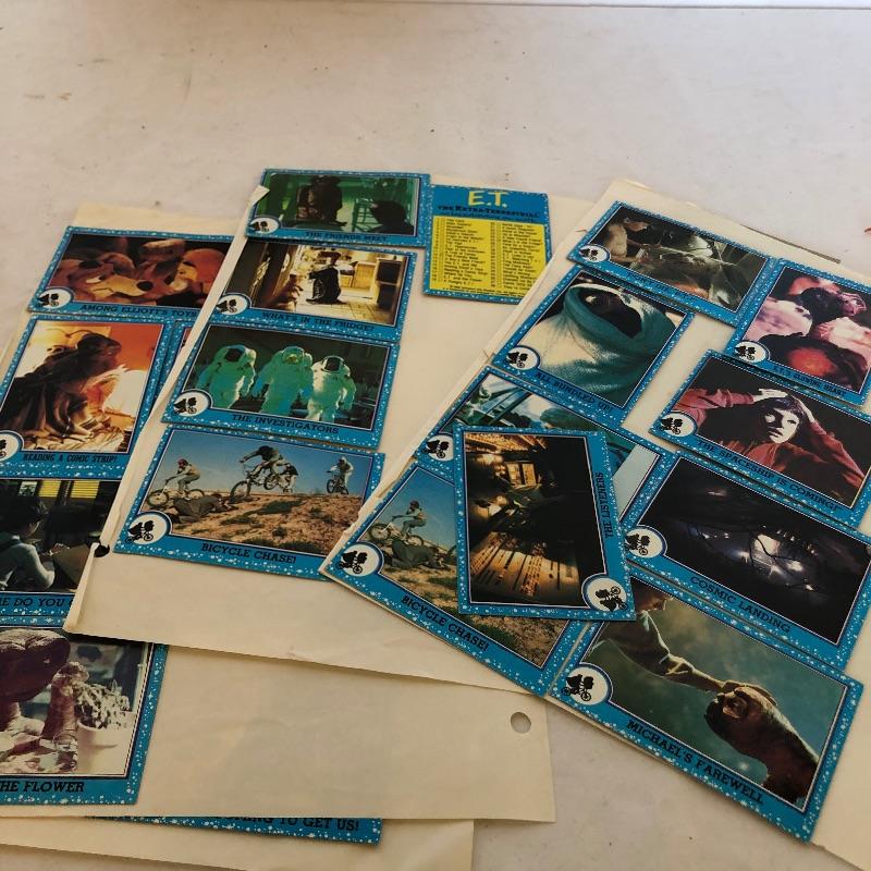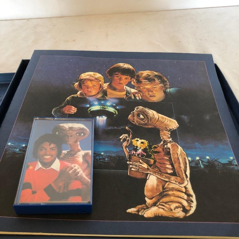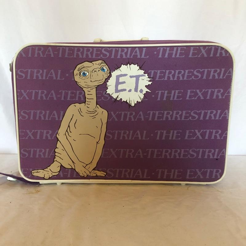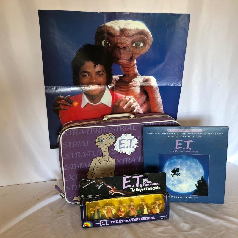 Own some E.T vintage memorabilia with this lot. Included is a purple suitcase, original collectibles figures, a cassette special edition with Michael Jackson and some collector cards.