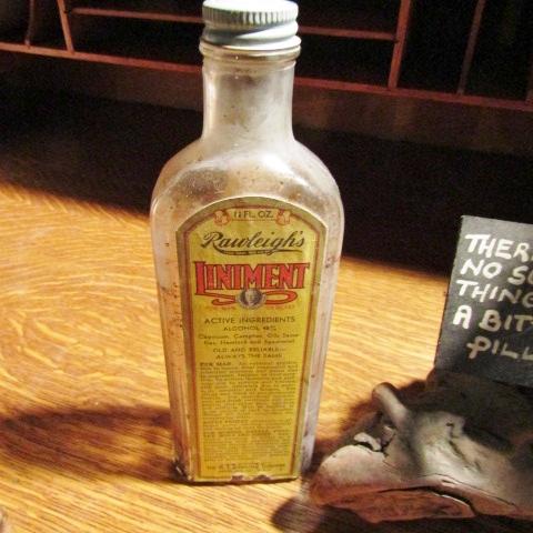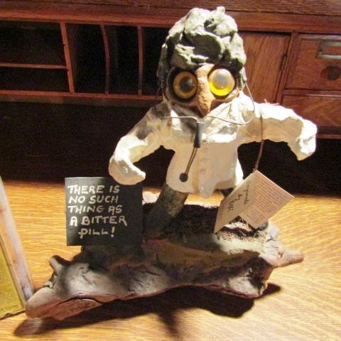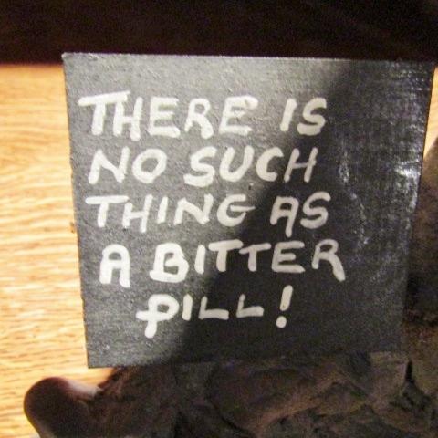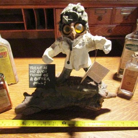 BUG EYED PHARMACIST WITH A SIGN THAT READS, "THERE IS NO SUCH THING AS A BITTER PILL" ALL VINTAGE BOTTLES ARE GLASS, THEY ARE EMPTY AND IN GOOD CONDITION