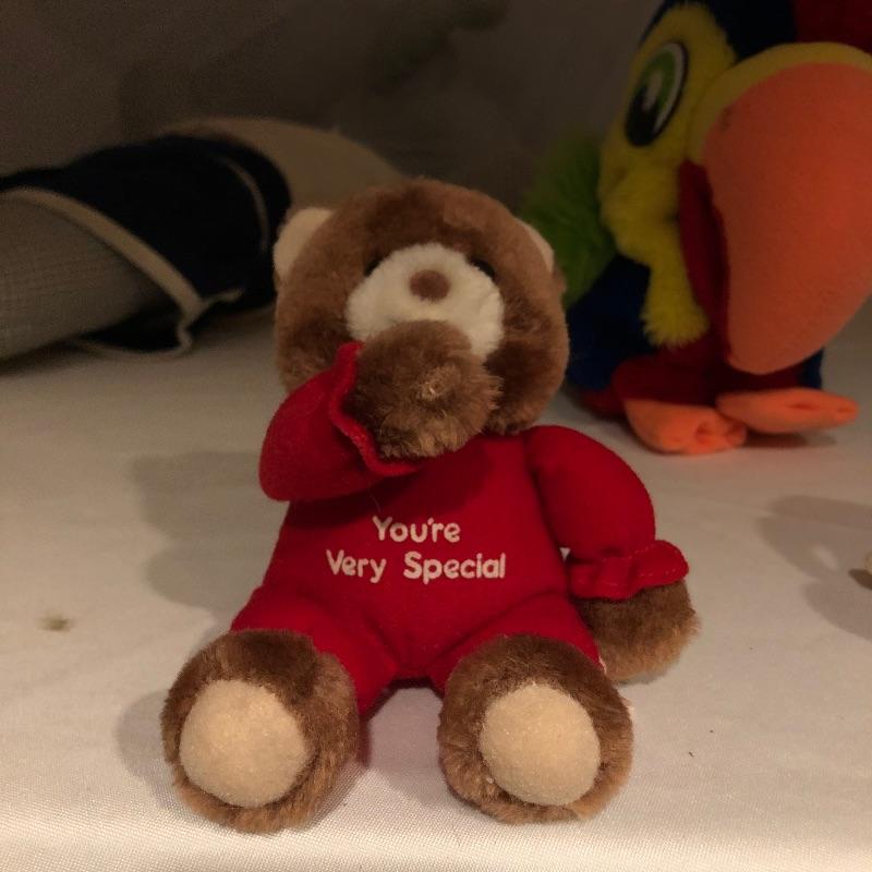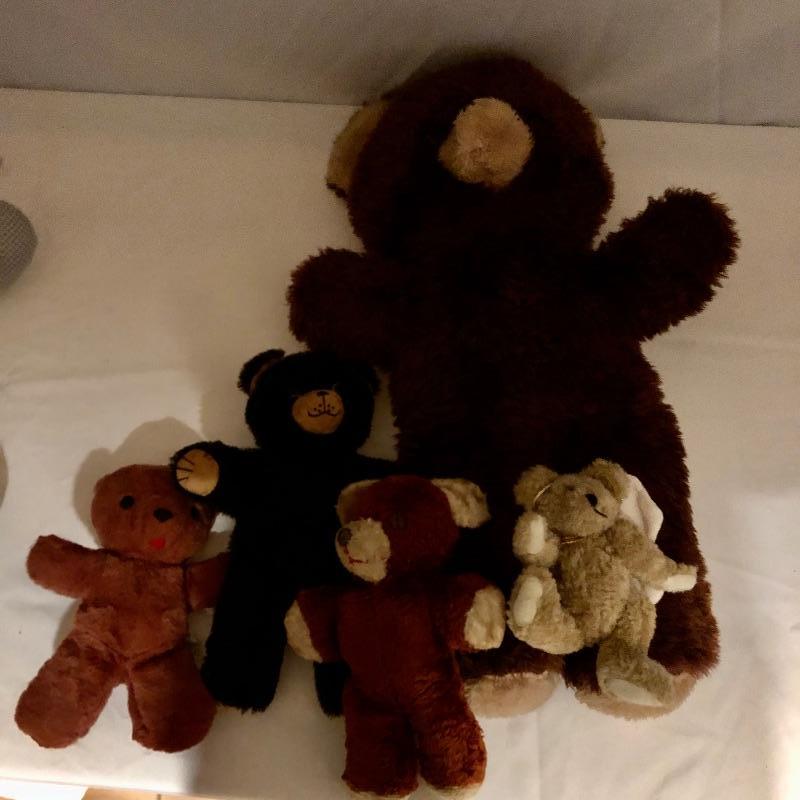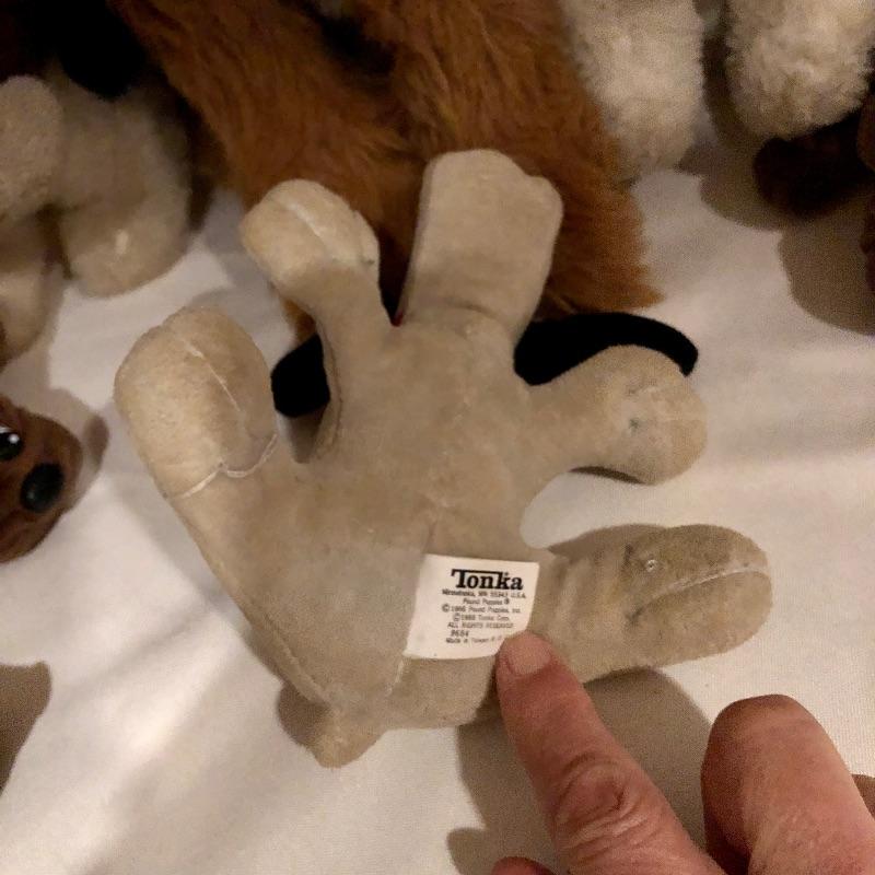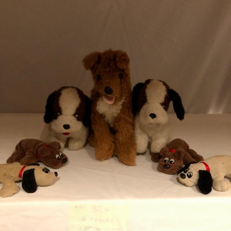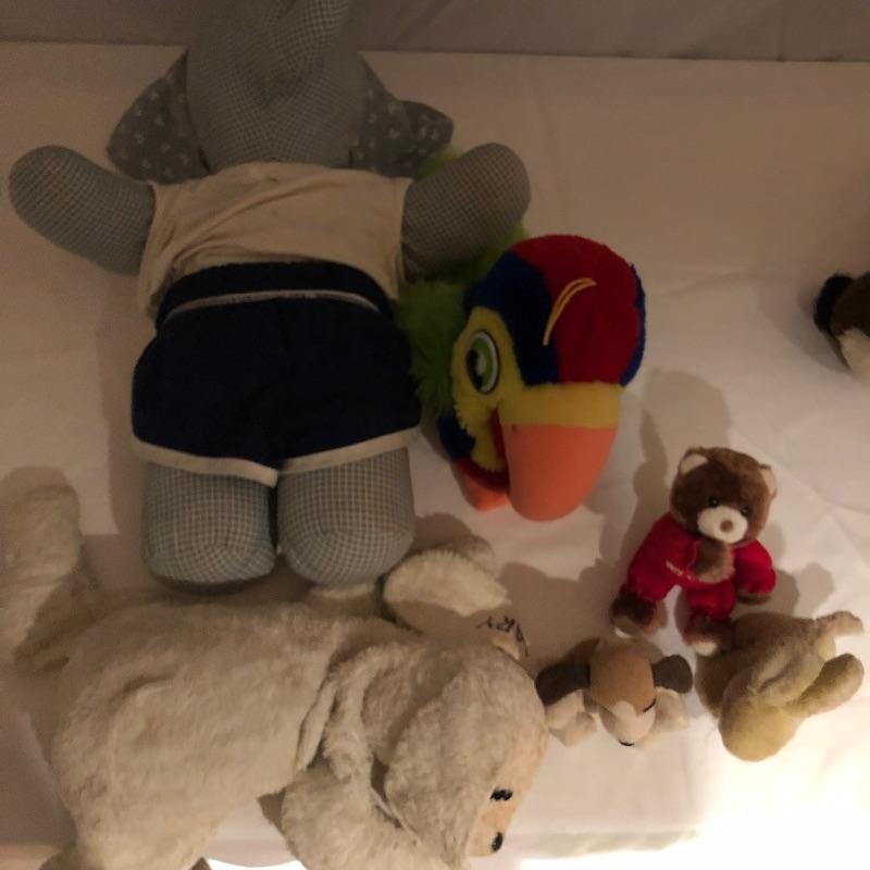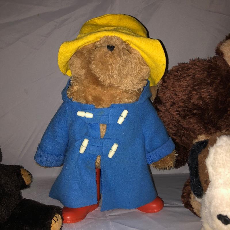 Nostalgic collection of vintage stuffed animals here with none other than Paddington Bear himself, resplendent in his red rubber boots that are stamped 1977. Keeping him company until he gets adopted are a plethora of other vintage bears, bunnies, dogs, an elephant and a parrot puppet. Great lot for a collector of bears or a lucky child. Shipping available.