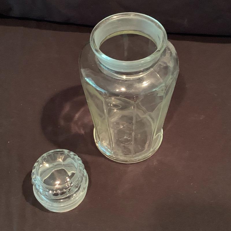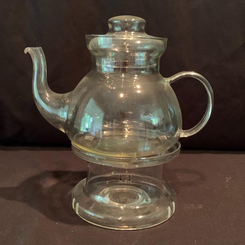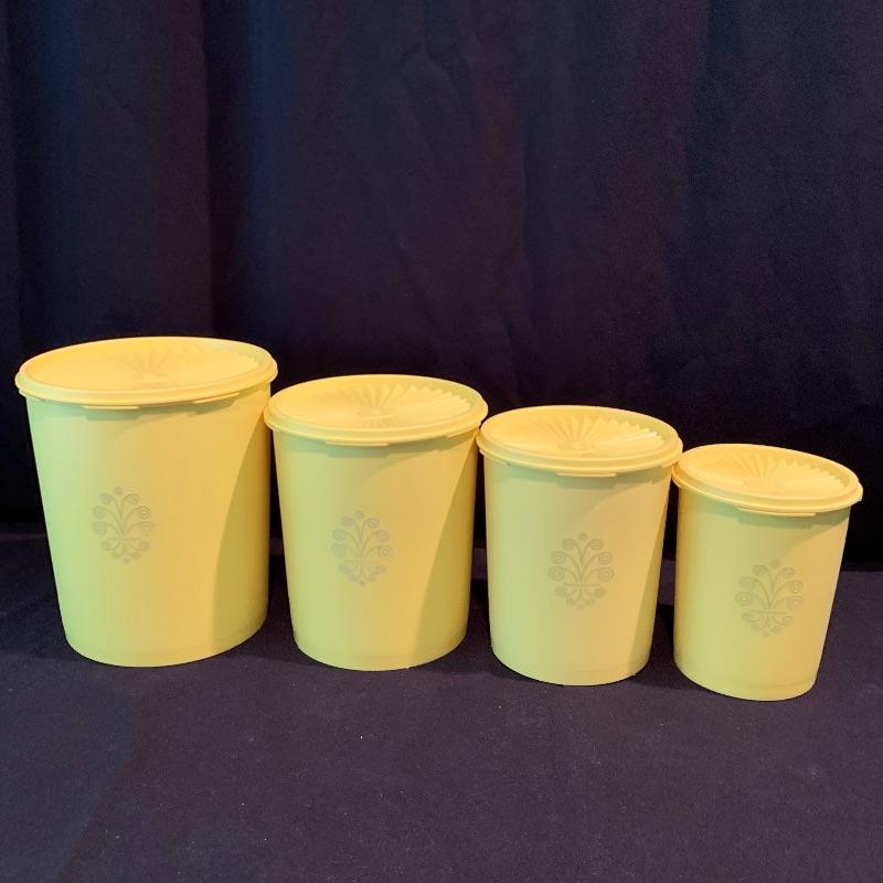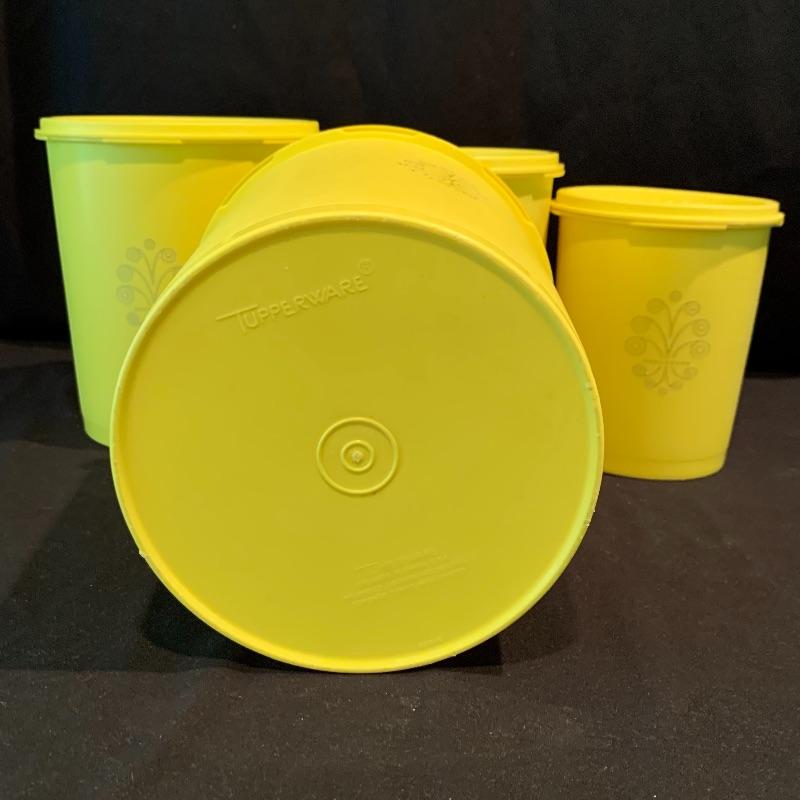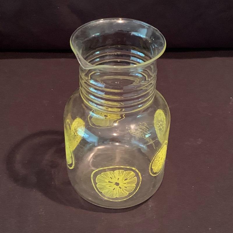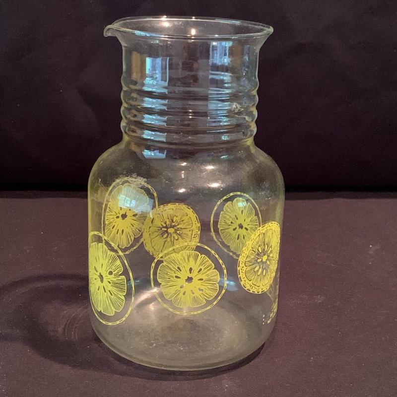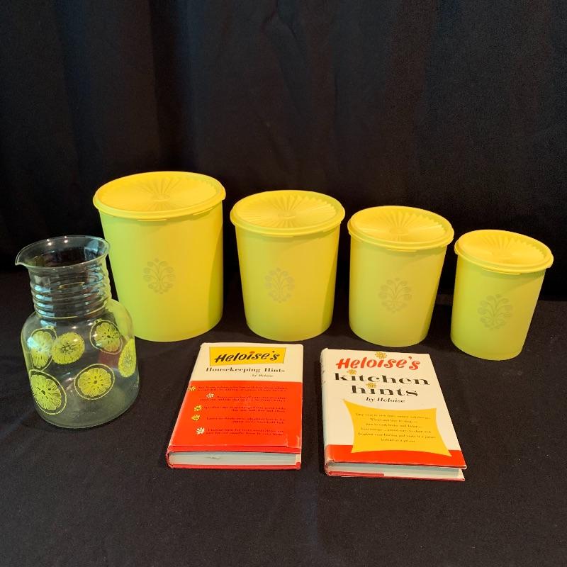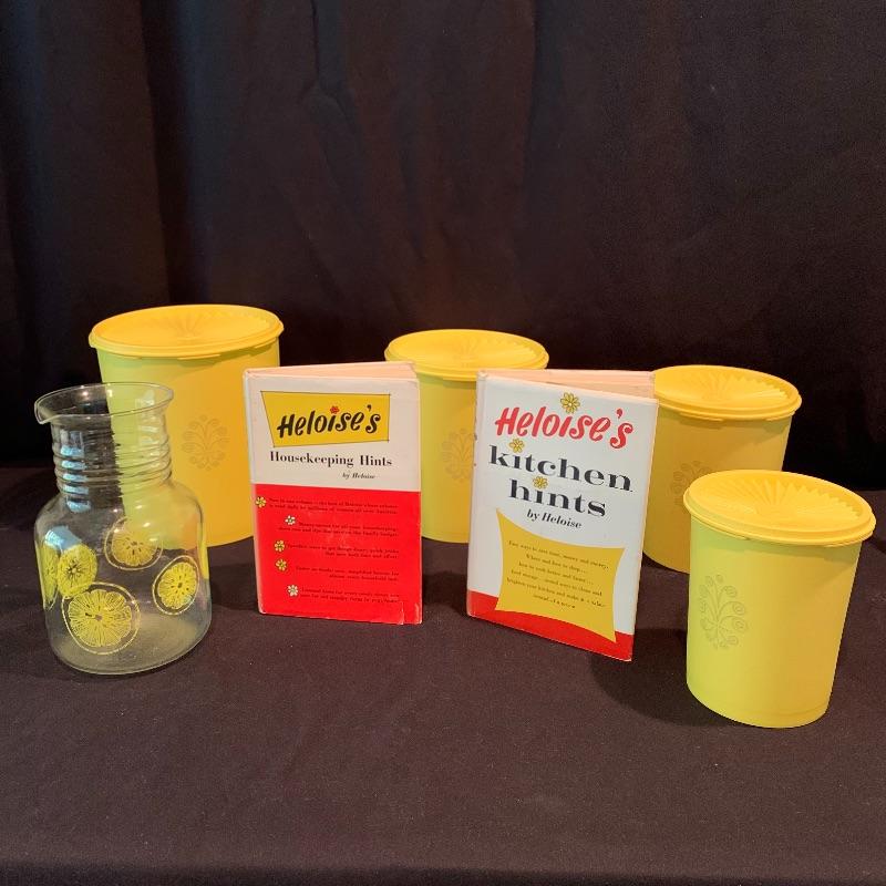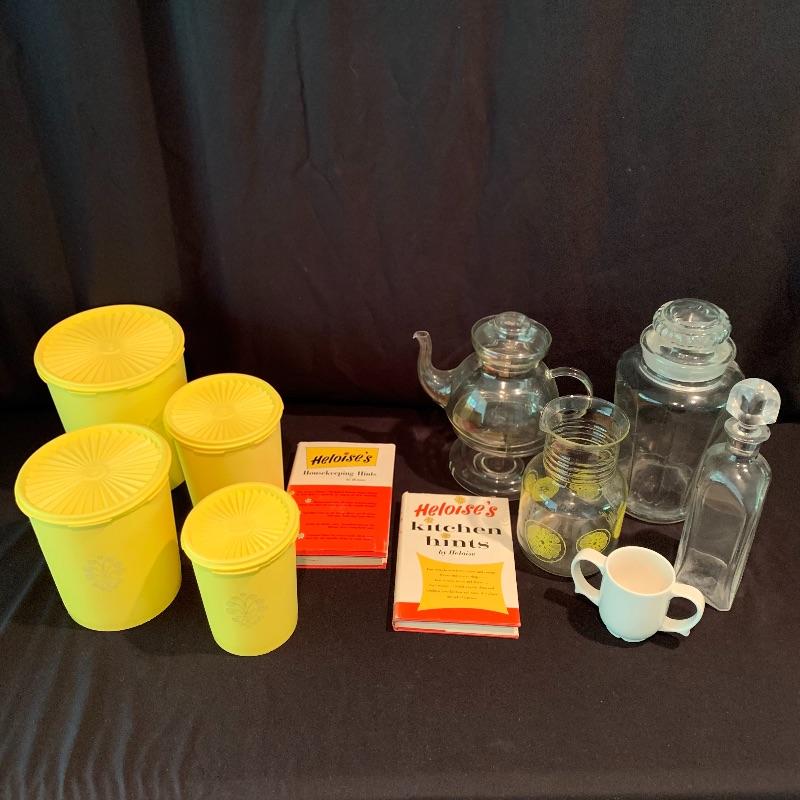 This fun retro kitchen set could brighten up any kitchen. Included is a lemon yellow set of four Tupperware containers with lids. Currently they are stored nested; they decrease in size to fit inside of each other. Get helpful housekeeping and kitchen hints from Heloise with the two hardcover books that are in this lot, both from the 1960s and still in great condition! There is also glassware included that would be perfect for hosting your next party: a Pyrex pitcher decorated with lemon slices, a glass teapot with a stand and spot for a tea light candle to keep your tea warm, a large lidded jar for cookies or candy, and a skinnier diamond shaped glass jar with a glass stopper. Also included is a white mug with interesting handles on both sides. Shipping available.