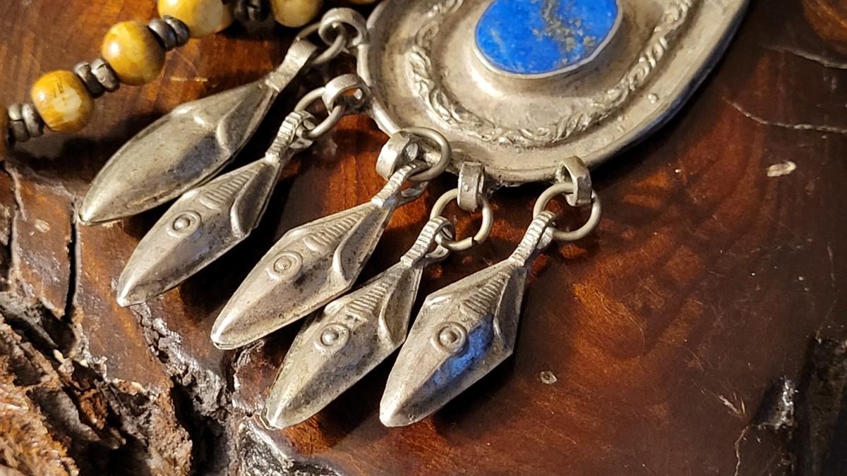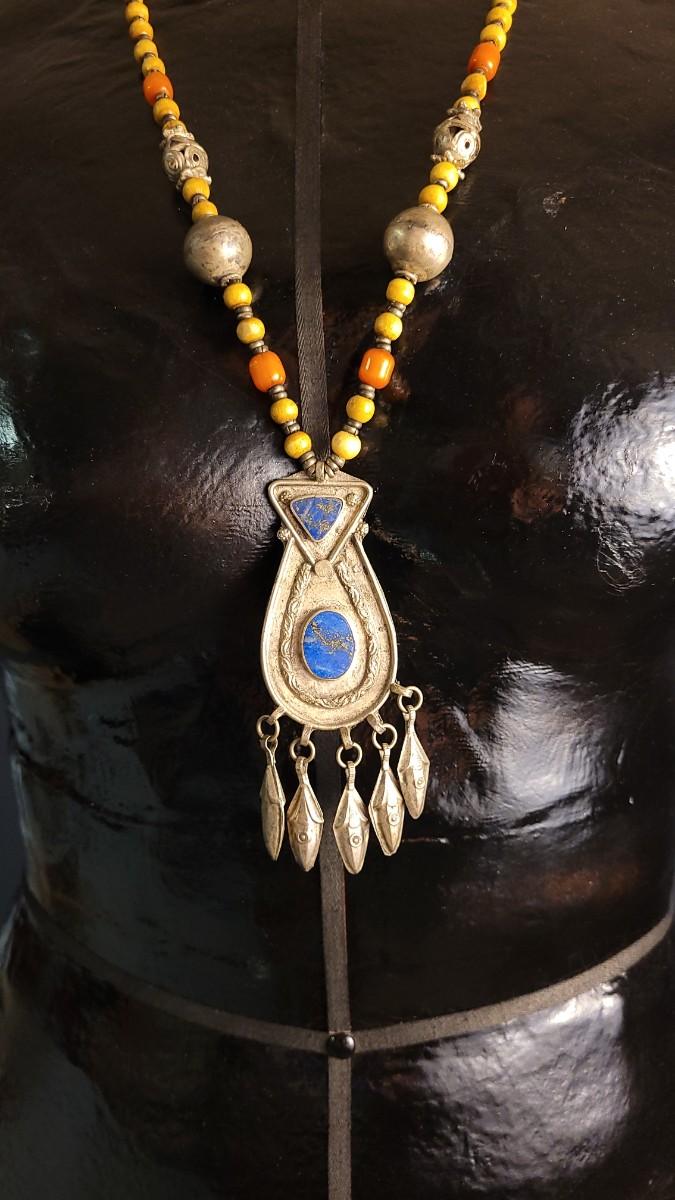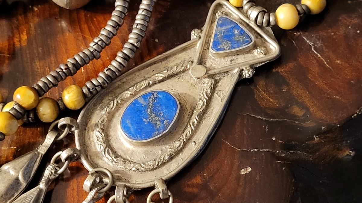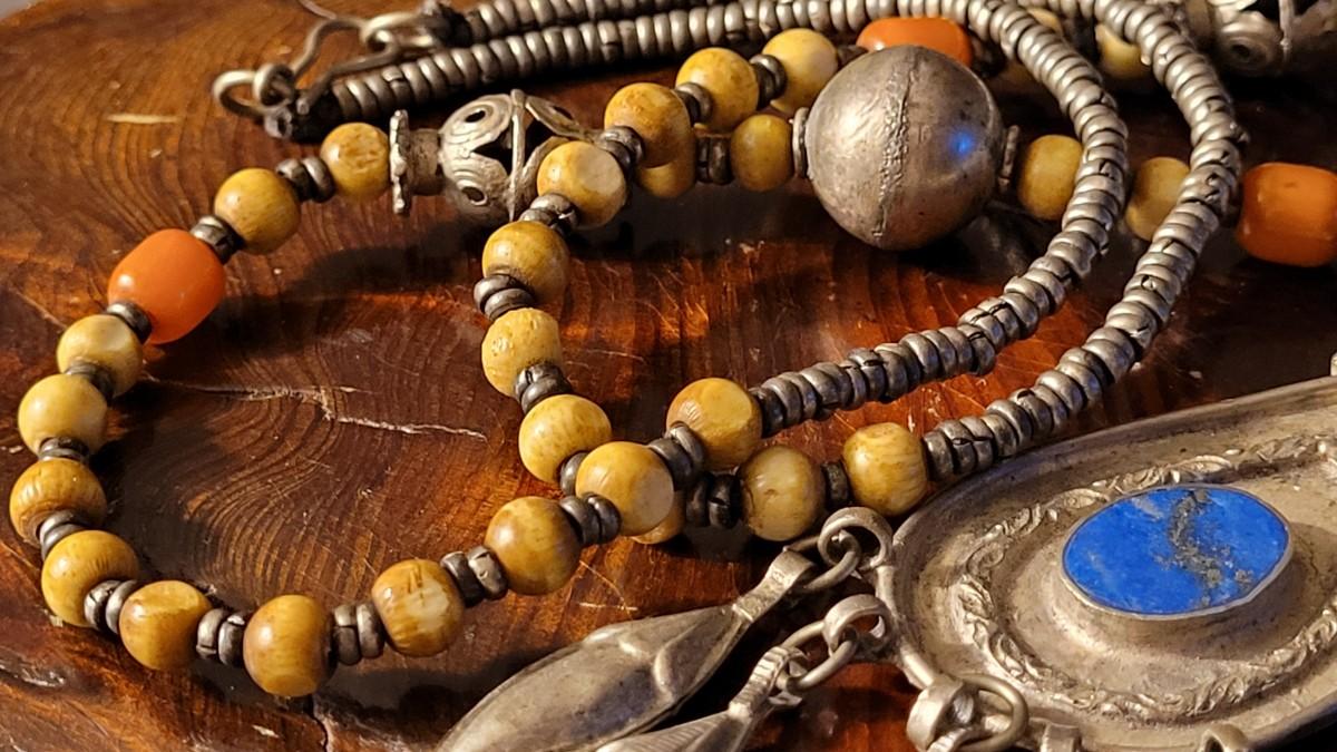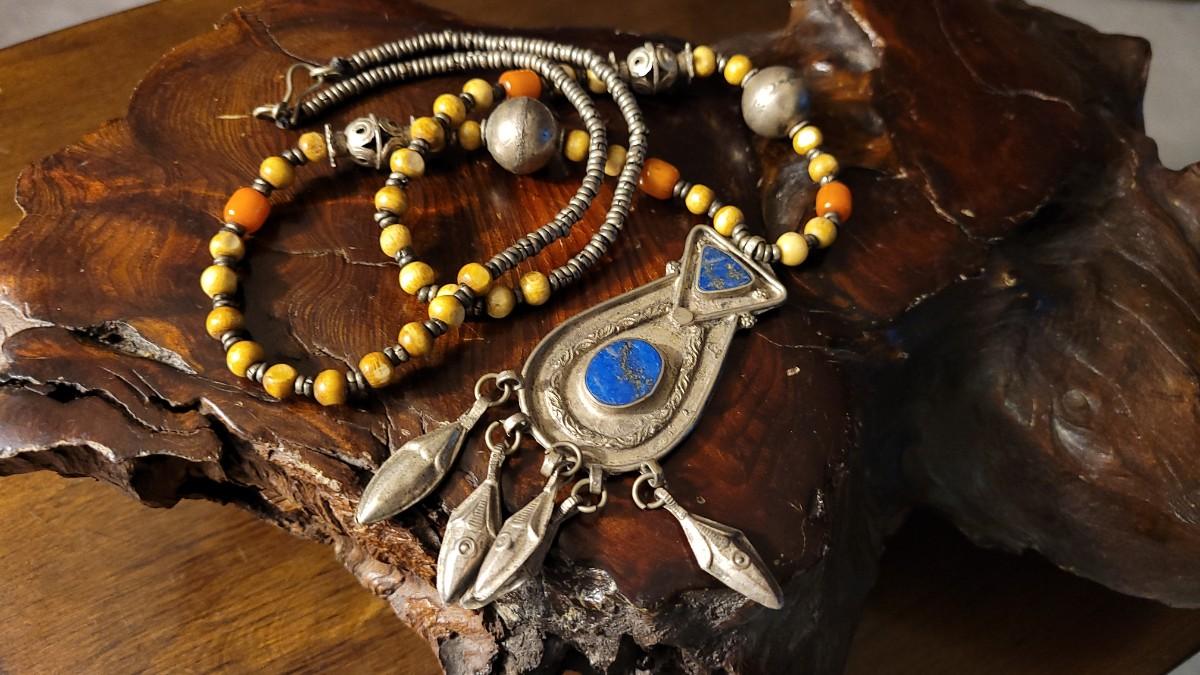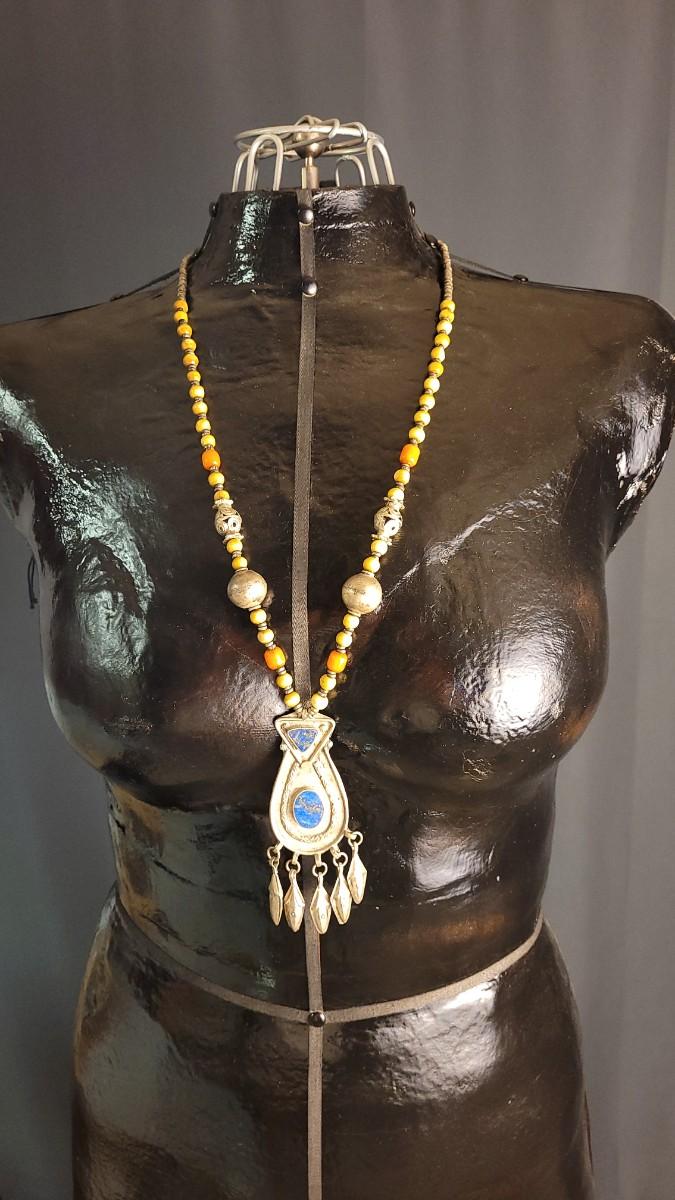 This lot features a Vintage African necklace with a nice assortment of beads. A nice drop Pendant is also blended into the design with (5) Blossom Accents. Not only does this necklace look stunning but also makes a calming sound when worn. 14" Drop. Pendant is 4" w/ Blossom Accents.