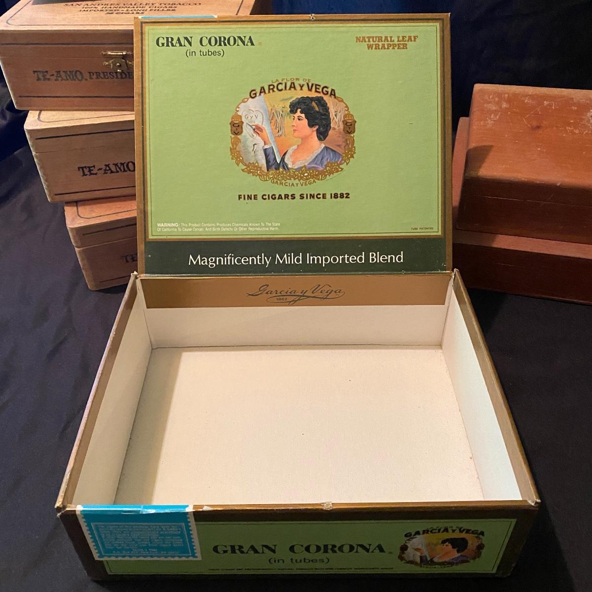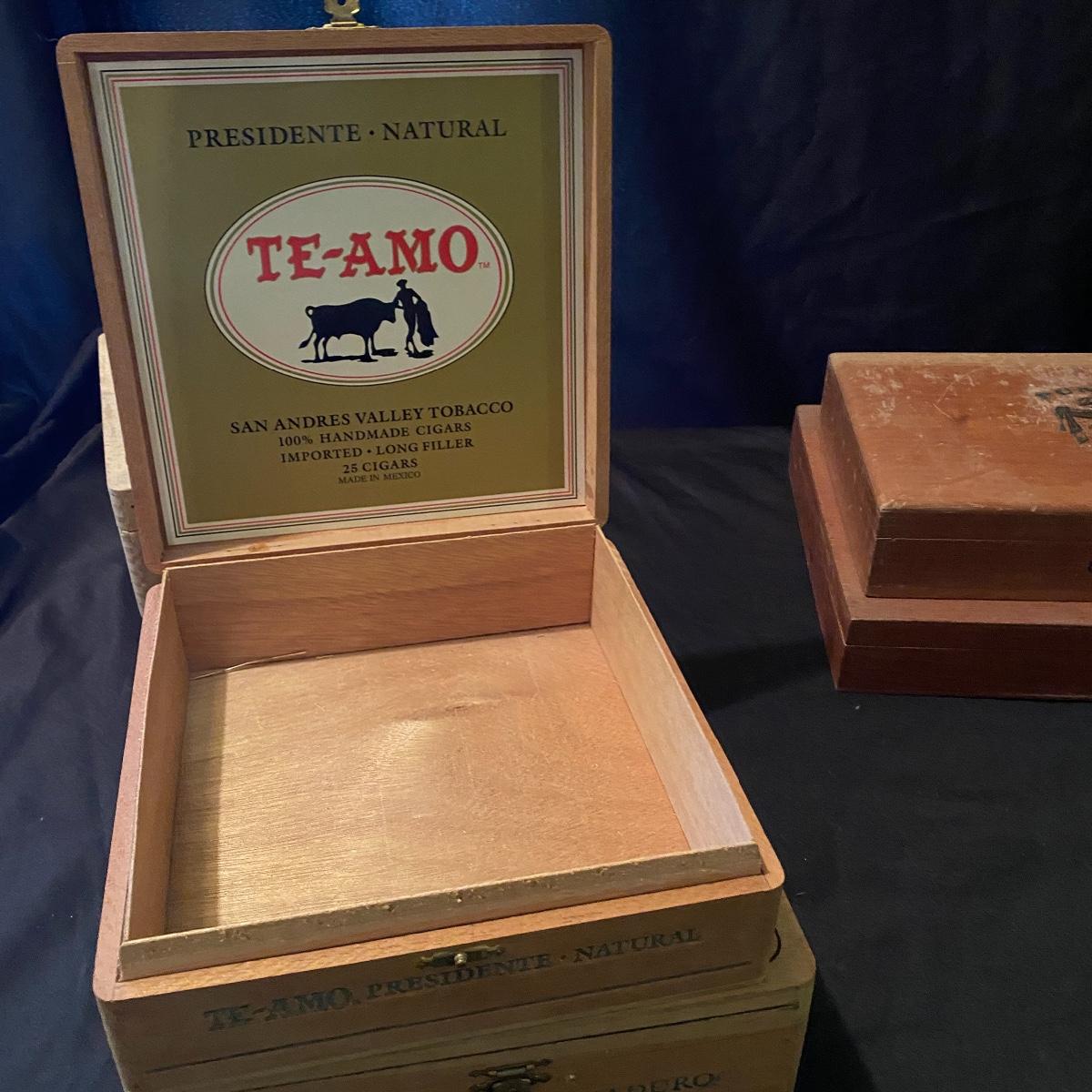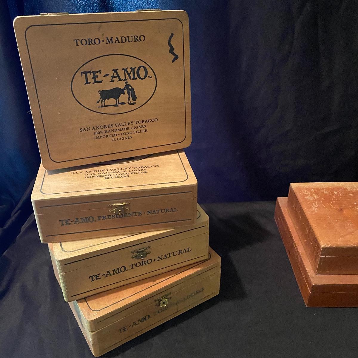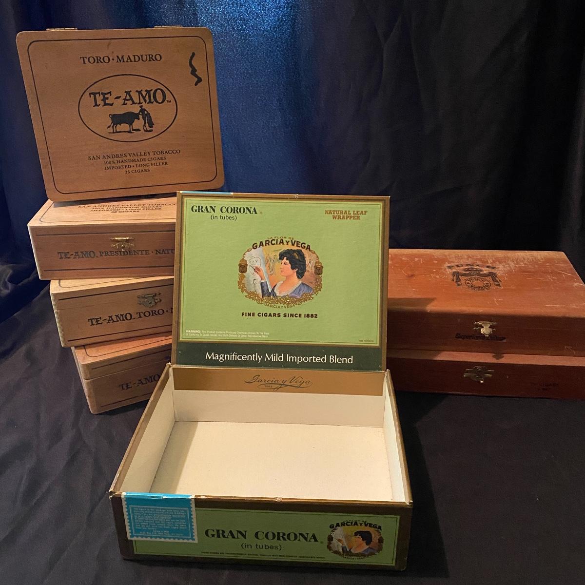 What a better way to store stuff than a creative cigar box. These are from all over the world. There are 6 wooden boxes and one green cardboard box. (9” x 7.5” x 3” tall) Four identical boxes in the mix. (Each measure 8” x 7.5” x 2.5” tall). Shipping available.
