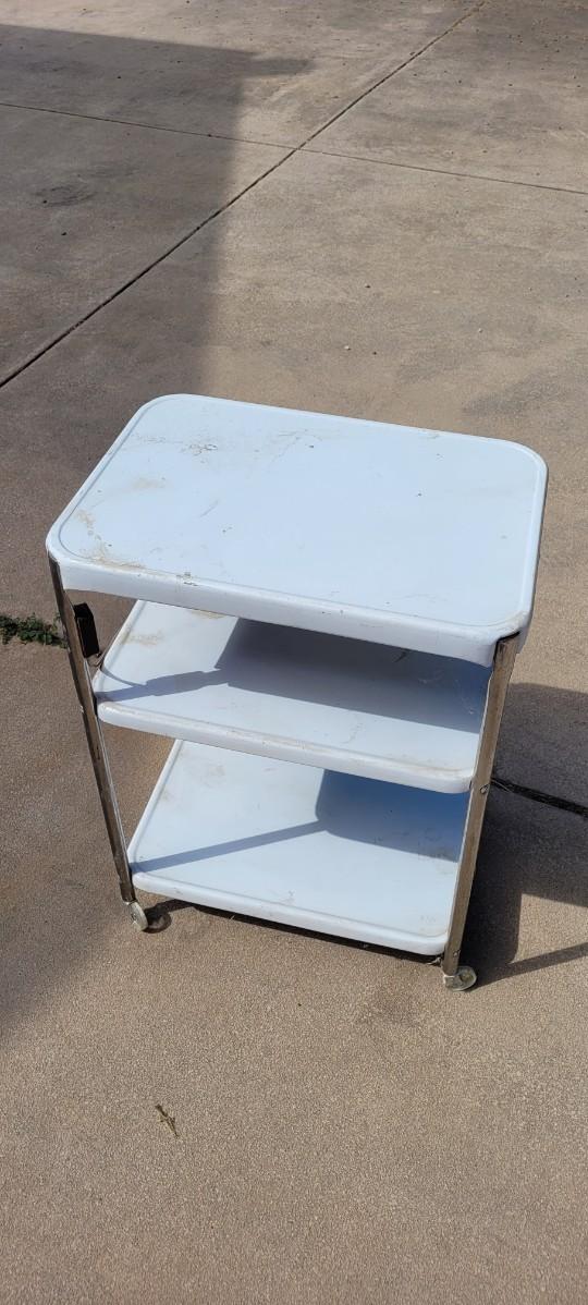 Nice condition Mid Century Modern White Storage Cart with Power Source. A soft touch with a Magic Eraser and some Warm Soapy Water would do wonders to bring this cart back to life.