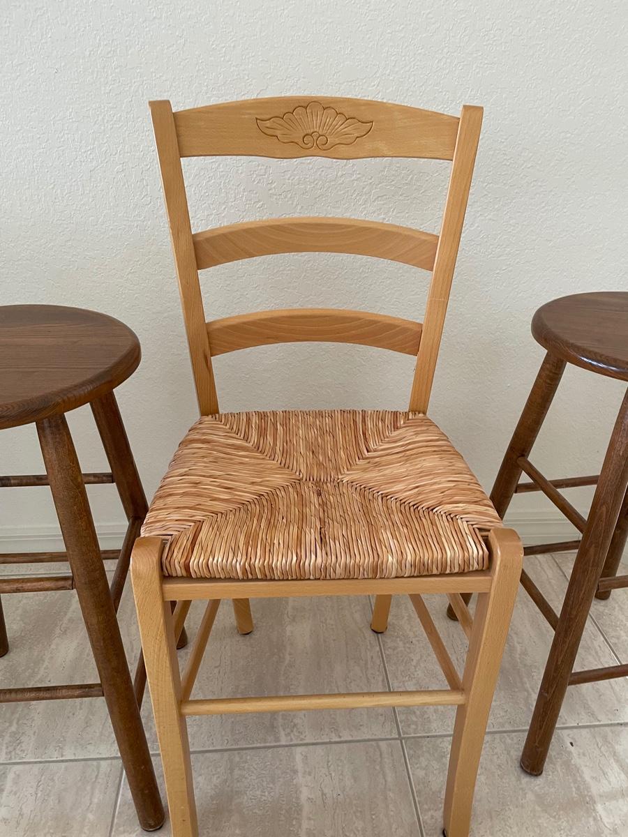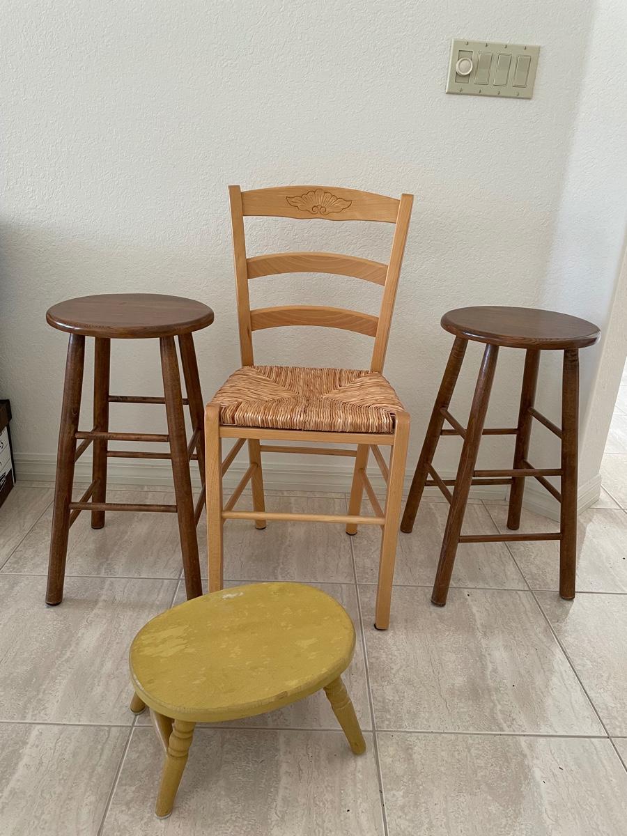 Pair of wooden barstools, foot stool and a desk or kitchen chair with a woven rush seat