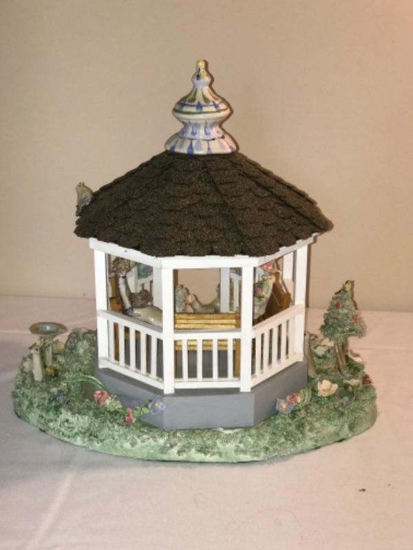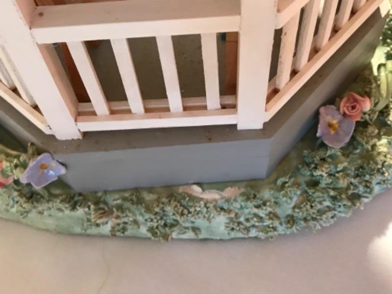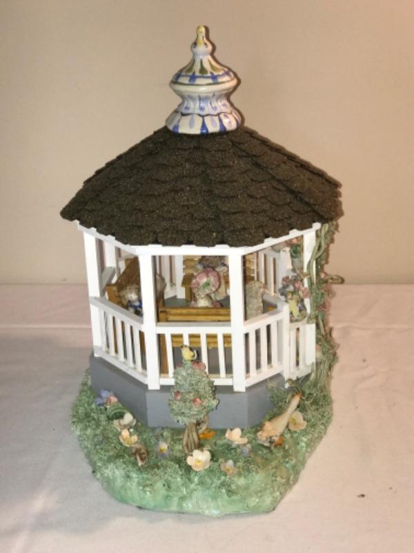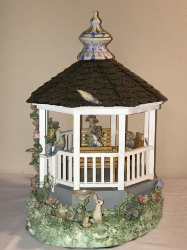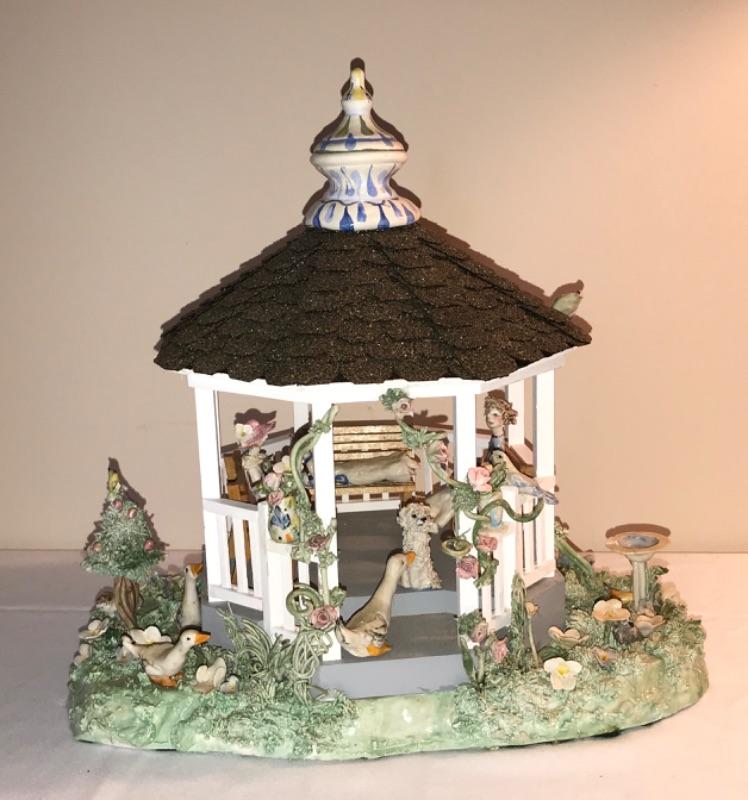 Gazebo is made of wood. Base, figurines and animals are ceramic , handmade and hand painted. Measures approximately 13-1/2” tall and 14” wide. Has a small chip(see pictures) and will need to be re-glued to base. Believed to be made by artist/maker JSP . Matches with other items made by artist/maker JSP but does not have a signature