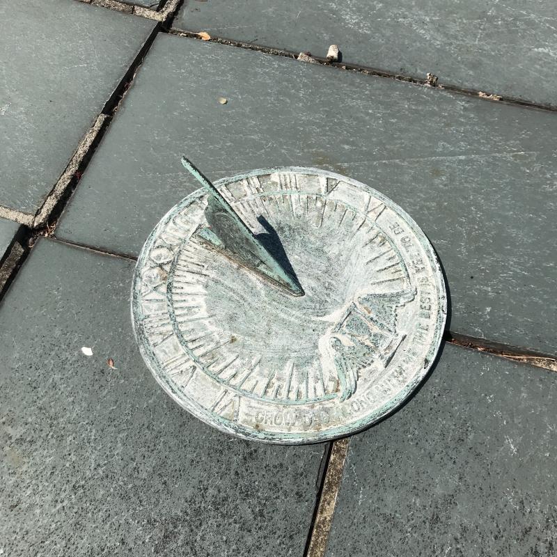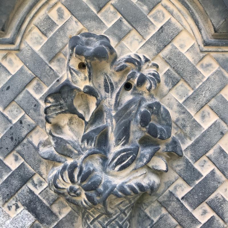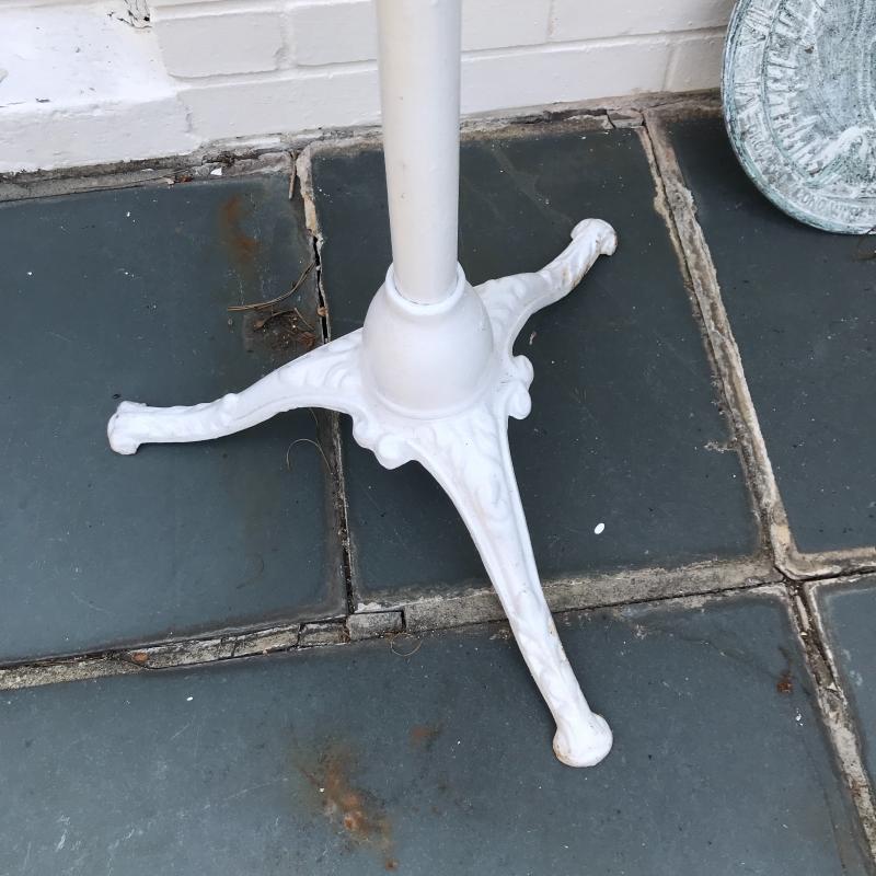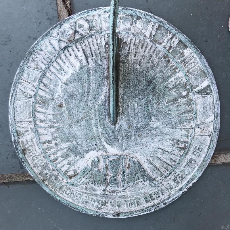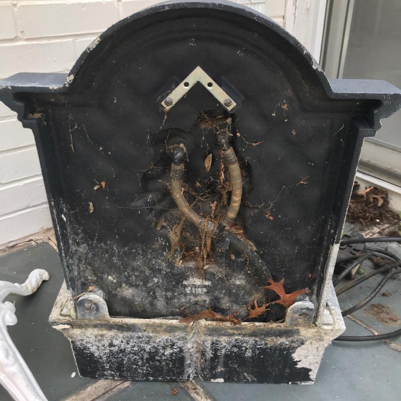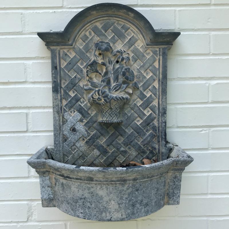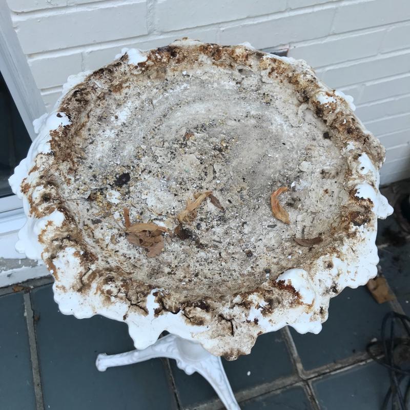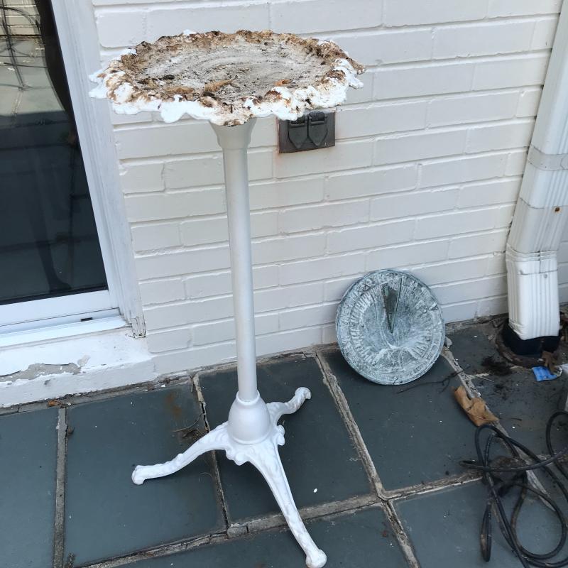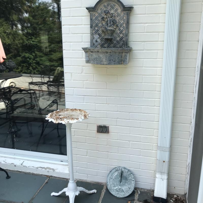 Wall fountain can hang on wall but will need a plug for pump. Cords are included but likely will need some work to make functional. Measures 15.5” x 10” x 21”h. Painted white metal birdbath is adorable and the perfect size for a garden accent. Measure 14”d x 33”h. Sundial is 10.5”d. A bit hard to read the numbers on it. No shipping.