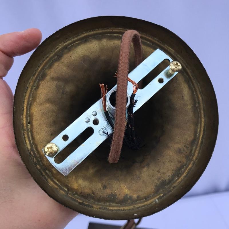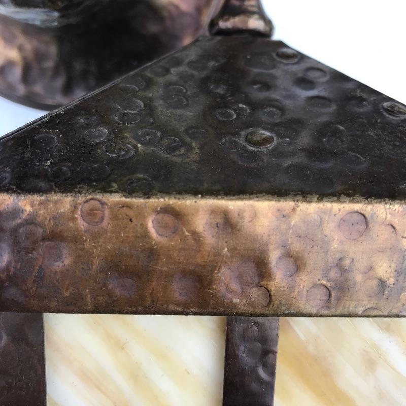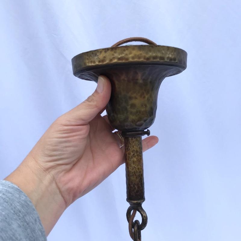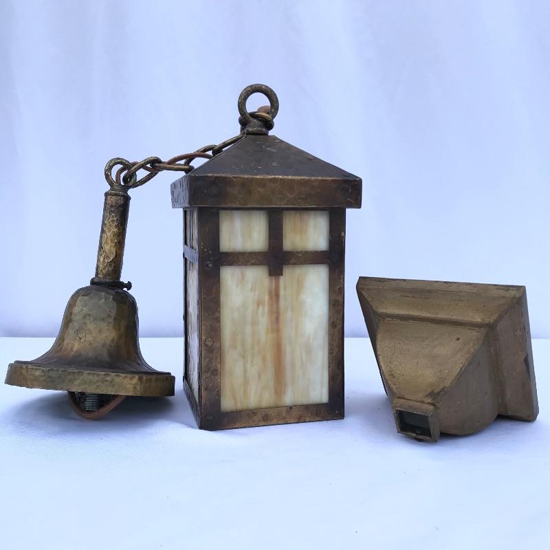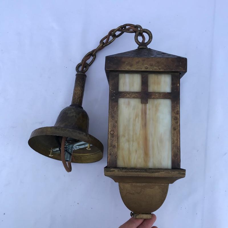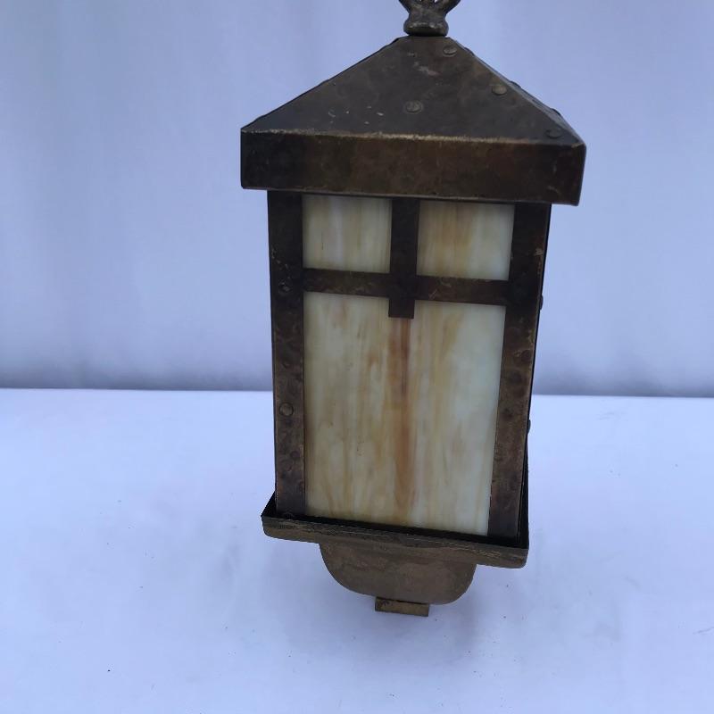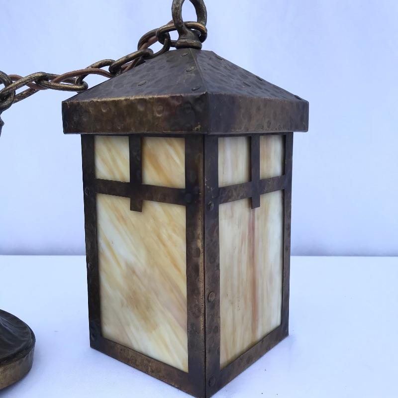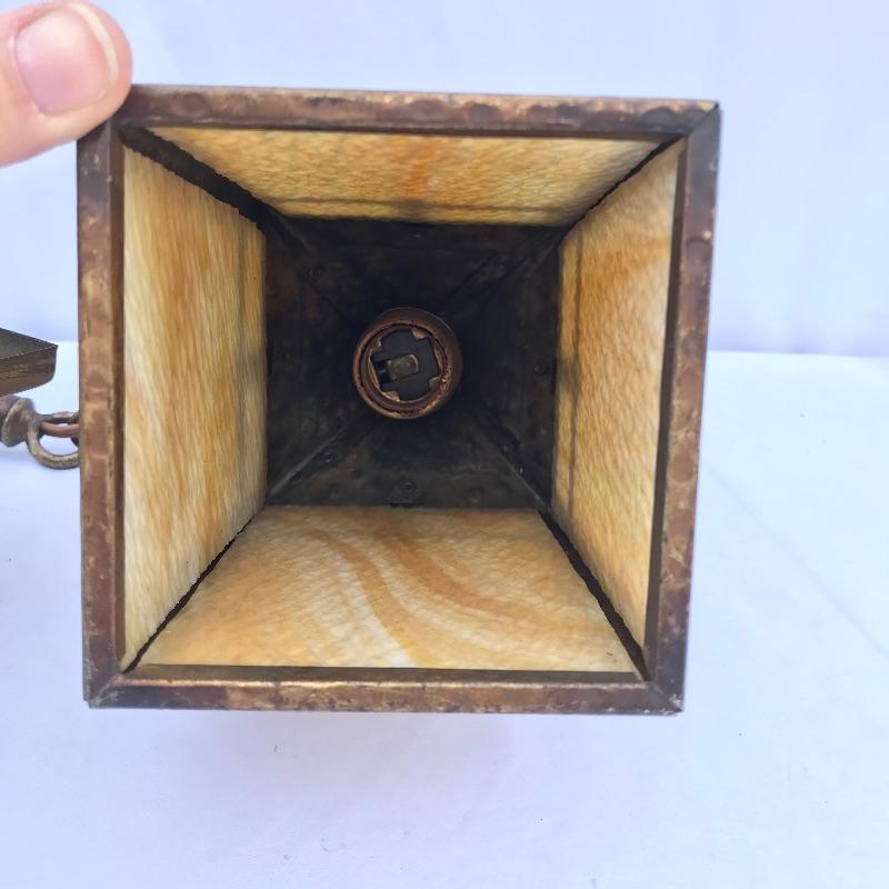 Beautiful amber colored leaded glass with mission style lantern frame. Piece has a vintage electric cord and somewhat primitive style hammered texture. Metal is a bronze color and piece is quite breathtaking. Lantern was housed in a box with either a top or base whose color complements the pendant light, but does not appear to be a missing piece to the pendant. Lantern measures 4.75”sq x 9.5” with the mount and chain, add another 13”. See photos.