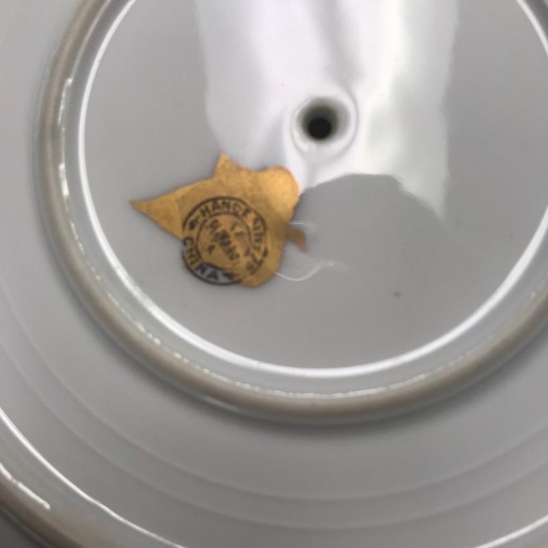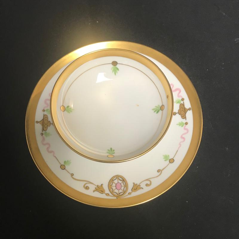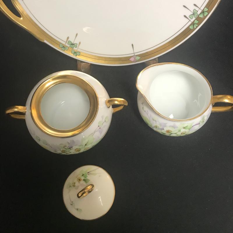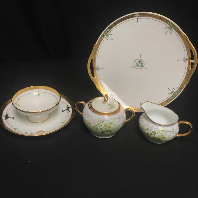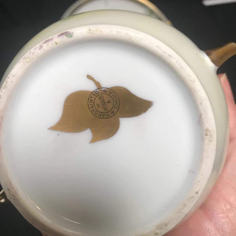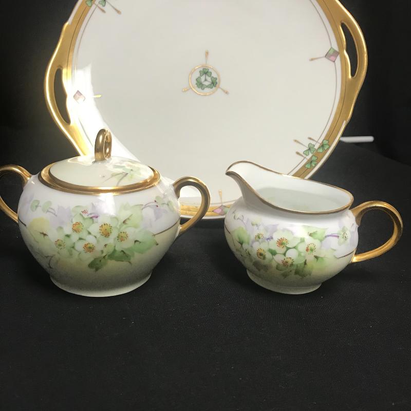 4 pieces of hand painted Picard China to include handled plate measuring 10.5” diameter, a footed dish with saucer attached and a cream and sugar set. Shipping available.