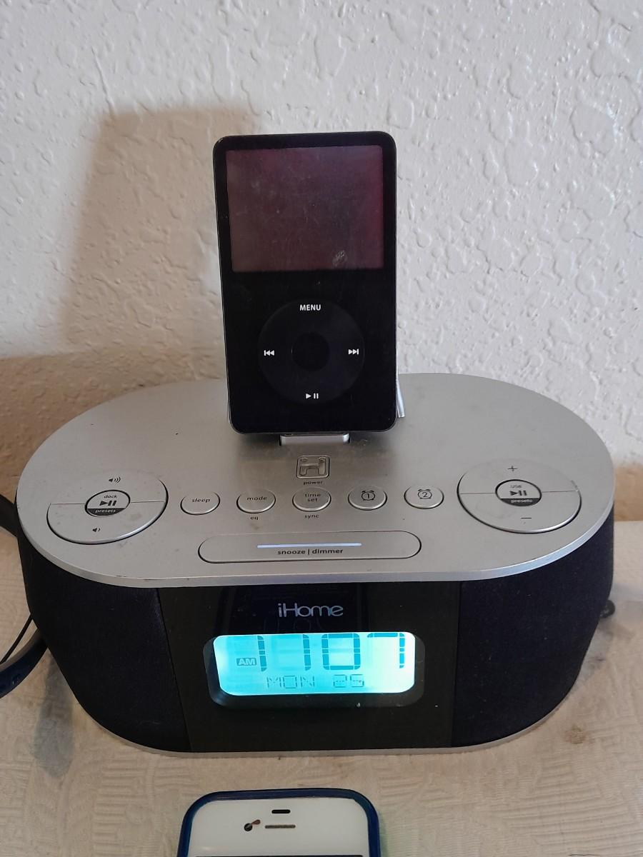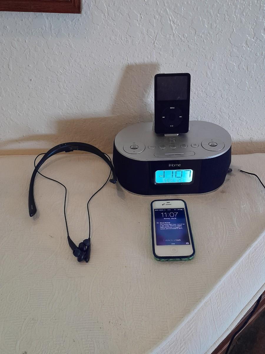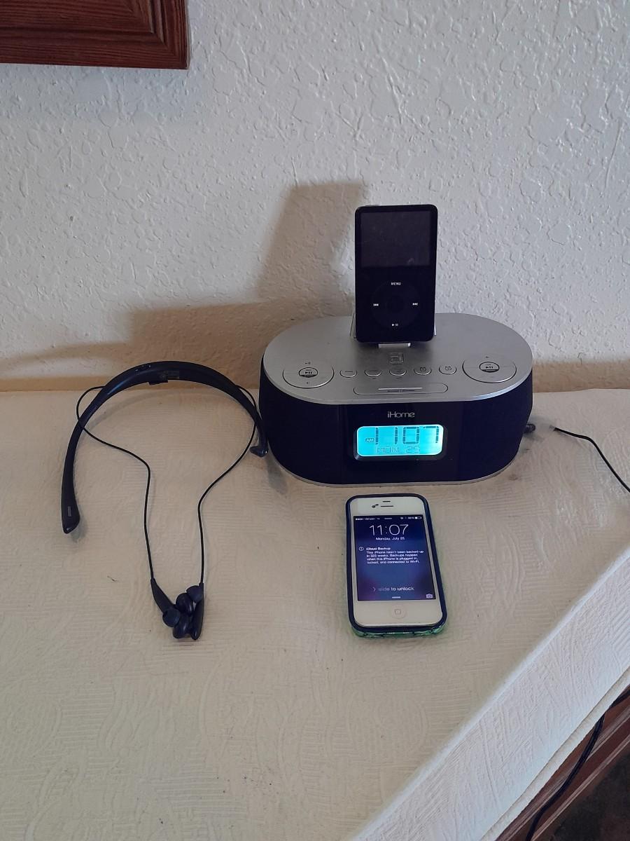 IHOME RADIO WITH IPOD AND I PHONE I PHONE IS PASSWORD LOCKED, HAS CRACK ON BACK BUT WORKS! COMES WITH CORDLESS HEADPHONES.