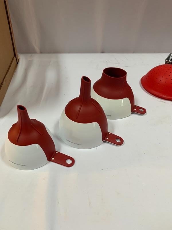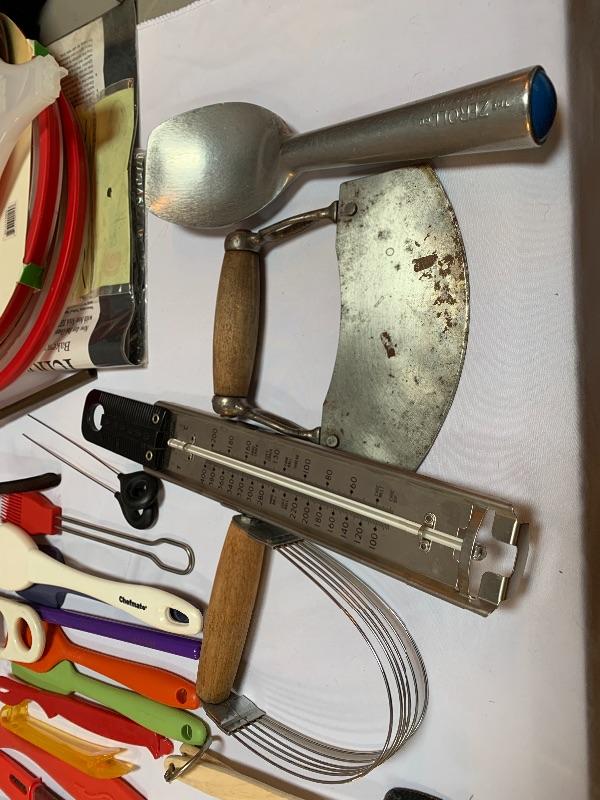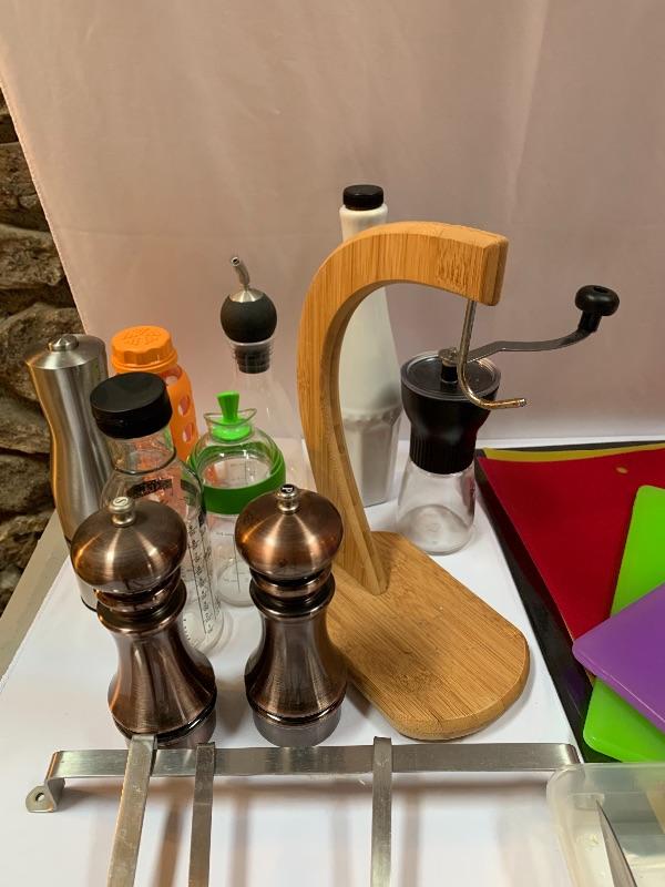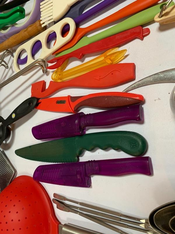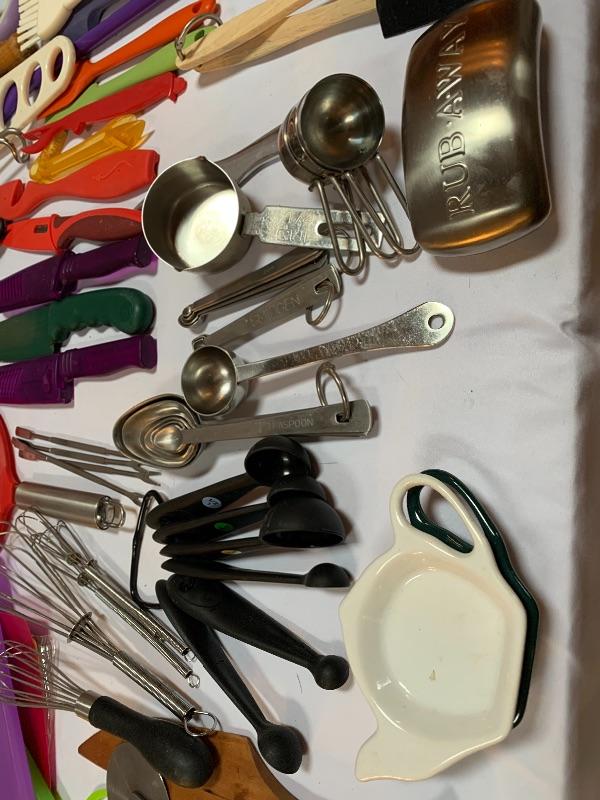 This lot has colorful, stainless, and every style in between of any kitchen gadget you may need. Salt and Pepper grinders, banana stand, whisks, knives, measuring devices, funnels, collapsable and nesting strainers, plastic cutting boards and so much more. See photos. Local pick up only.