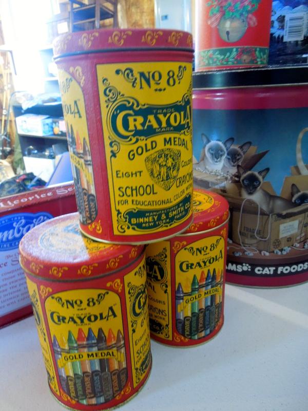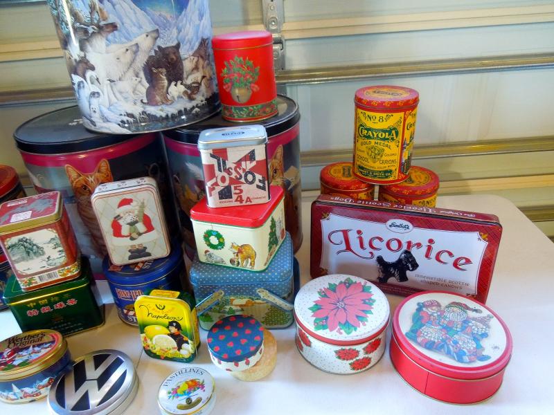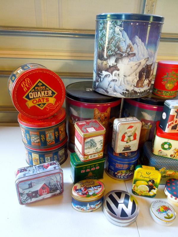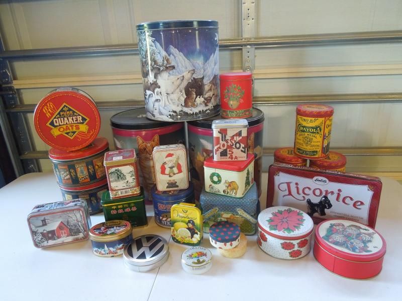These tins are all clean and very few are scratched. Most are like new. Crayola; Quaker Oats; Iams; Licorice; Christmas Cookie tins; King Leo; Napoleon, VW, etc. All vintage tins are reproductions.
