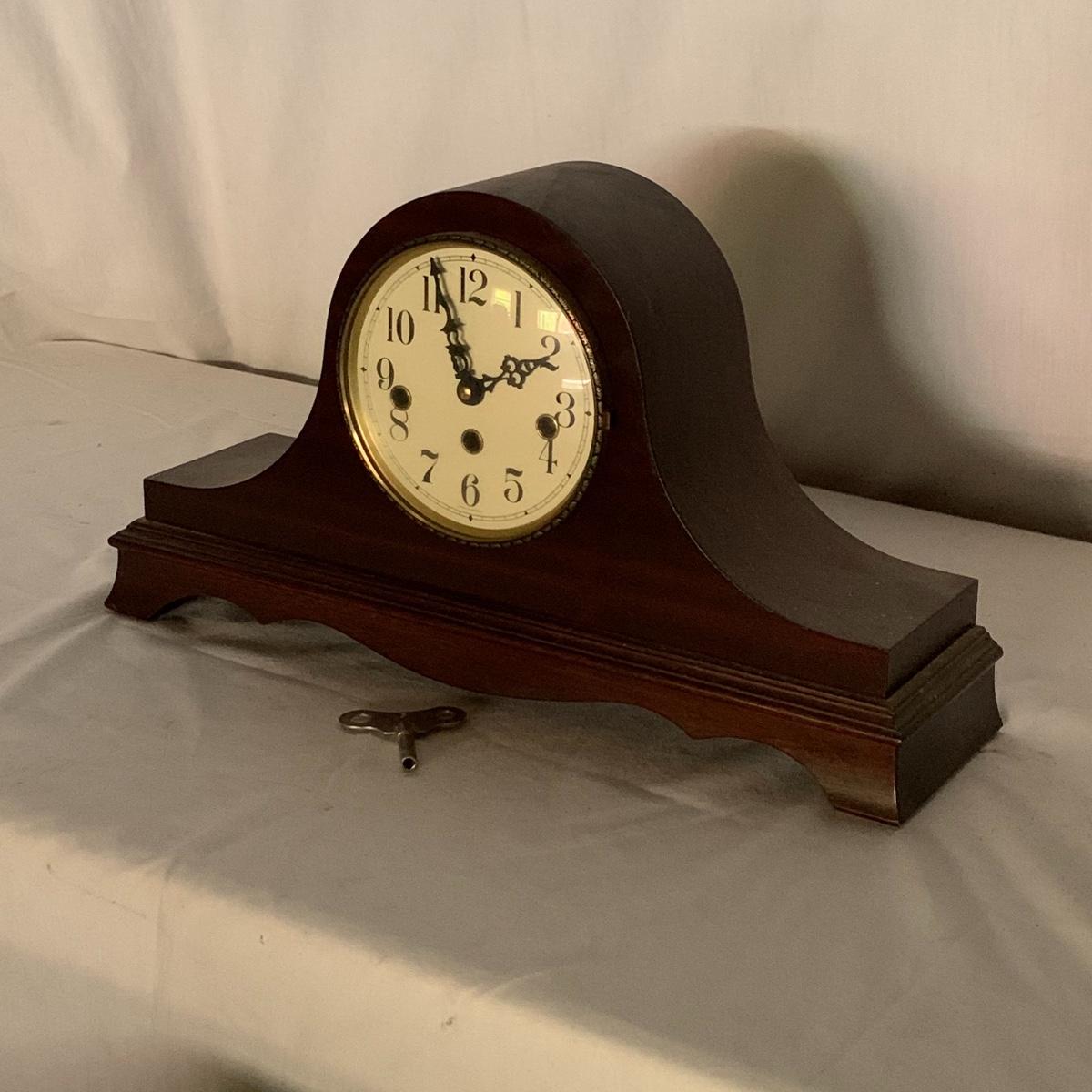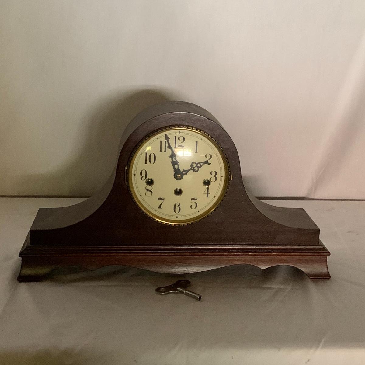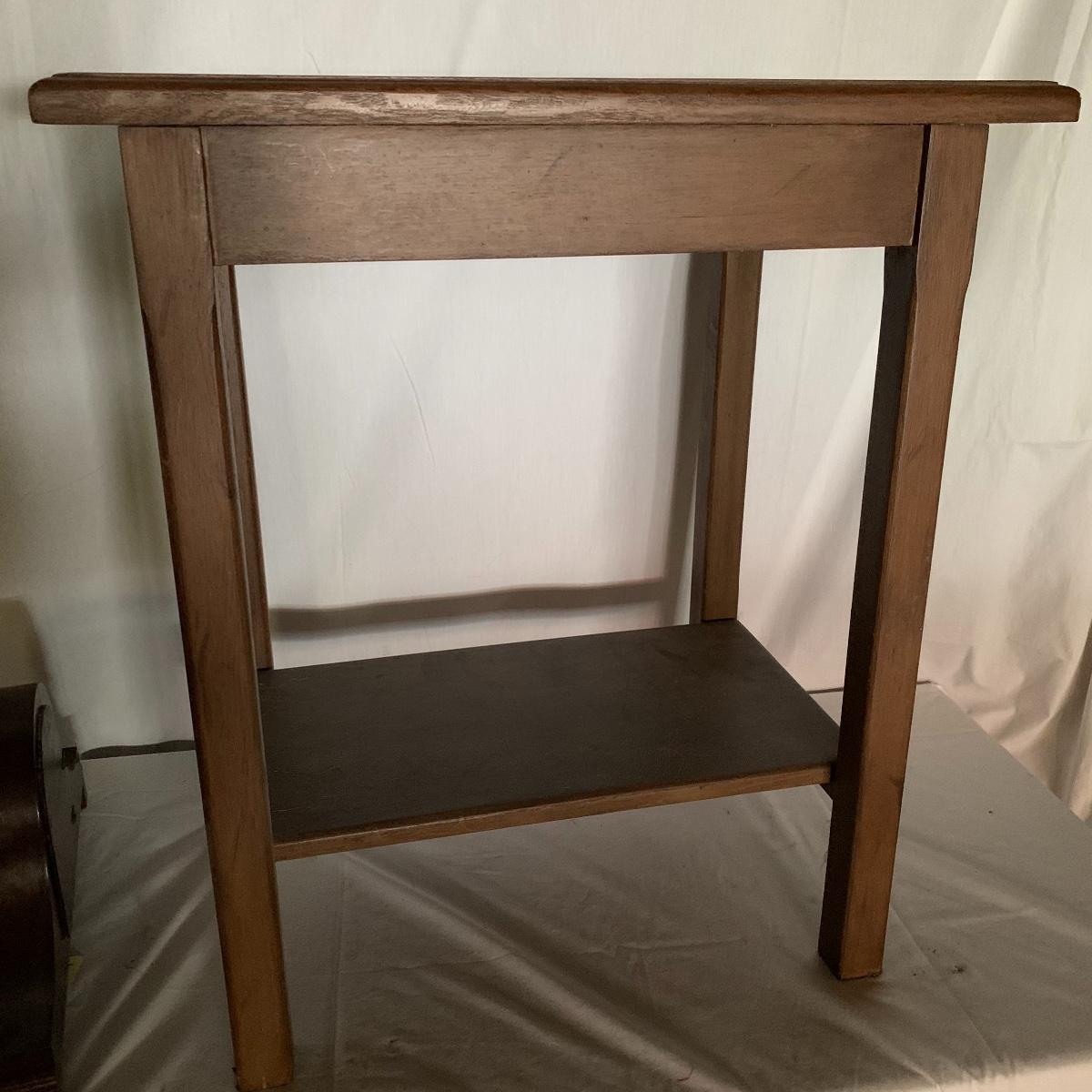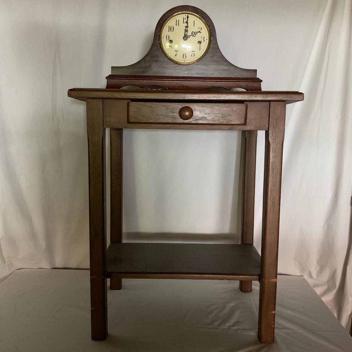 This is a lovely mantle clock and side table. The mantle clock is made of wood. It has a key to wind it. It winds and ticks. A brand name cannot be seen, but it does state that it was made in Germany. It measures 18” x 5” x 10”. The side table is also made from wood. It has one small drawer and a shelf. It shows some wear, but is in very good condition. It measures 24” x 18.5” x 28.25”. Local pickup only.